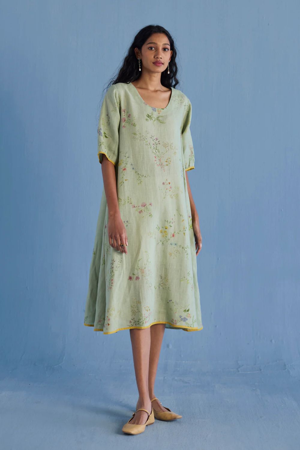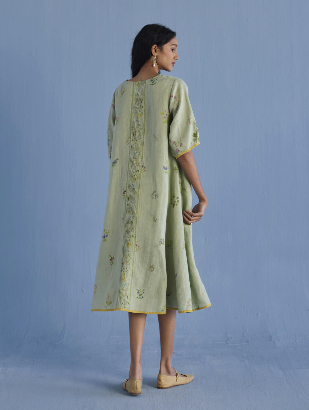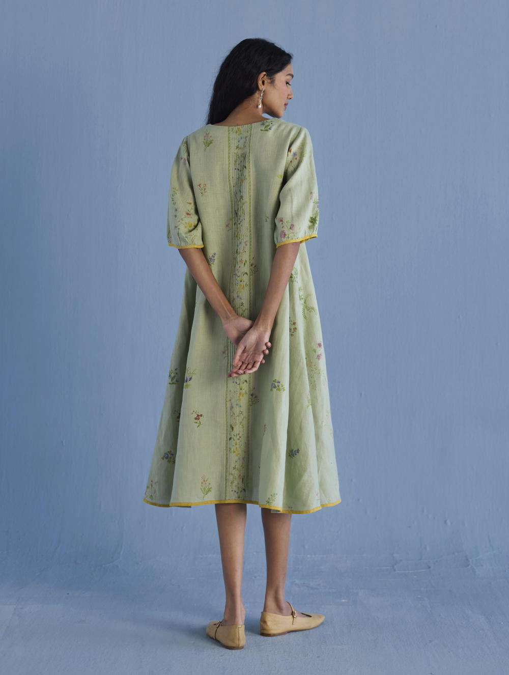 An A-line floral printed dress handcrafted in our signature yarn-dyed linen in two hand-painted prints - a jaal floral print and a buta (motif) floral print. The Nami is designed with comfortable pockets, a printed floral border vertically placed at the back with intricate pintucks, and a pop coloured edge detail at the sleeve and bottom hem.