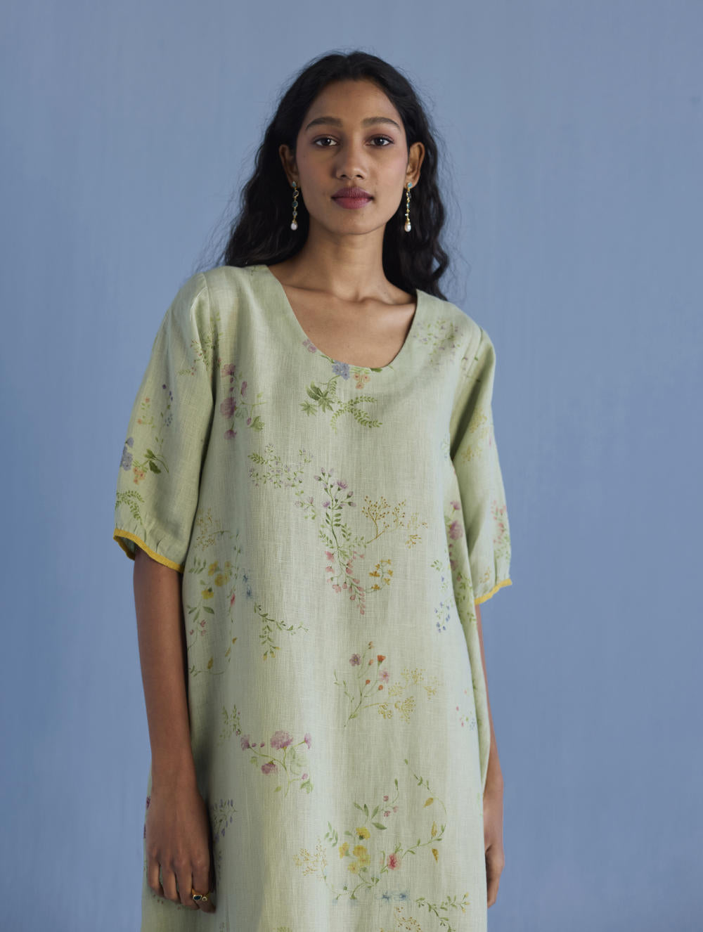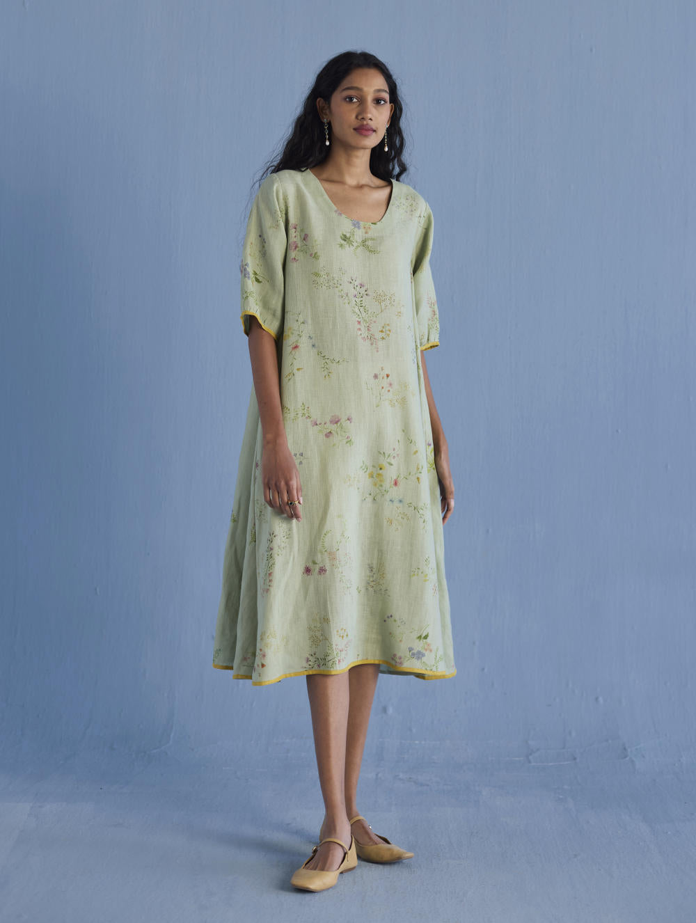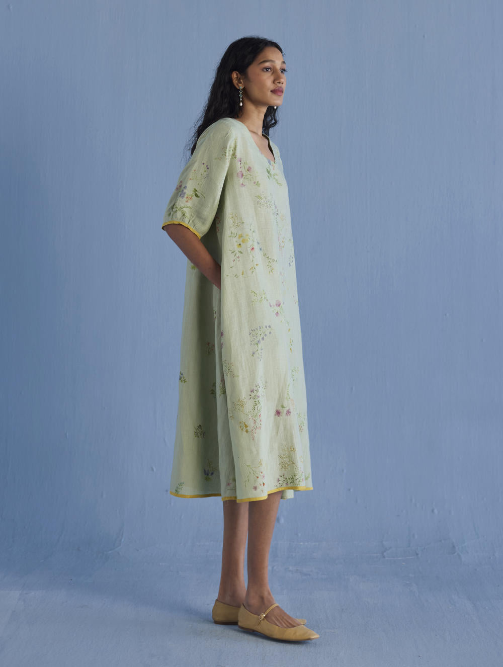 An A-line floral printed dress handcrafted in our signature yarn-dyed linen in two hand-painted prints - a jaal floral print and a buta (motif) floral print. The Nami is designed with comfortable pockets, a printed floral border vertically placed at the back with intricate pintucks, and a pop coloured edge detail at the sleeve and bottom hem.