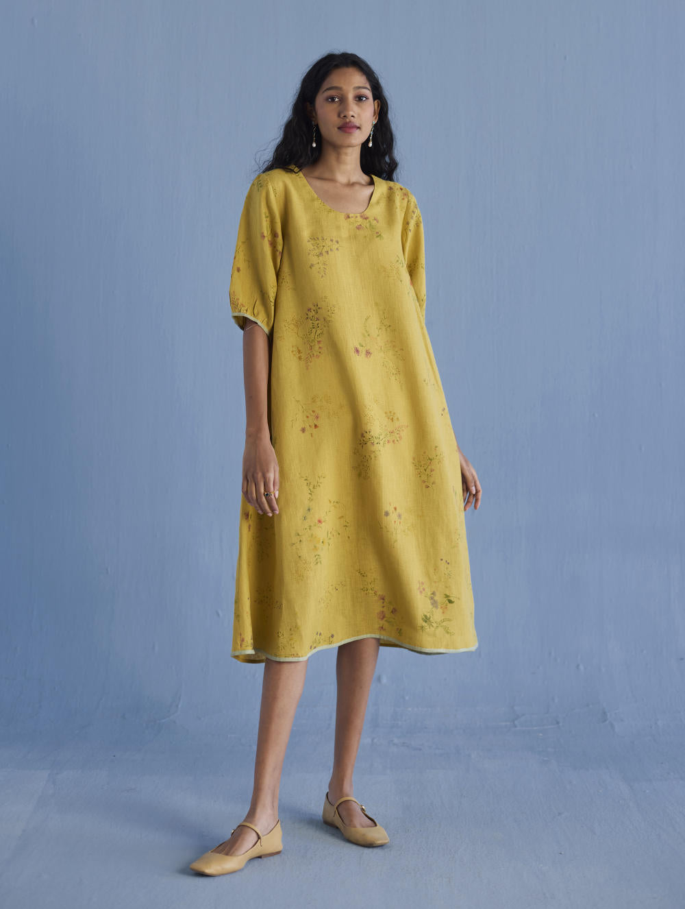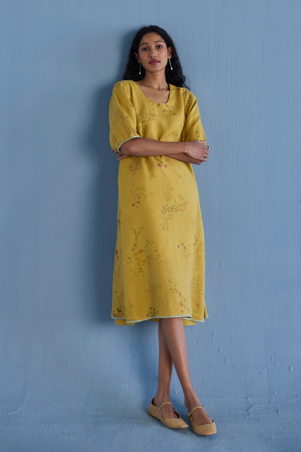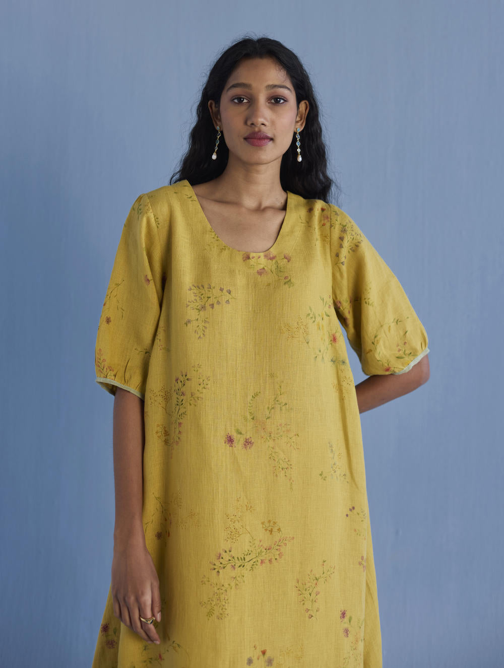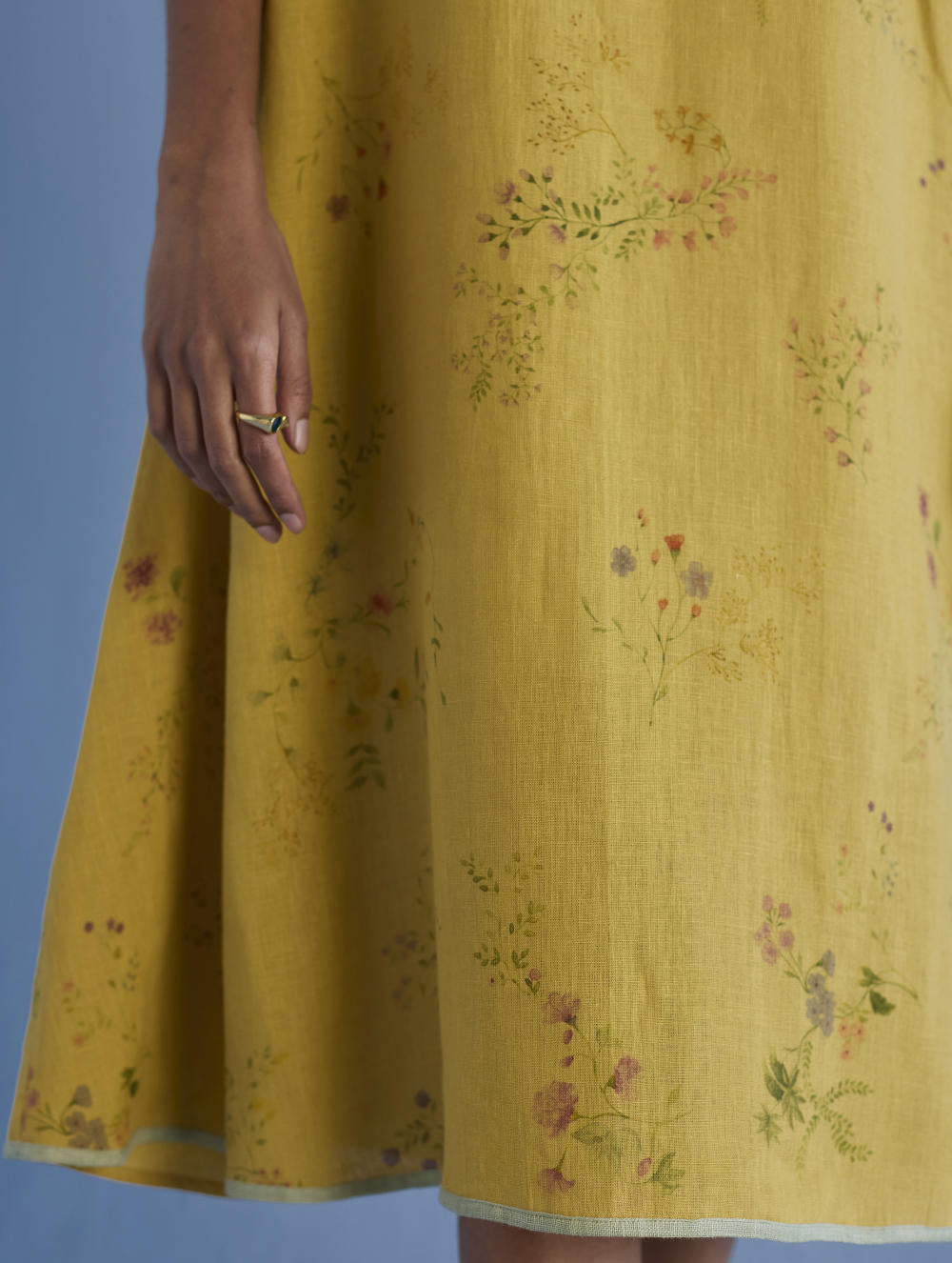 An A-line floral printed dress handcrafted in our signature yarn-dyed linen in two hand-painted prints - a jaal floral print and a buta (motif) floral print. The Nami is designed with comfortable pockets, a printed floral border vertically placed at the back with intricate pintucks, and a pop coloured edge detail at the sleeve and bottom hem.