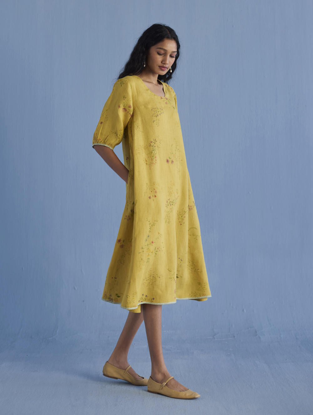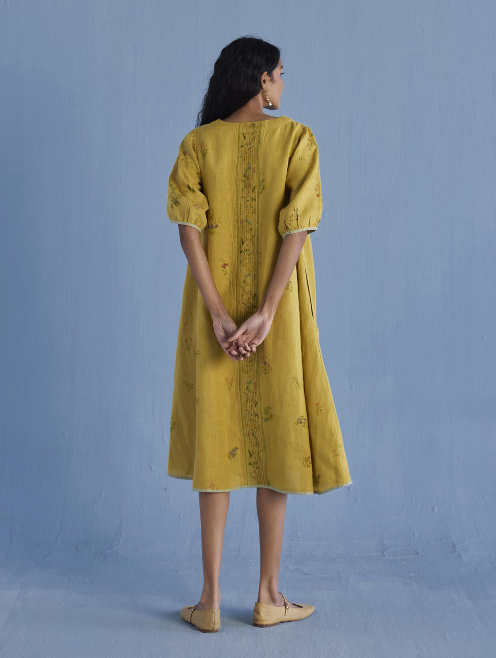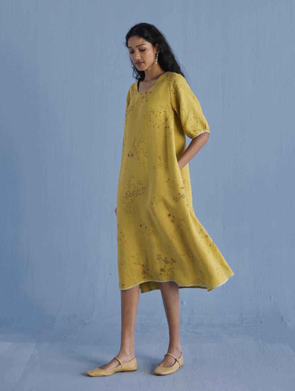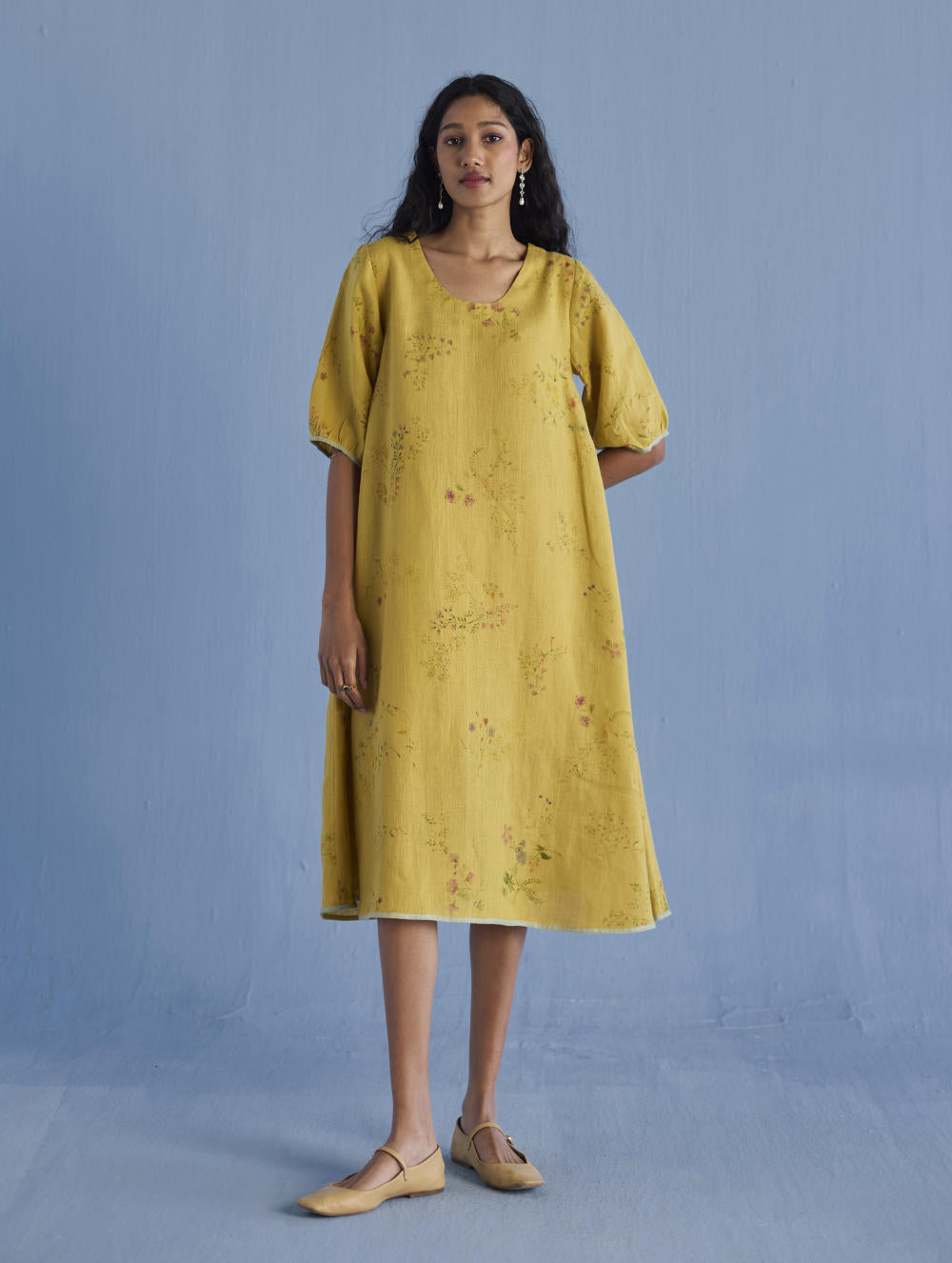 An A-line floral printed dress handcrafted in our signature yarn-dyed linen in two hand-painted prints - a jaal floral print and a buta (motif) floral print. The Nami is designed with comfortable pockets, a printed floral border vertically placed at the back with intricate pintucks, and a pop coloured edge detail at the sleeve and bottom hem.