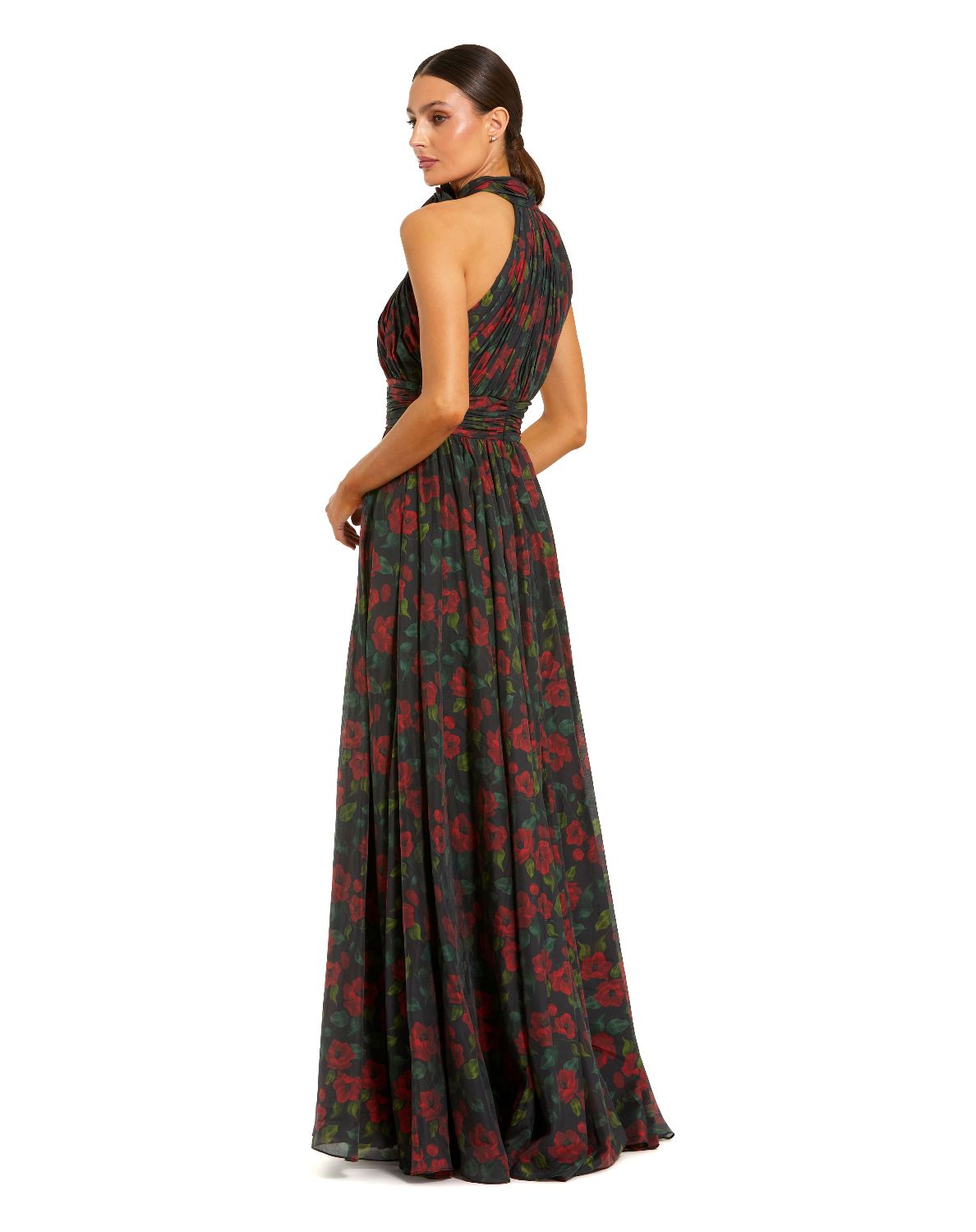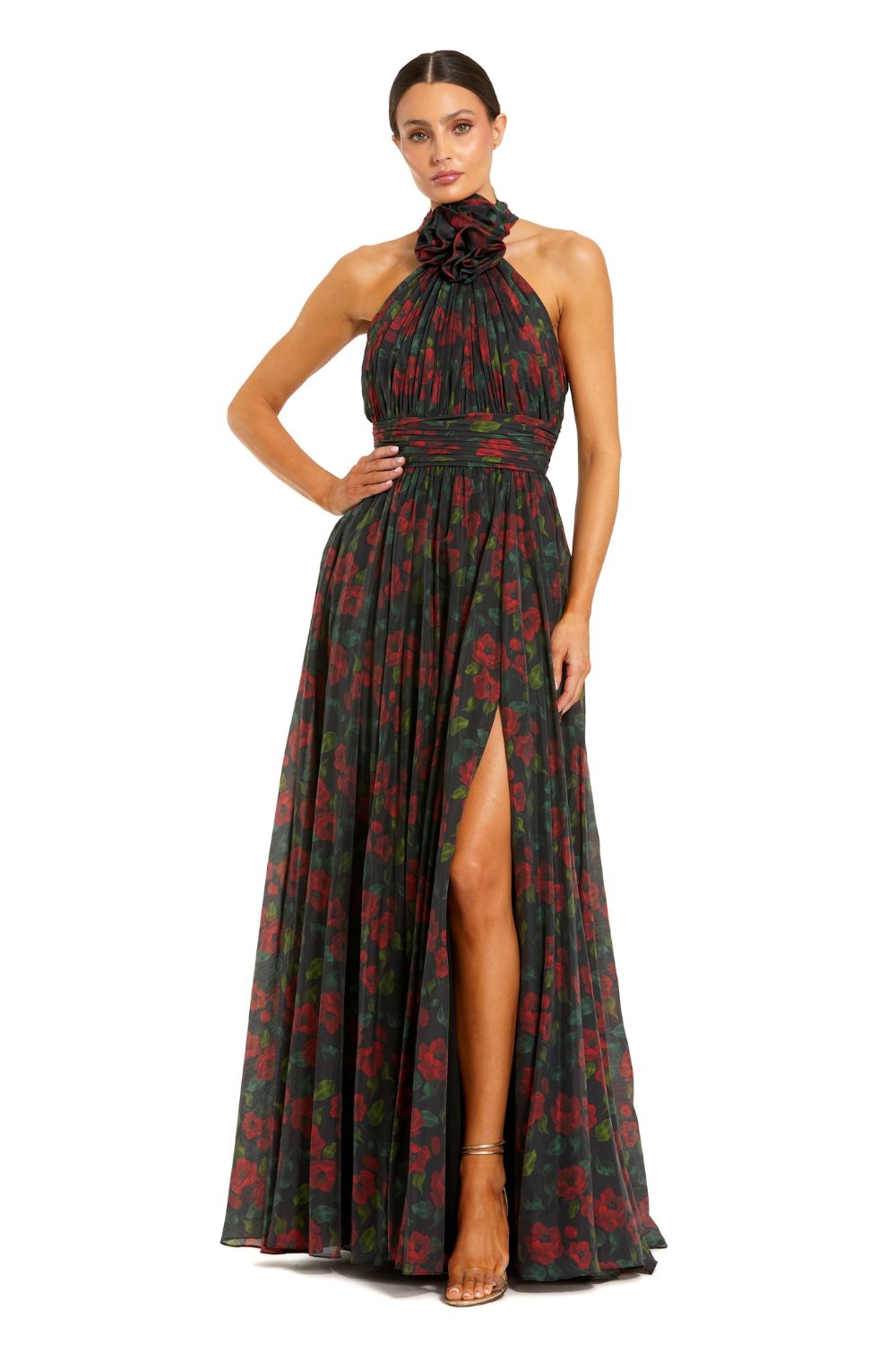 Black Floral Print Halter Neck Gown with Rosette Detail