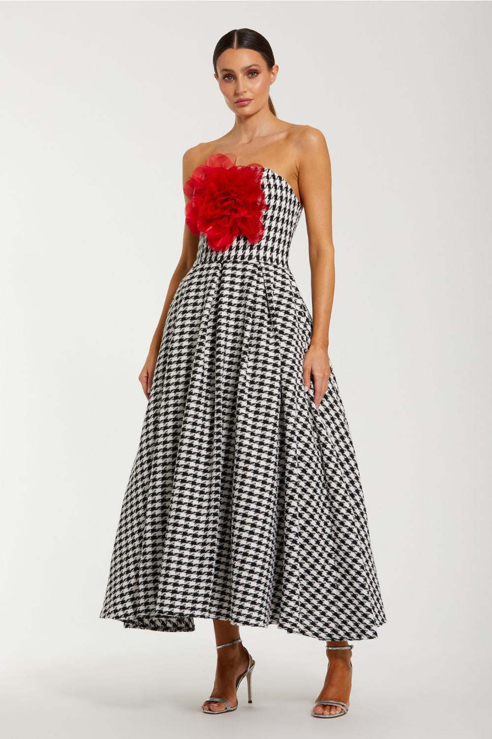 Black and White Strapless Boucle A Line Midi Dress With 3D Flower