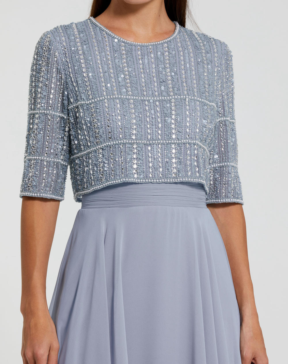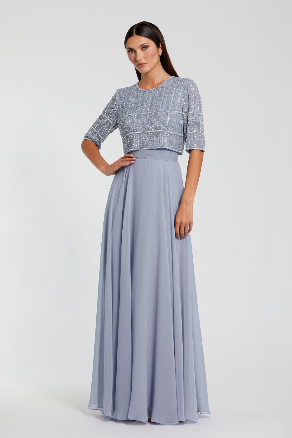 Chiffon Gown w/ Fully Beaded 1/4 Sleeve Top