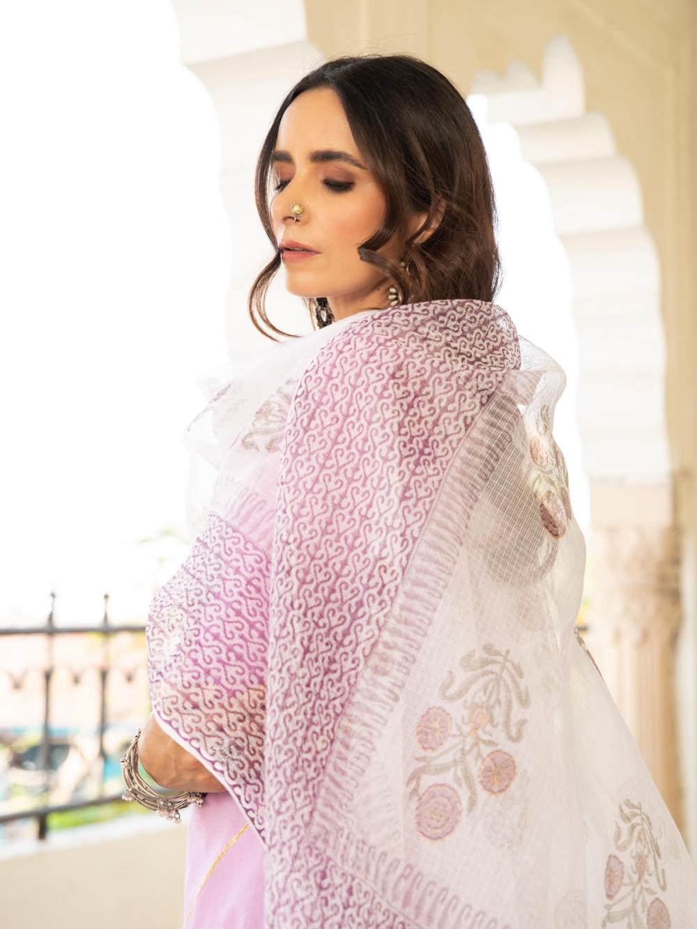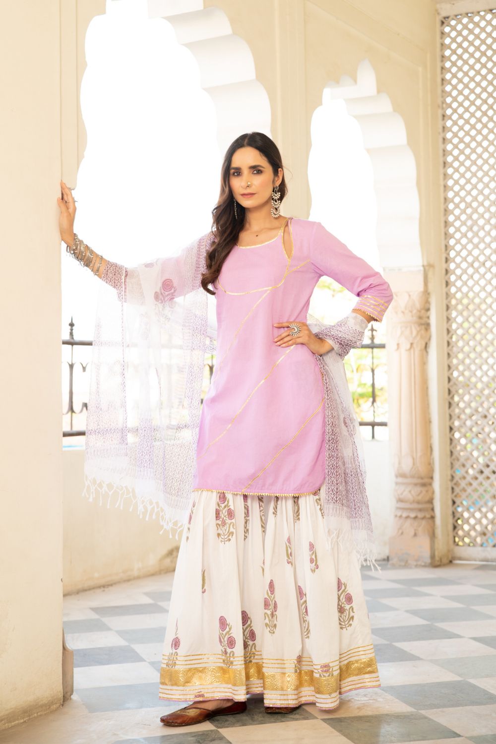 KURTA: A soft lavender handblock printed cotton kurta with gota dhari work. SHARARA: A cotton mughal block printed sharara in ivory with gota detailing. DUPATTA: Hand printed kota doria dupatta
