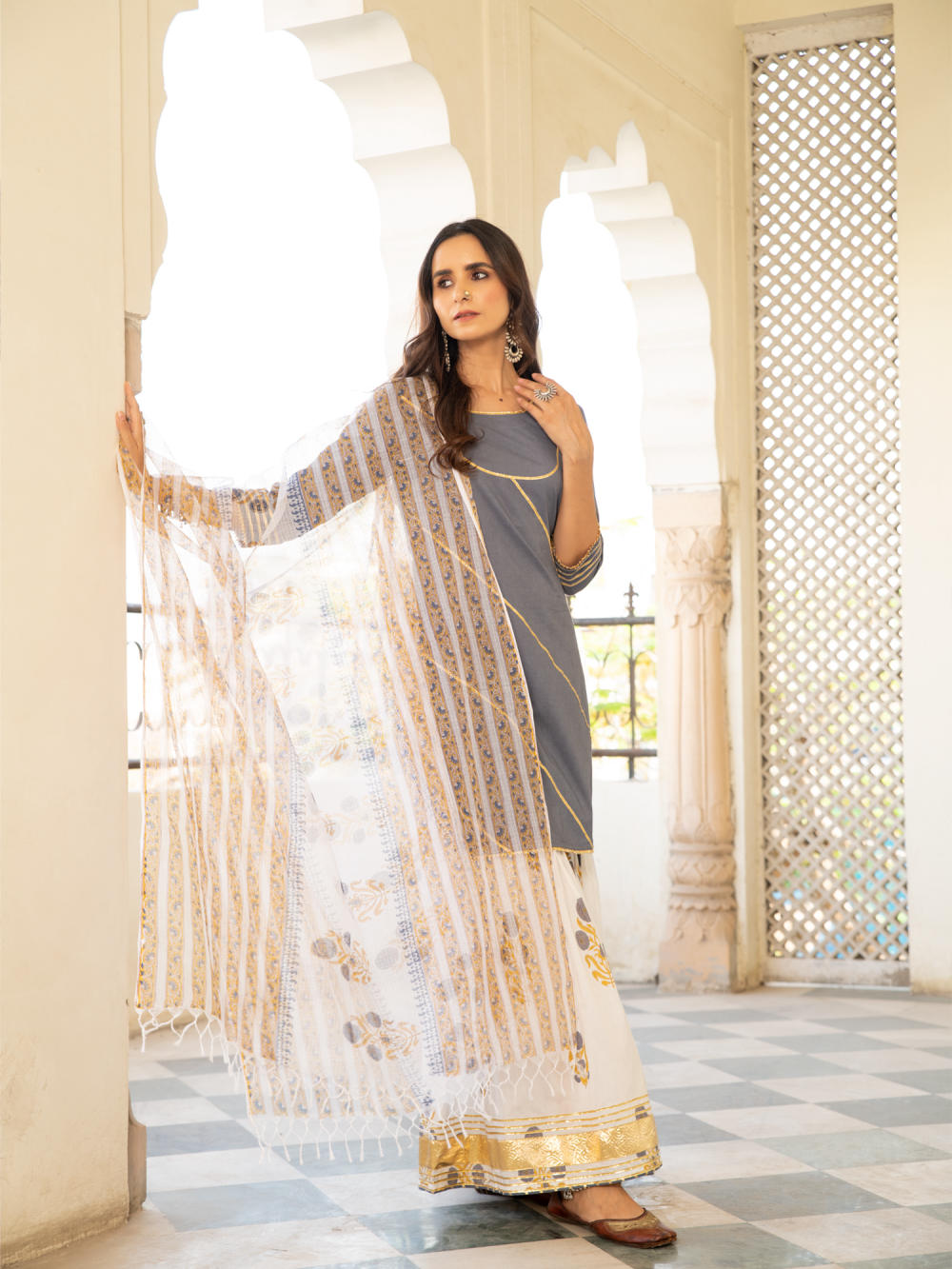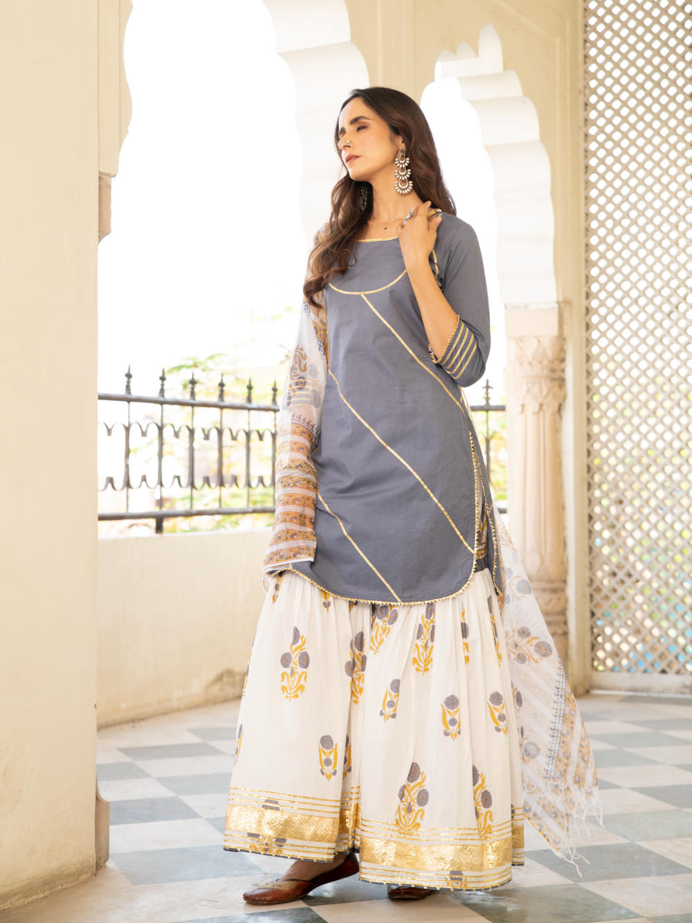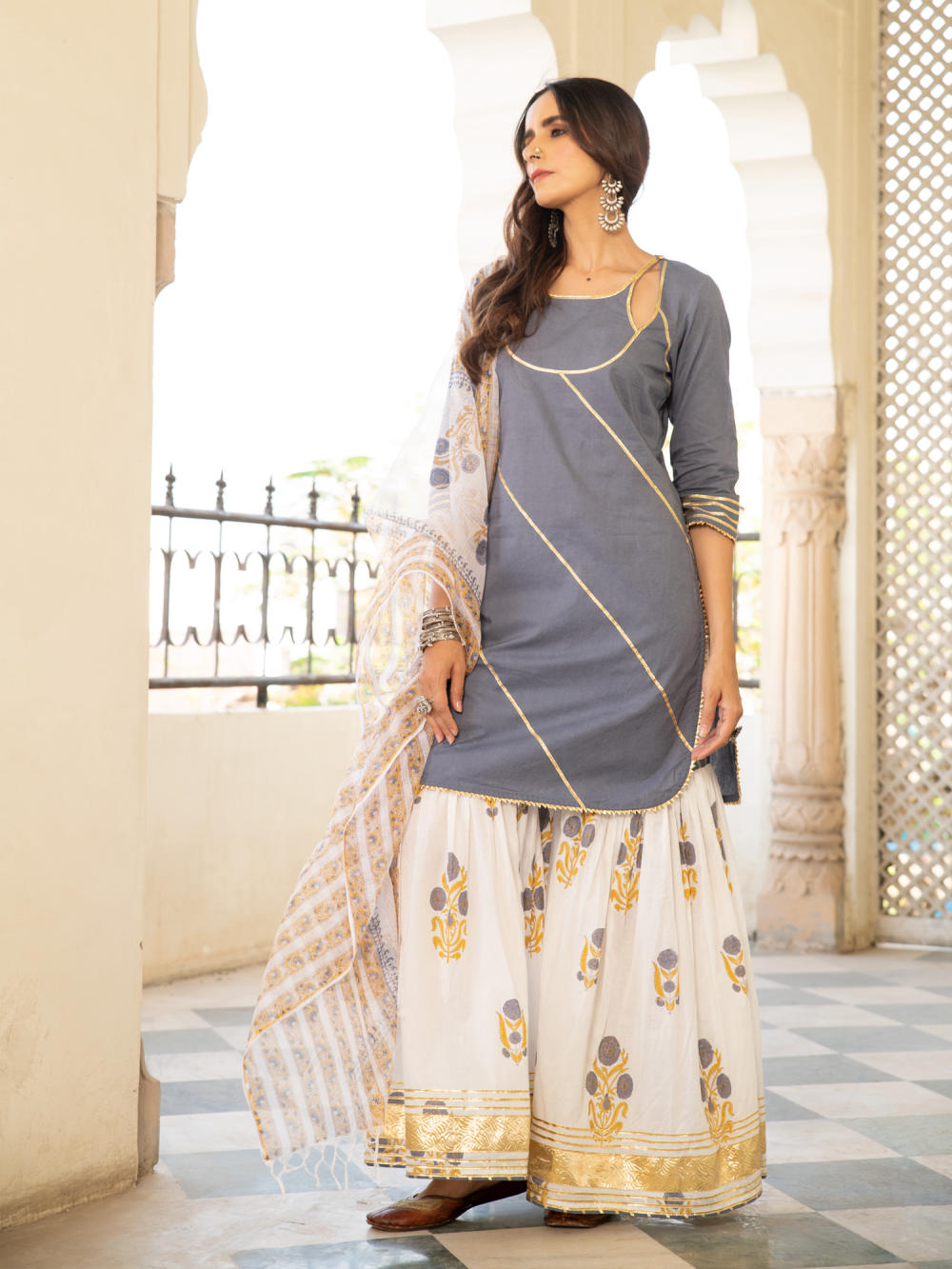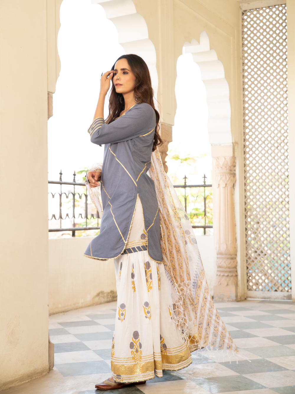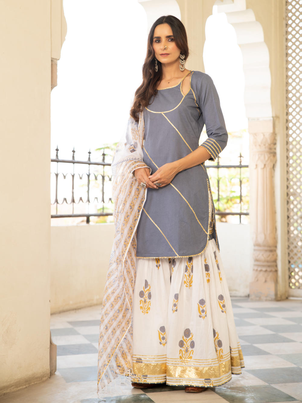 KURTA: A pastel grey handblock printed cotton kurta with gota dhari work. SHARARA: A cotton mughal block printed sharara in ivory with gota detailing. DUPATTA: Hand printed kota doria dupatta