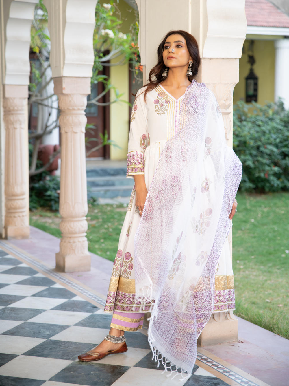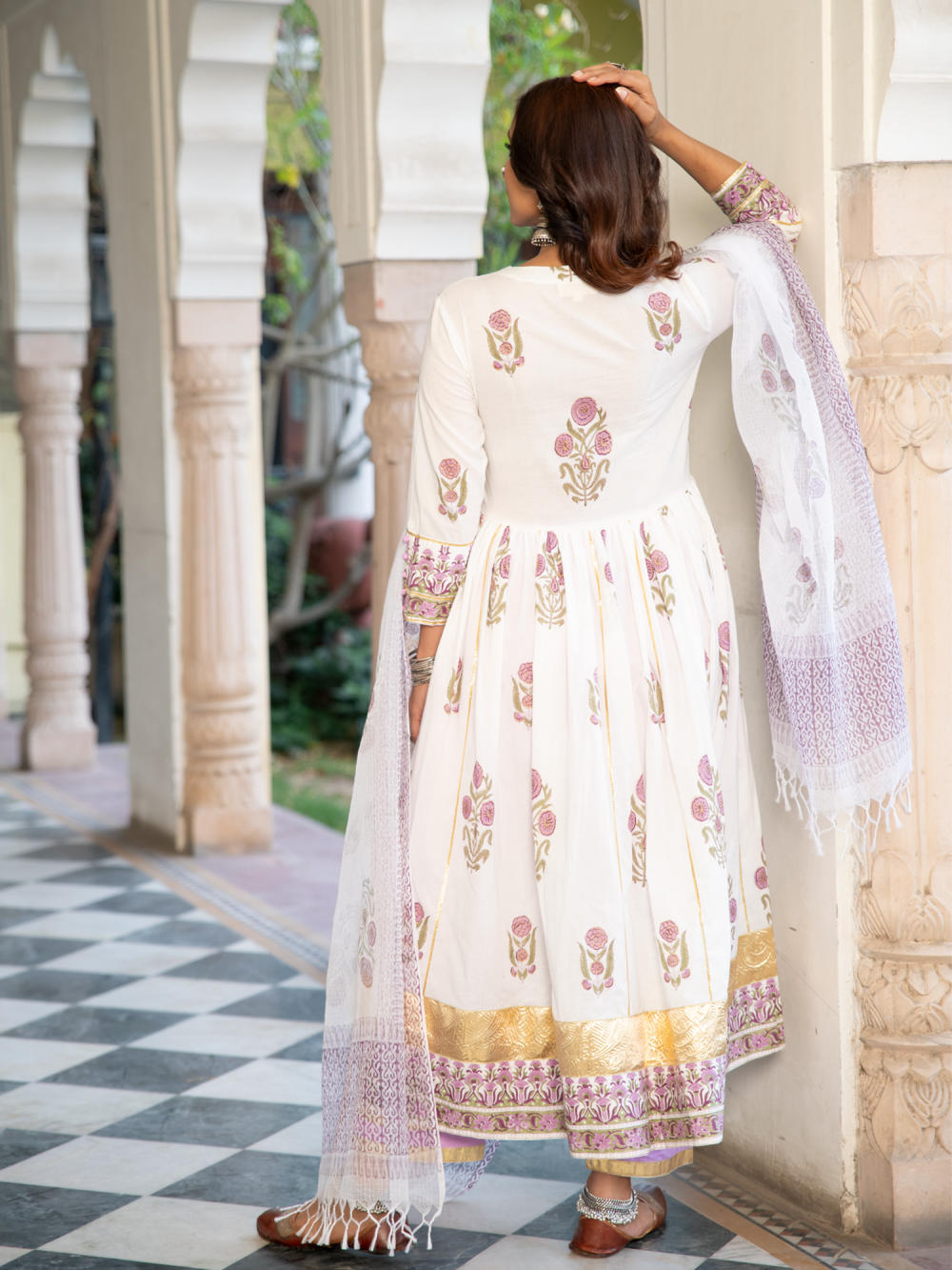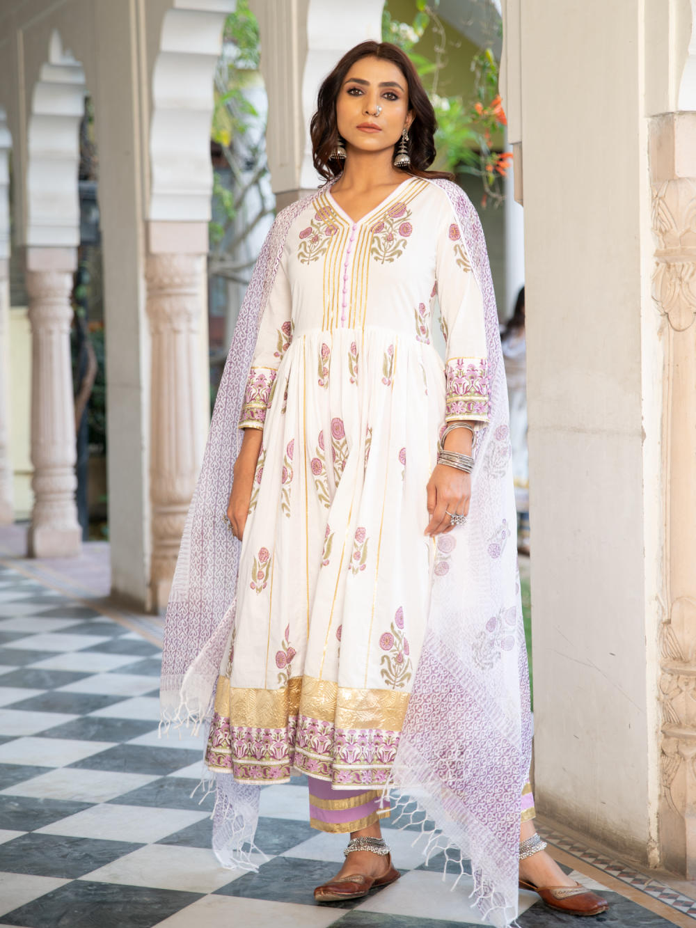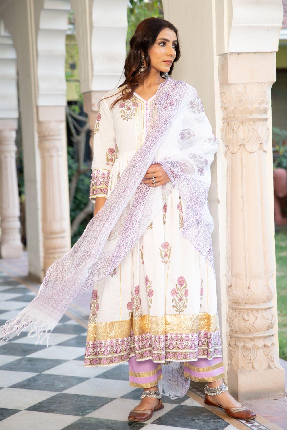 A poetic rendetion of a summer festive collection that makes you nostalgic, in classic luminous block prints. Handcrafted on a bed of fine cotton, mul and doria in hues of pastels. Perfect for light occasions. A set of 3 consists of kurta, staight pant & dupatta. KURTA: A gathered handprinted kurta with mughal buttas on an ivory base. Complete with gota detailing, hand made buttons and lampi work. PANTS: Combined with lavendar straight pants, detailed with gota highlights. DUPATTA: Handblock printed kota doria dupatta