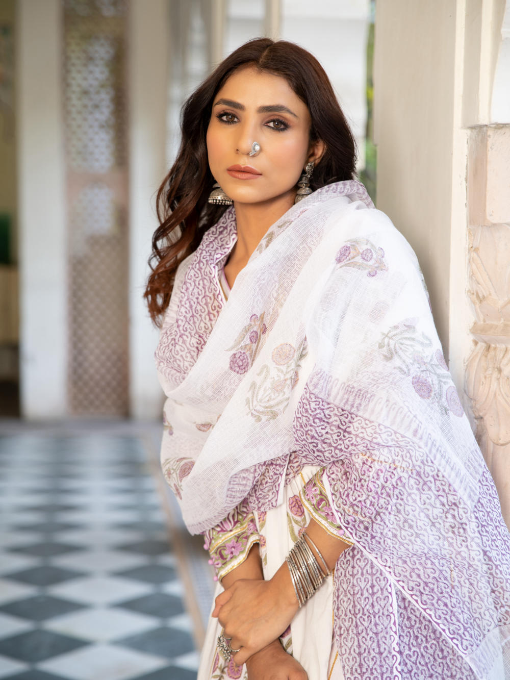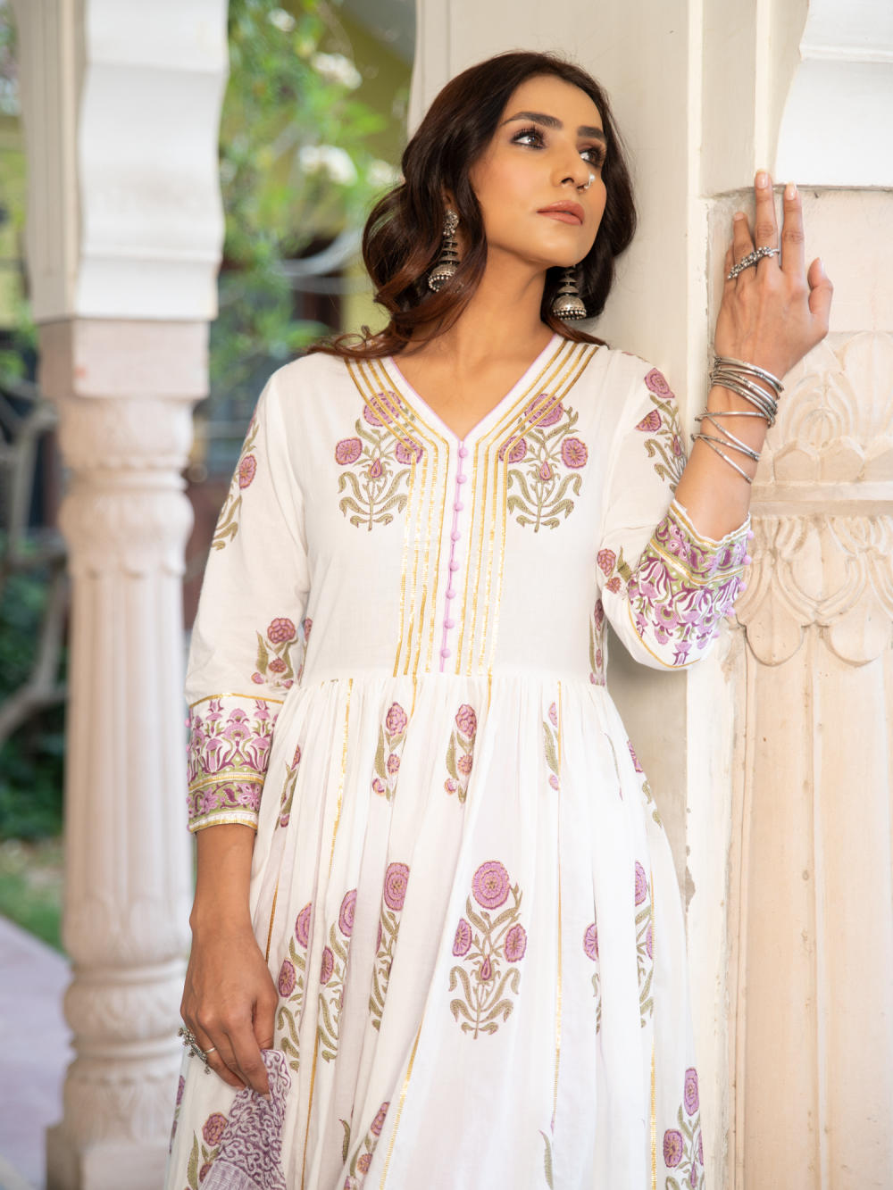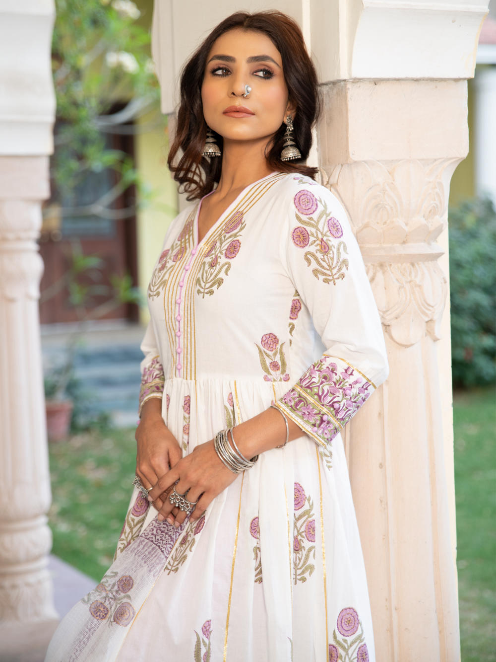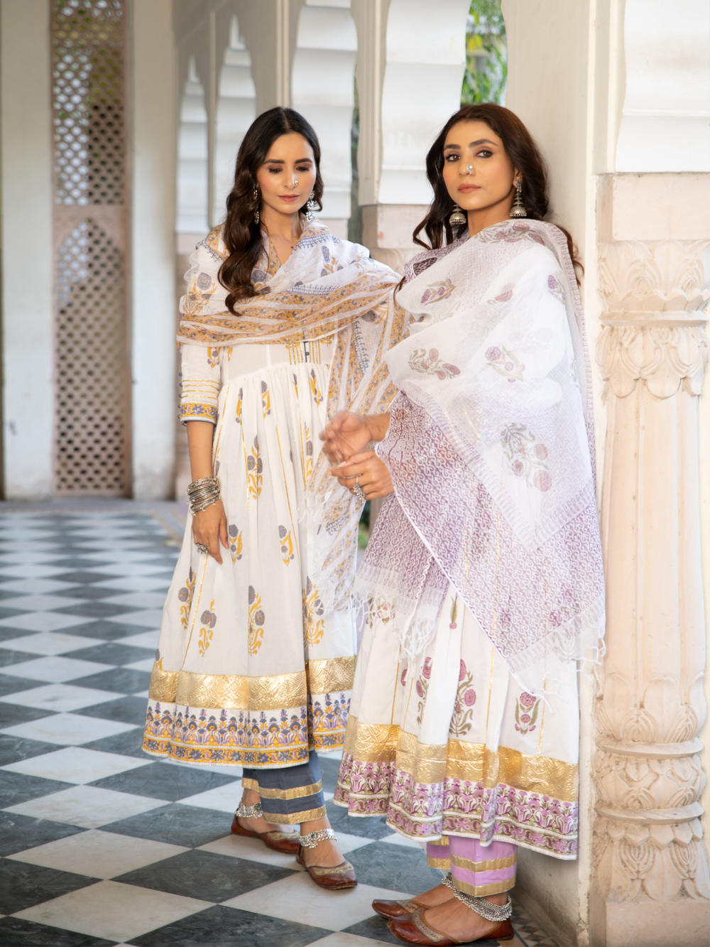 A poetic rendetion of a summer festive collection that makes you nostalgic, in classic luminous block prints. Handcrafted on a bed of fine cotton, mul and doria in hues of pastels. Perfect for light occasions. A set of 3 consists of kurta, staight pant & dupatta. KURTA: A gathered handprinted kurta with mughal buttas on an ivory base. Complete with gota detailing, hand made buttons and lampi work. PANTS: Combined with lavendar straight pants, detailed with gota highlights. DUPATTA: Handblock printed kota doria dupatta