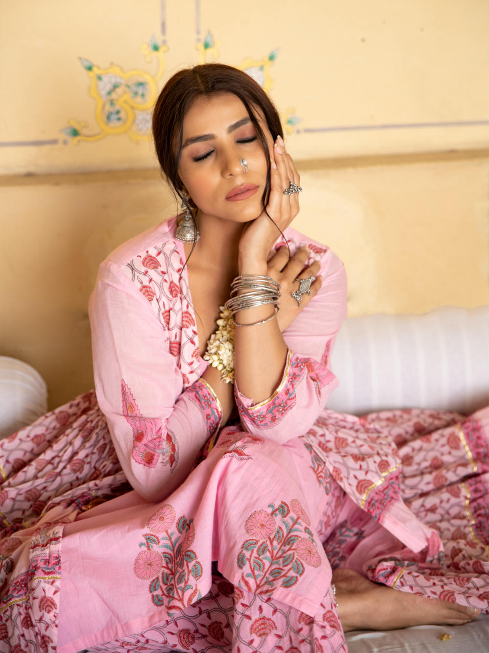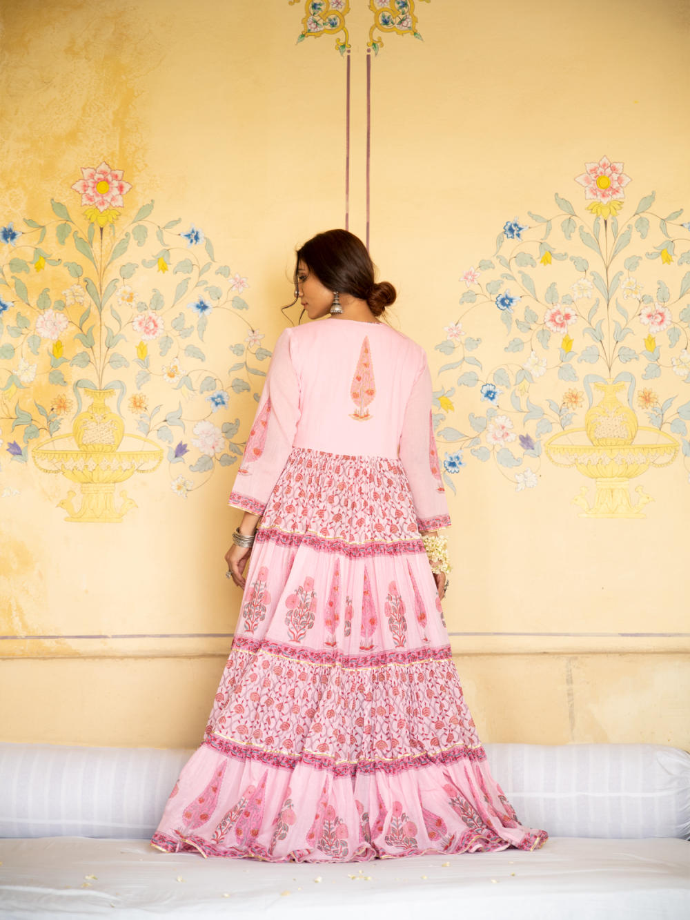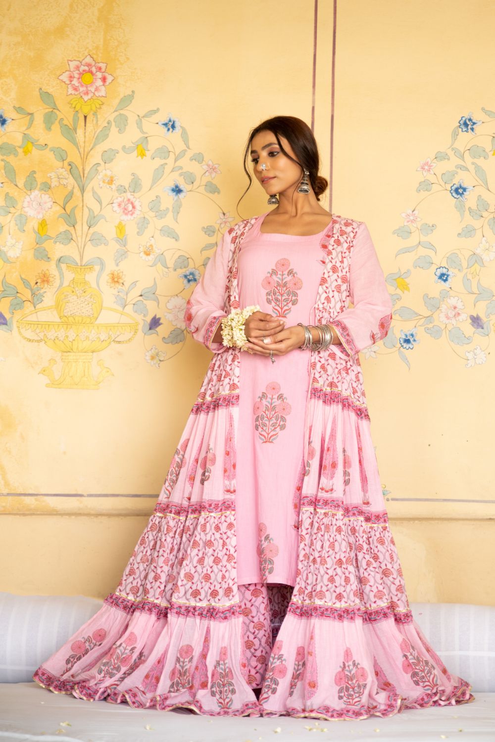 A poetic rendetion of a summer festive collection that makes you nostalgic, in classic luminous block prints. Handcrafted on a bed of fine cotton, mul and doria in hues of pastels. Perfect for light occasions. A set of 3 consists of overlay/jama, inner and pants. JACKET: A blush pink flowly tiered mughal block print jama in floral Chinar and phool butta with mughal jaal. INNER: A simple A-line inner complete with printed buttas. PANTS: Pink straight fit cotton pants in jaal print.