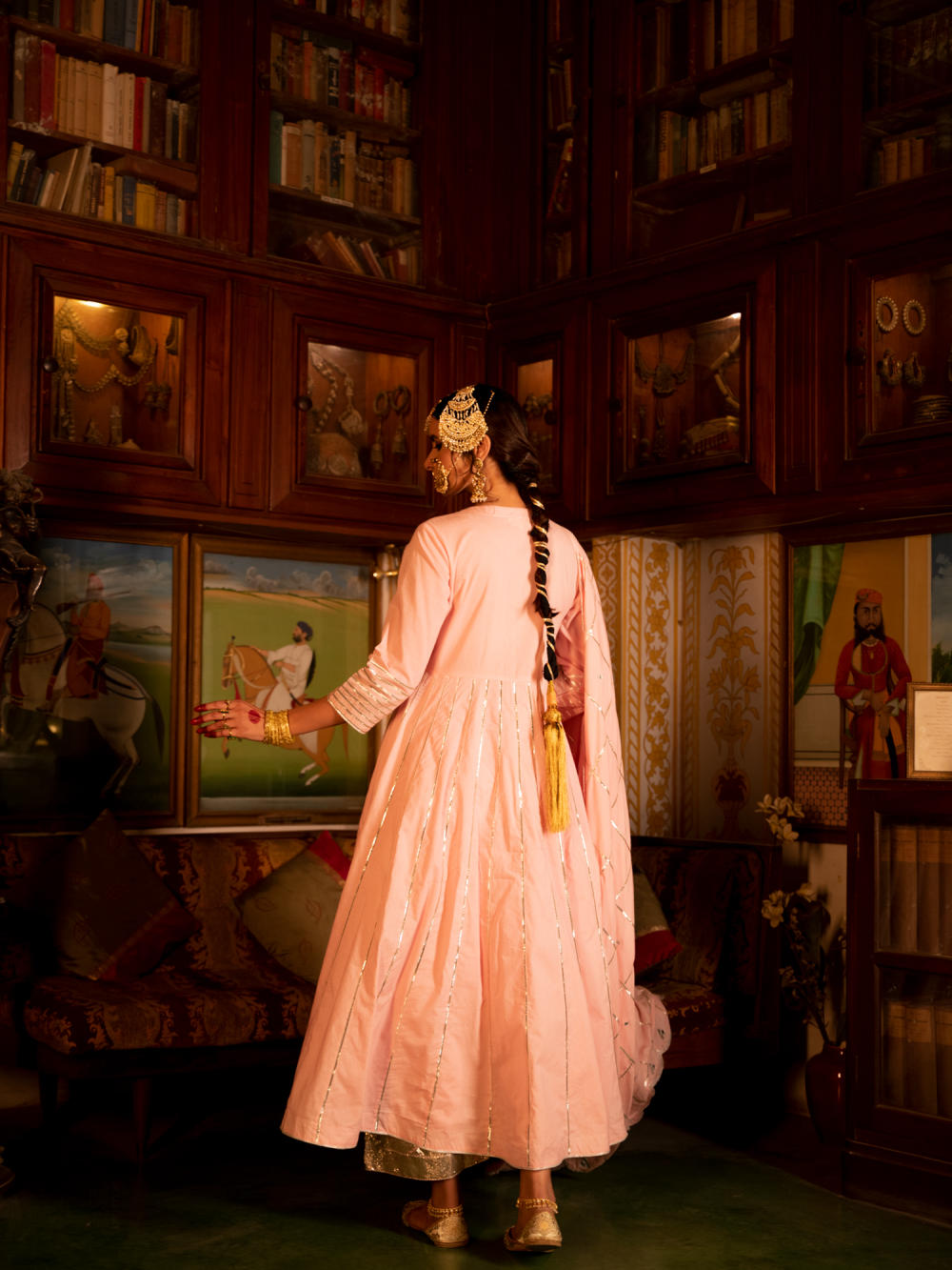 Enter the world of luxurious & regal clothing with Sahiba. Celebrate the grandeur of beauty, celebrations, dressing up and womanhood with vintage textiles and silhouettes. Set of 3 consists of Kalidar, pajama and dupatta. KALIDAR: A pink ghera cotton kalidar is adorned with heavy silver gota work on neck and kalis. PAJAMA: Pink Farshi pajama is detailed with pure metal gold lampi. DUPATTA: A handspun mul pink dupatta is detailed with zari and mirror scallop detailing with heavy gota chaukadi work