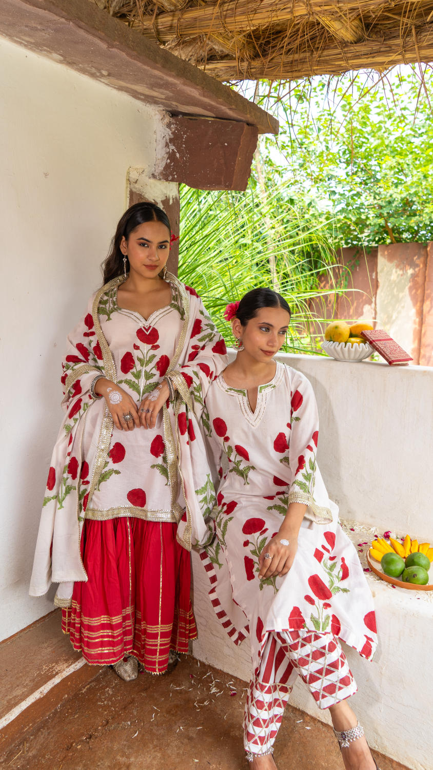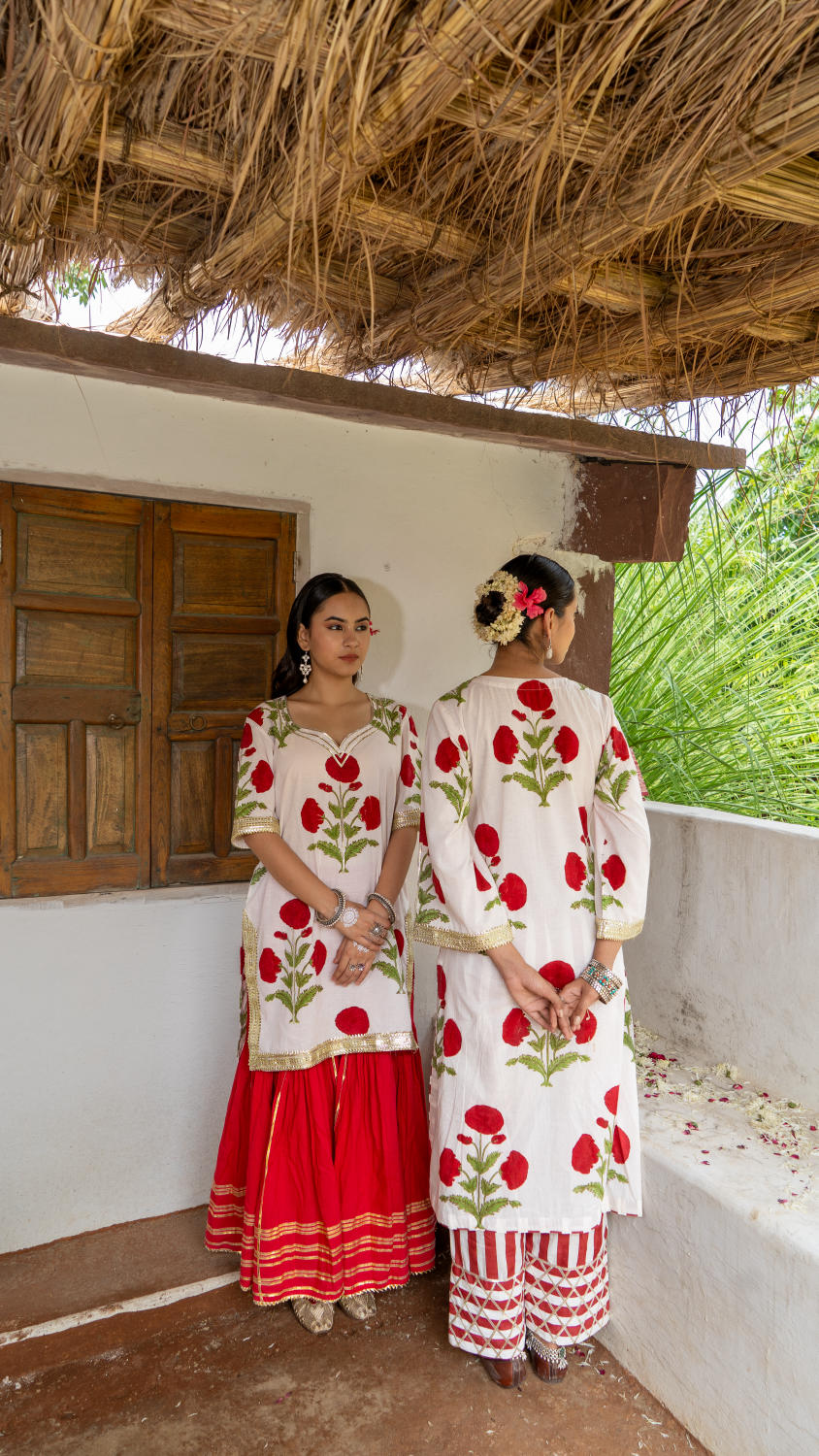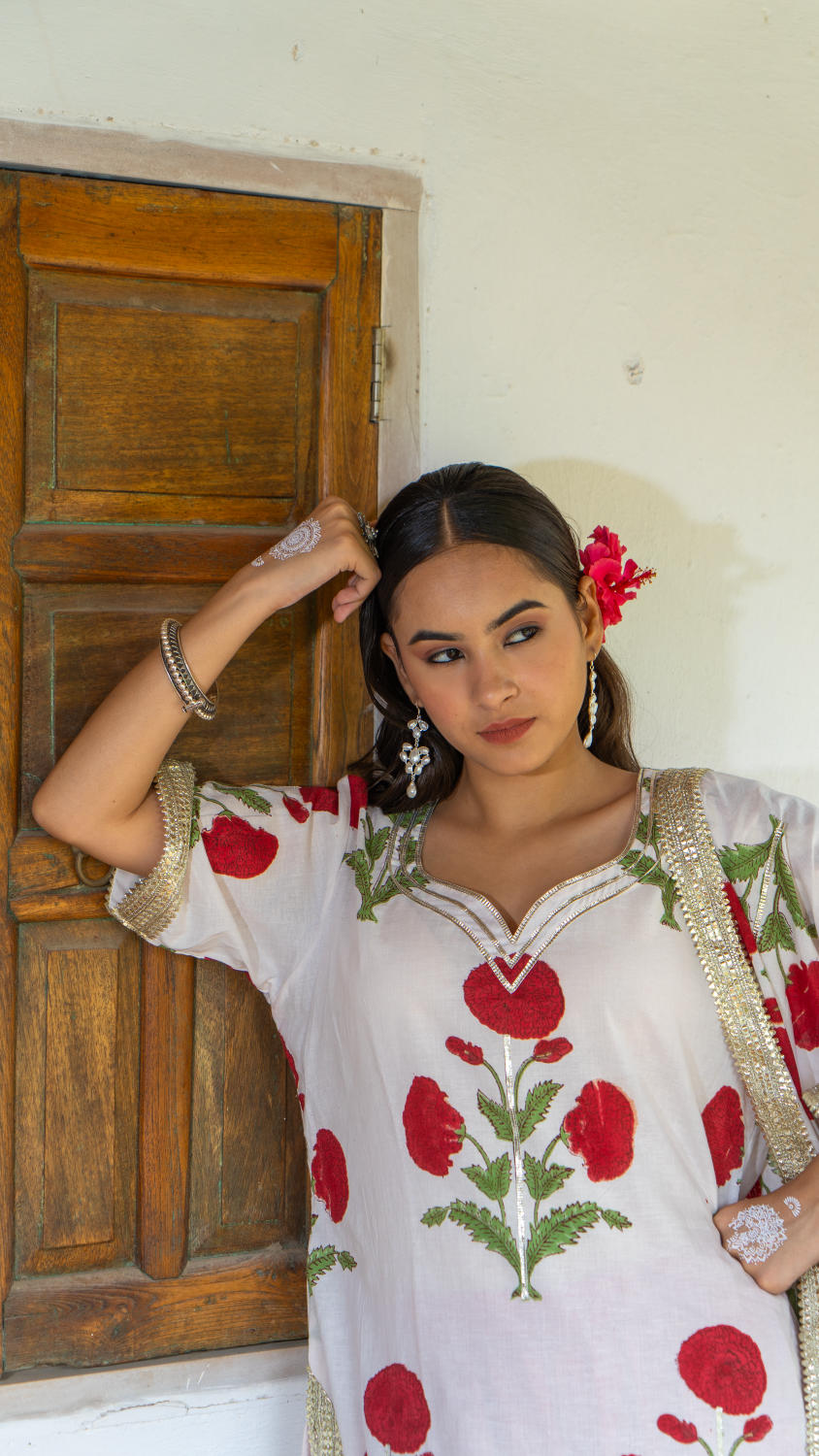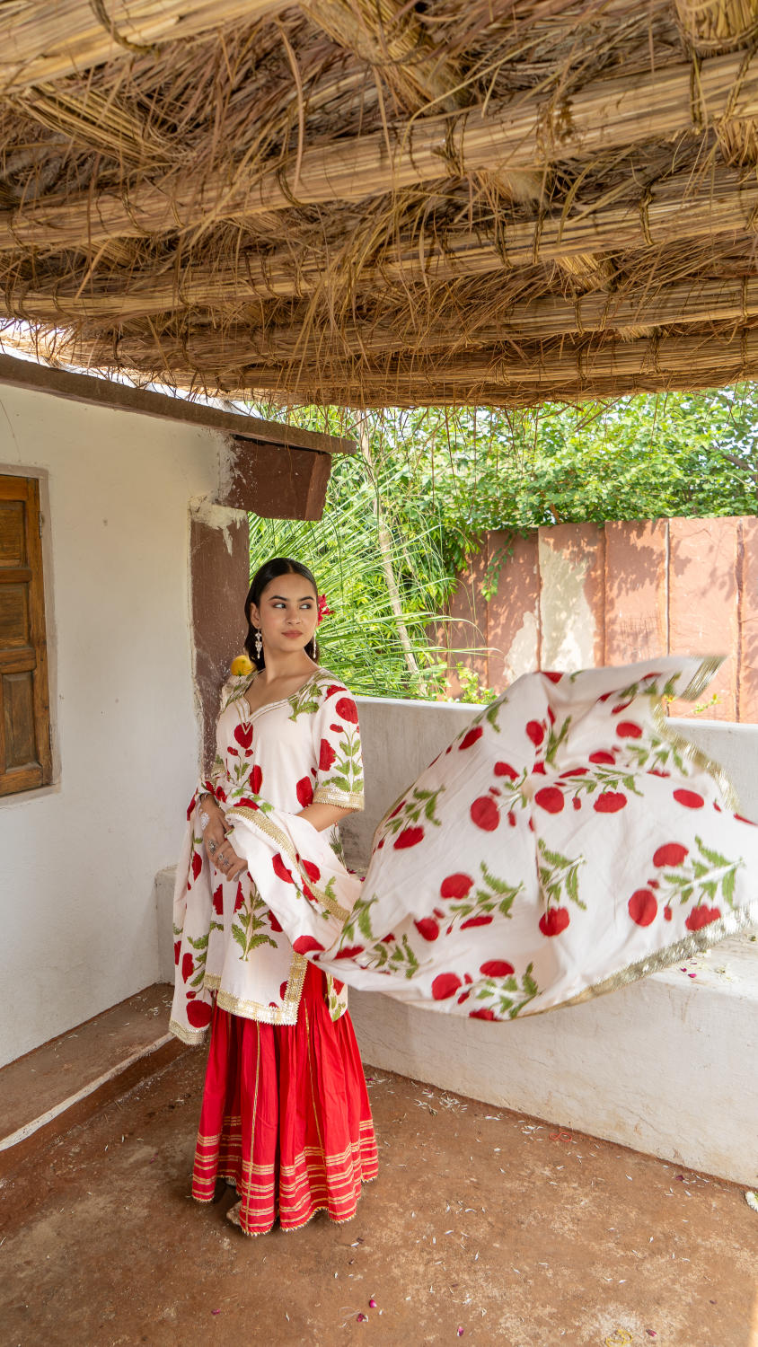 Saundh Red and White hand block printed mughal boota sharara set. Set of 3 consists of cotton kurta, dupatta and sharara. Mughal boota printed kurta with soft gota highlights on each boota with Mul dupatta in same print, finished with chatai lace. Cotton Ghera sharara with gota work.
