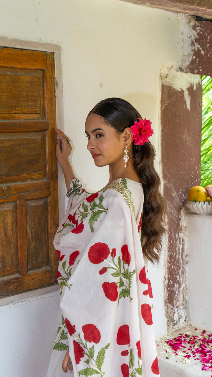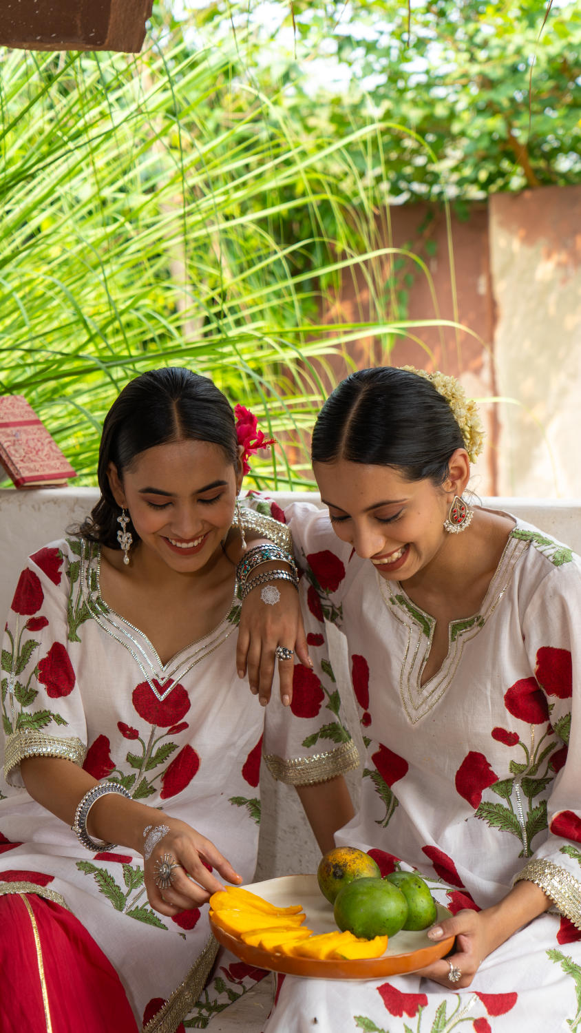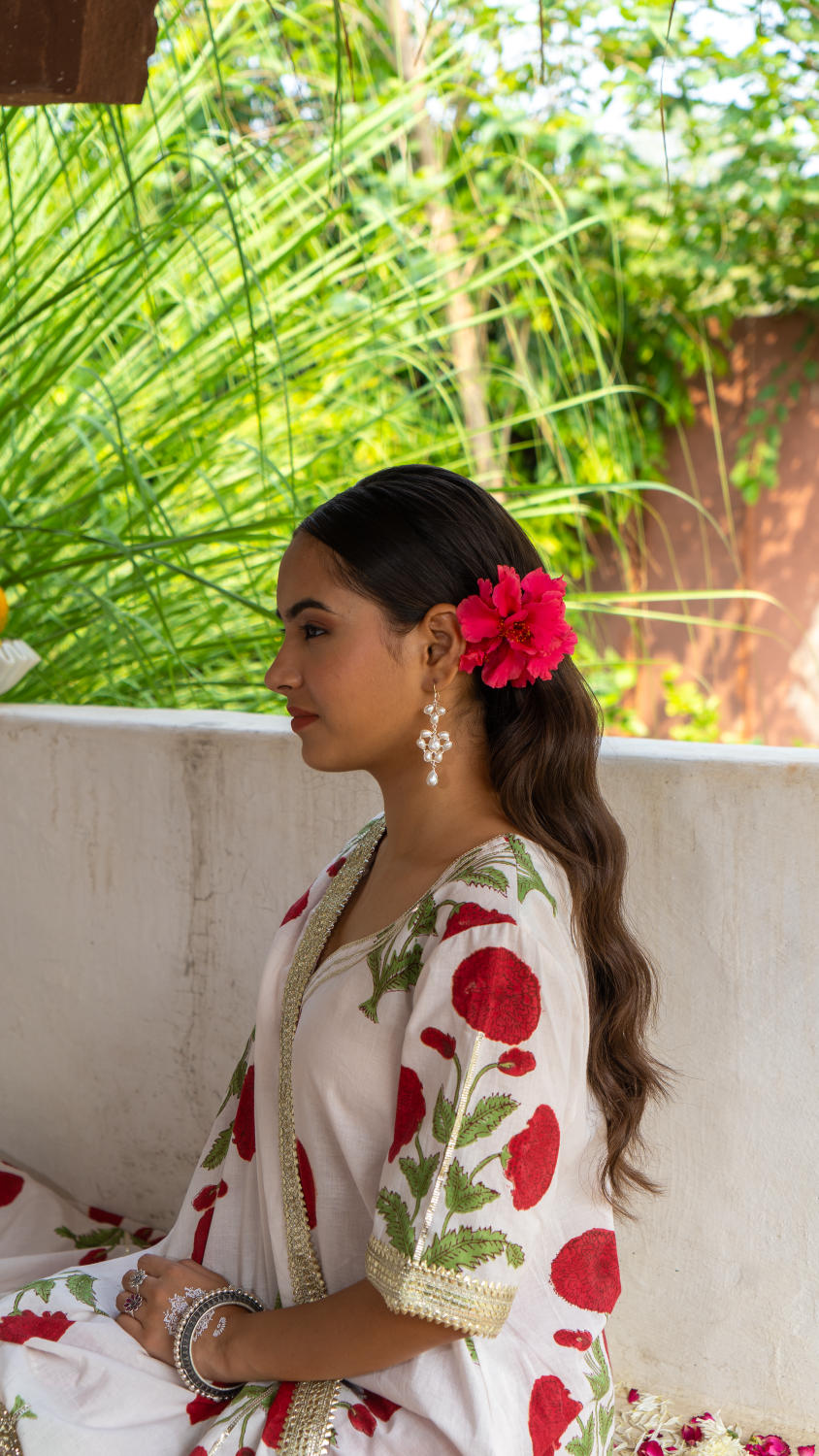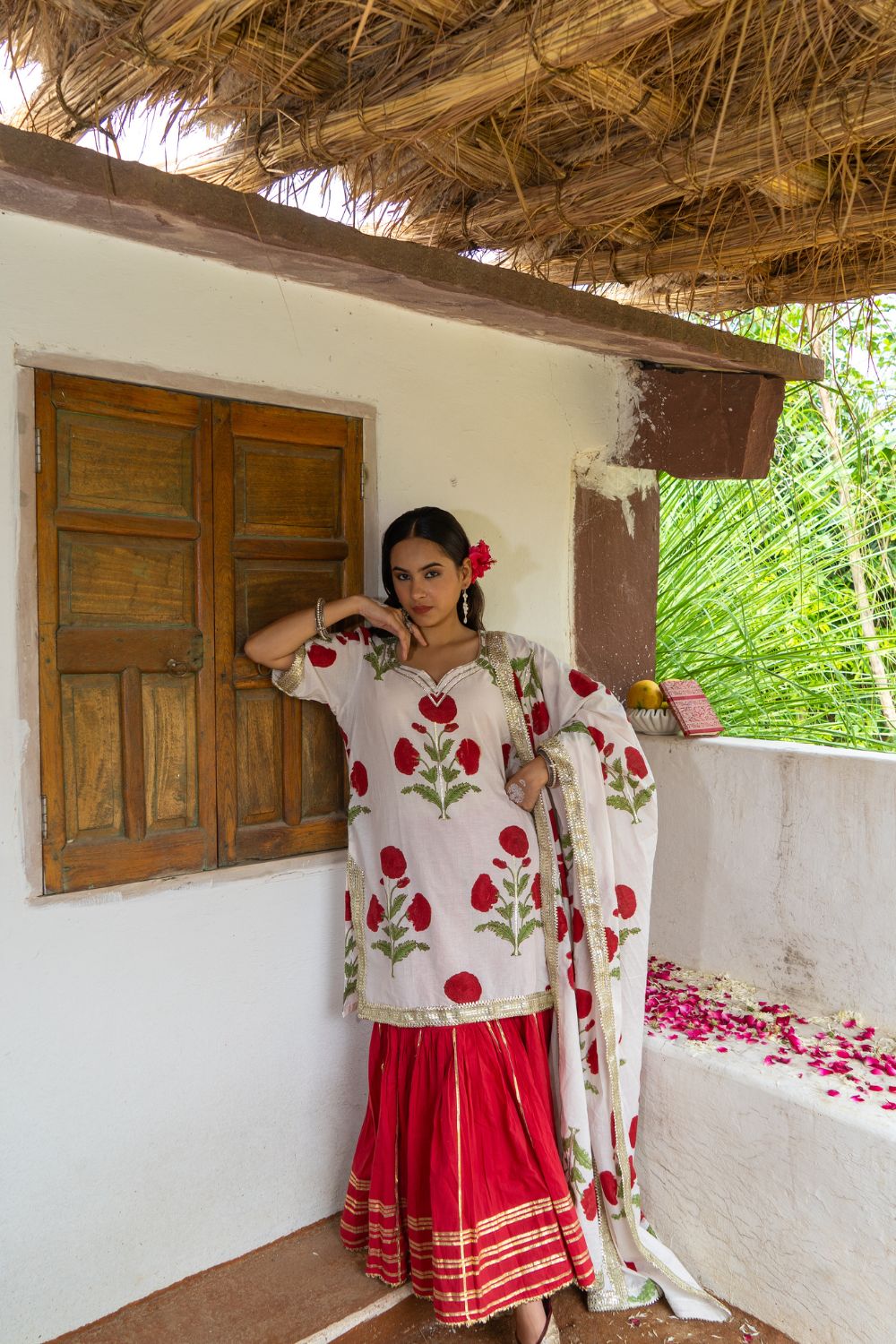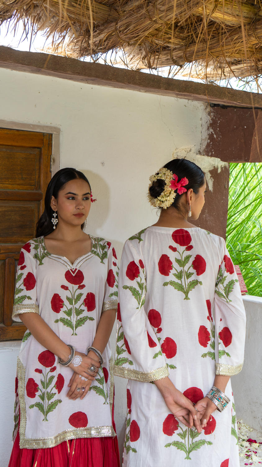 Saundh Red and White hand block printed mughal boota sharara set. Set of 3 consists of cotton kurta, dupatta and sharara. Mughal boota printed kurta with soft gota highlights on each boota with Mul dupatta in same print, finished with chatai lace. Cotton Ghera sharara with gota work.