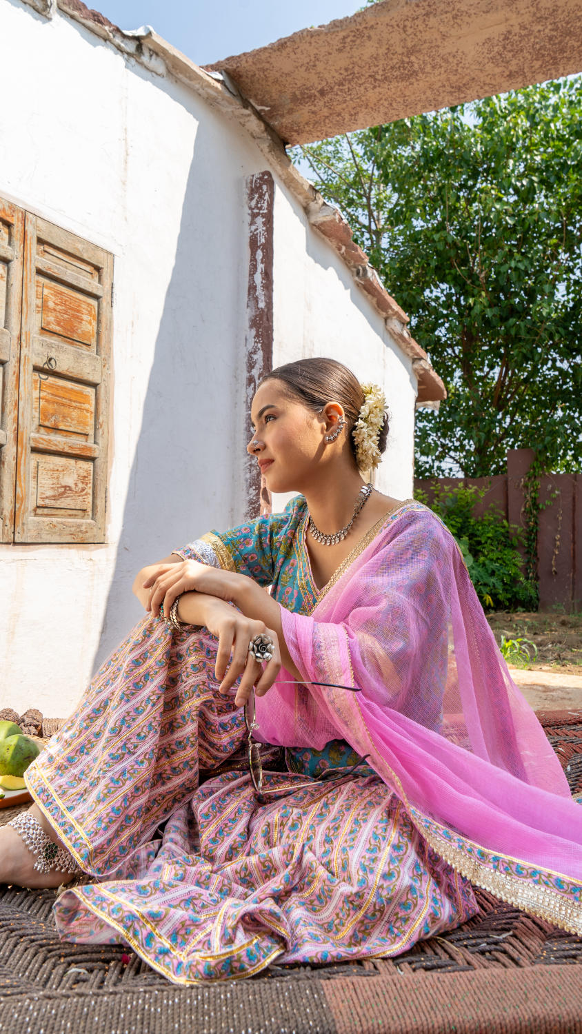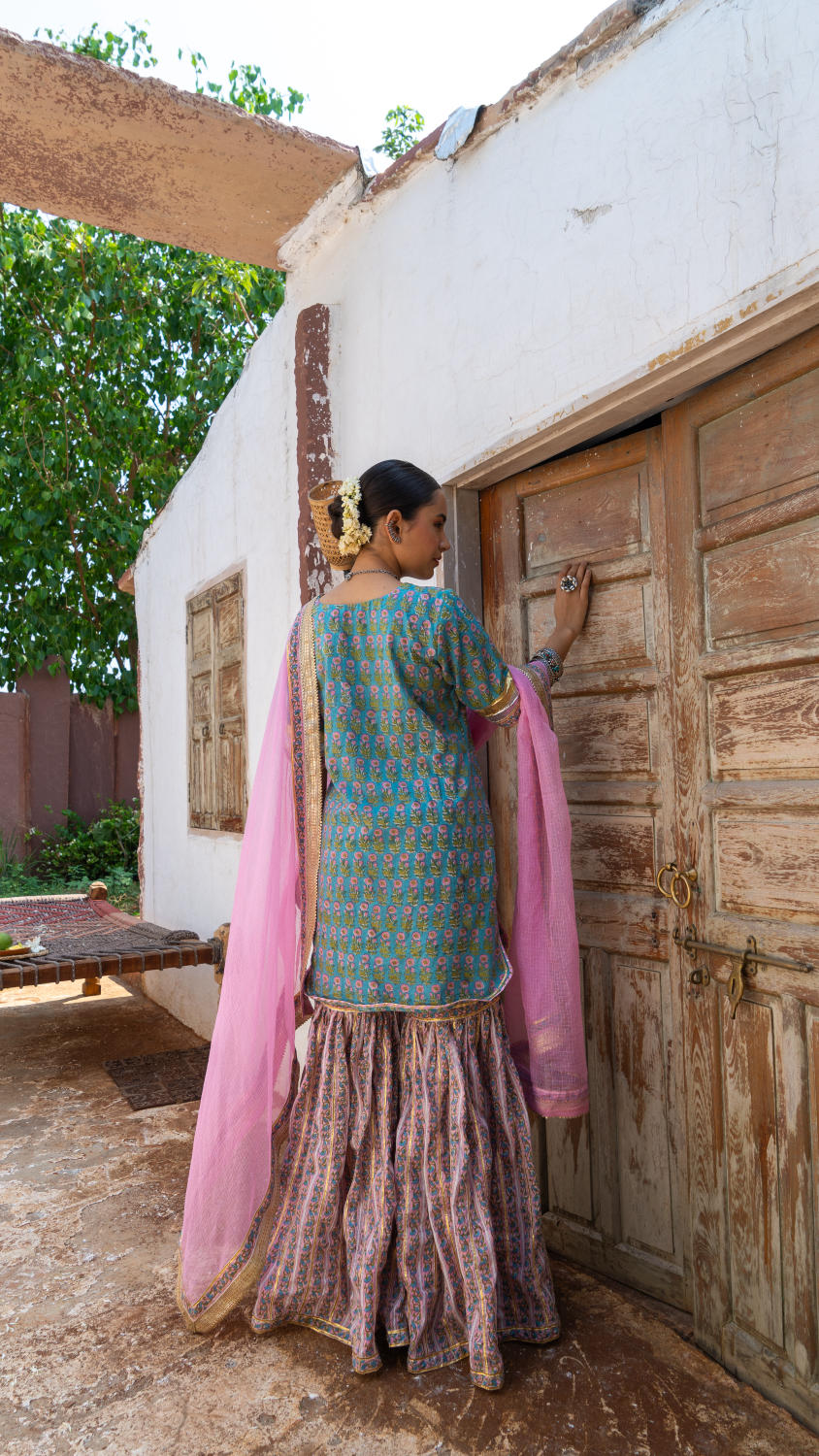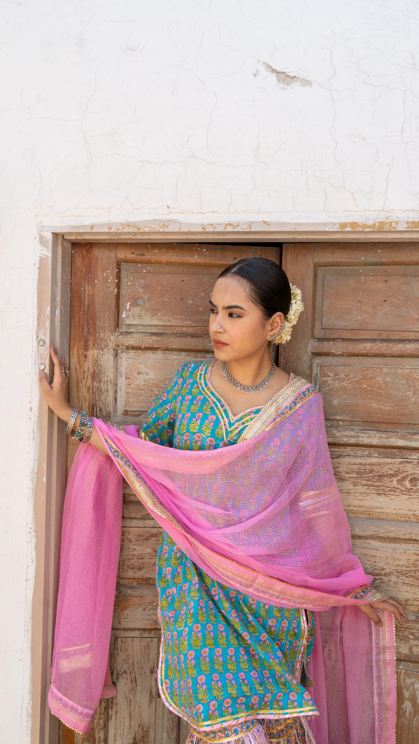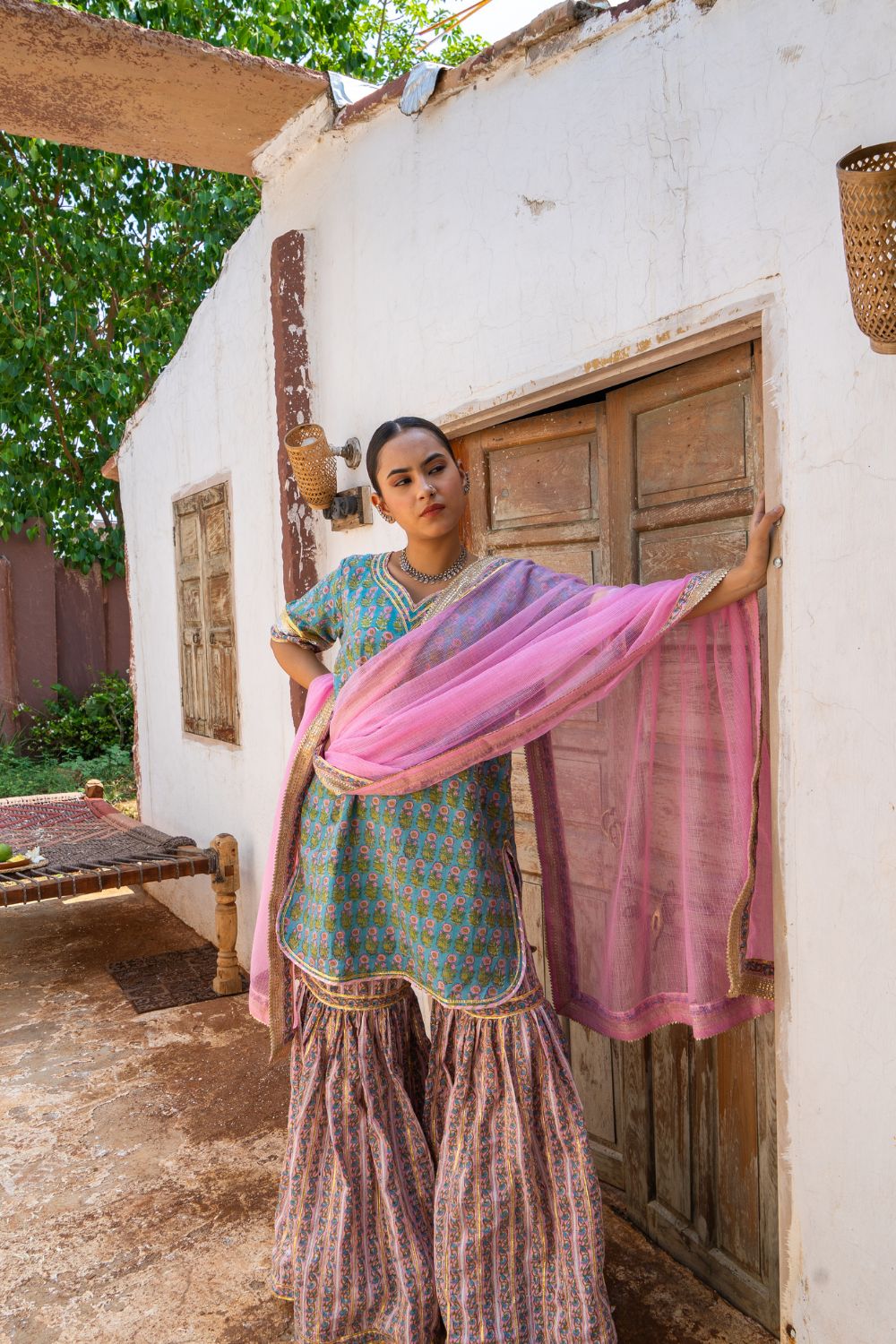 Saundh Sea green and pink hand block printed gota sharara set- Set of 3 consists of kurta, sharara and dupatta. Pink booti jaal print kurta on a sea Green base with floral stripe printed sharara with gota stripes work. Kota doria dupatta with gota detailing on the border.