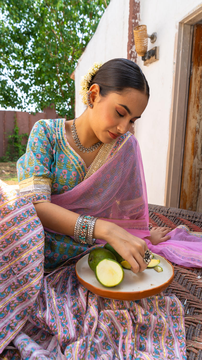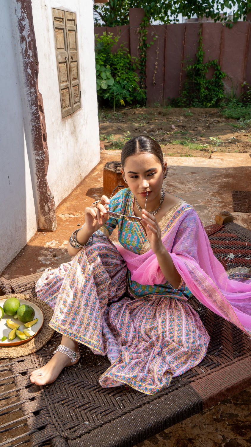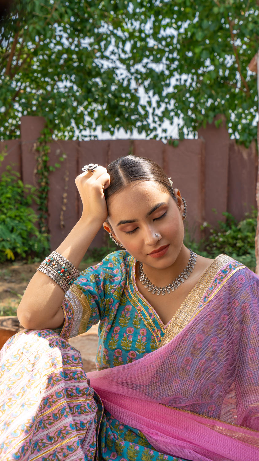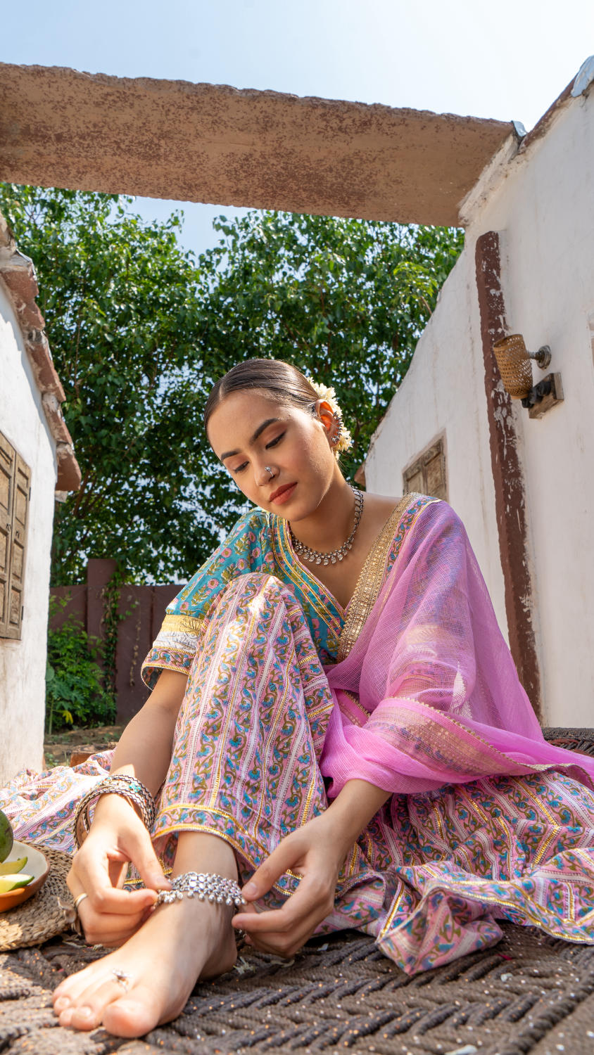 Saundh Sea green and pink hand block printed gota sharara set- Set of 3 consists of kurta, sharara and dupatta. Pink booti jaal print kurta on a sea Green base with floral stripe printed sharara with gota stripes work. Kota doria dupatta with gota detailing on the border.