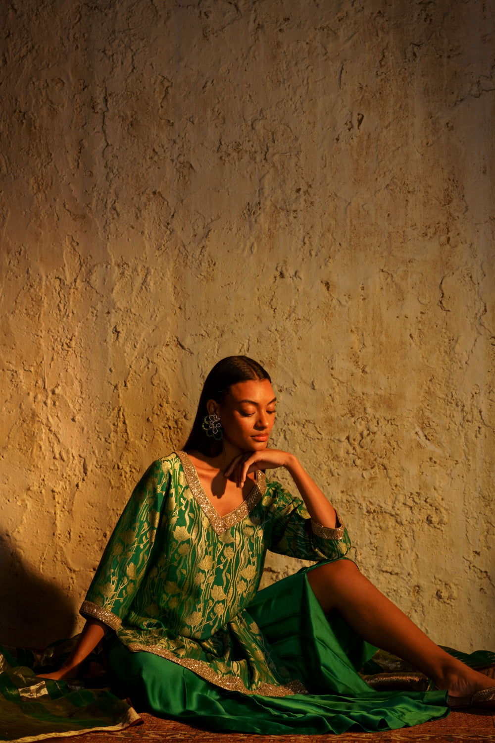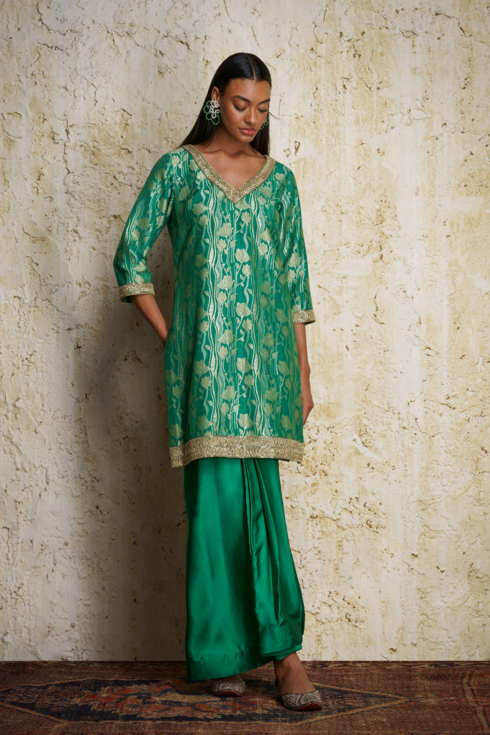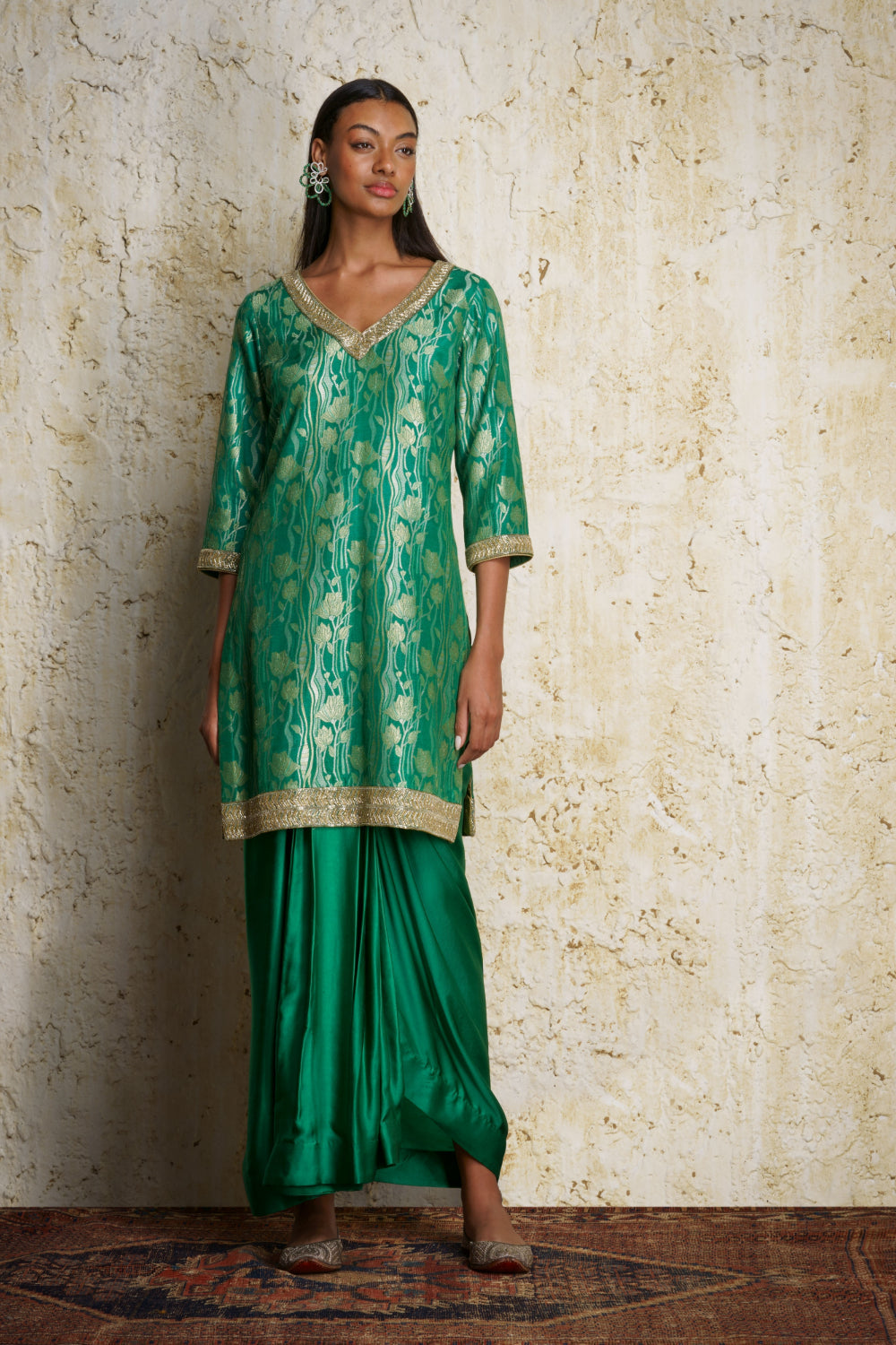 ‘Asmira’ munga silk tunic in ‘panna’ or emerald green handwoven in lotus stem motifs in a dense jaal pattern. Silver and gold chevron design embroidery in cutdana or bead work adorn the tunic. ‘Lehar’ modal satin dhoti skirt draped in cascading pleats is paired with the ‘Asmira’ tunic.