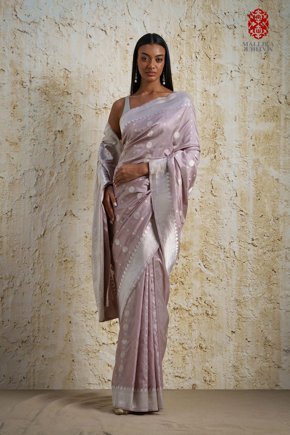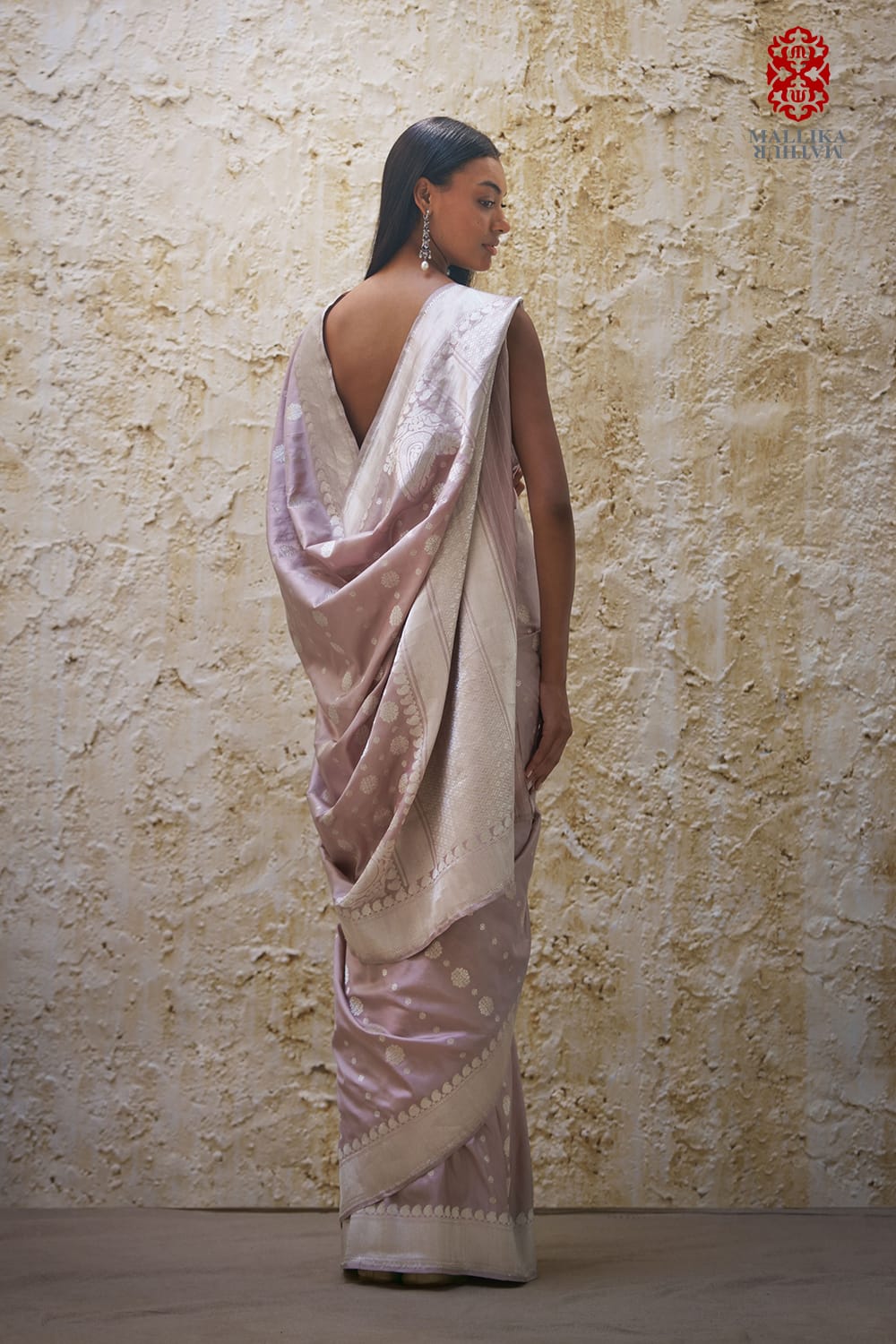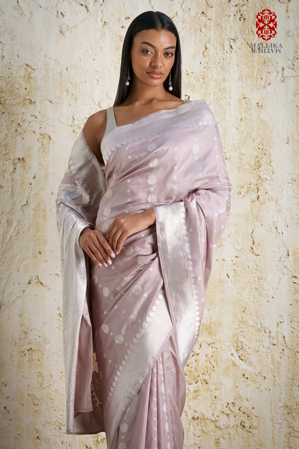 ‘Chunari buti’ katan silk Banarasi sari in a tea -rose shade handwoven in traditional silver zari motifs. The pallu is woven in ‘koniya kairi’ butis with silver zari borders spanning the sari. The silver sari and tea rose color lend the sari an ethereal texture. It is paired with a silver zari sleeveless blouse 'Sitara'.