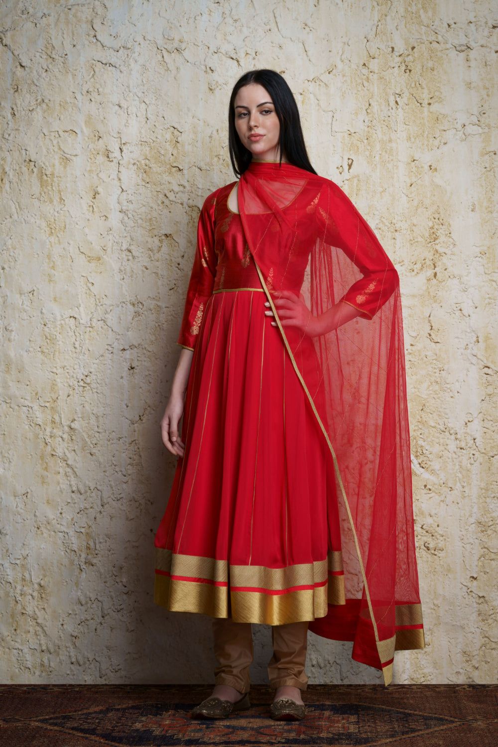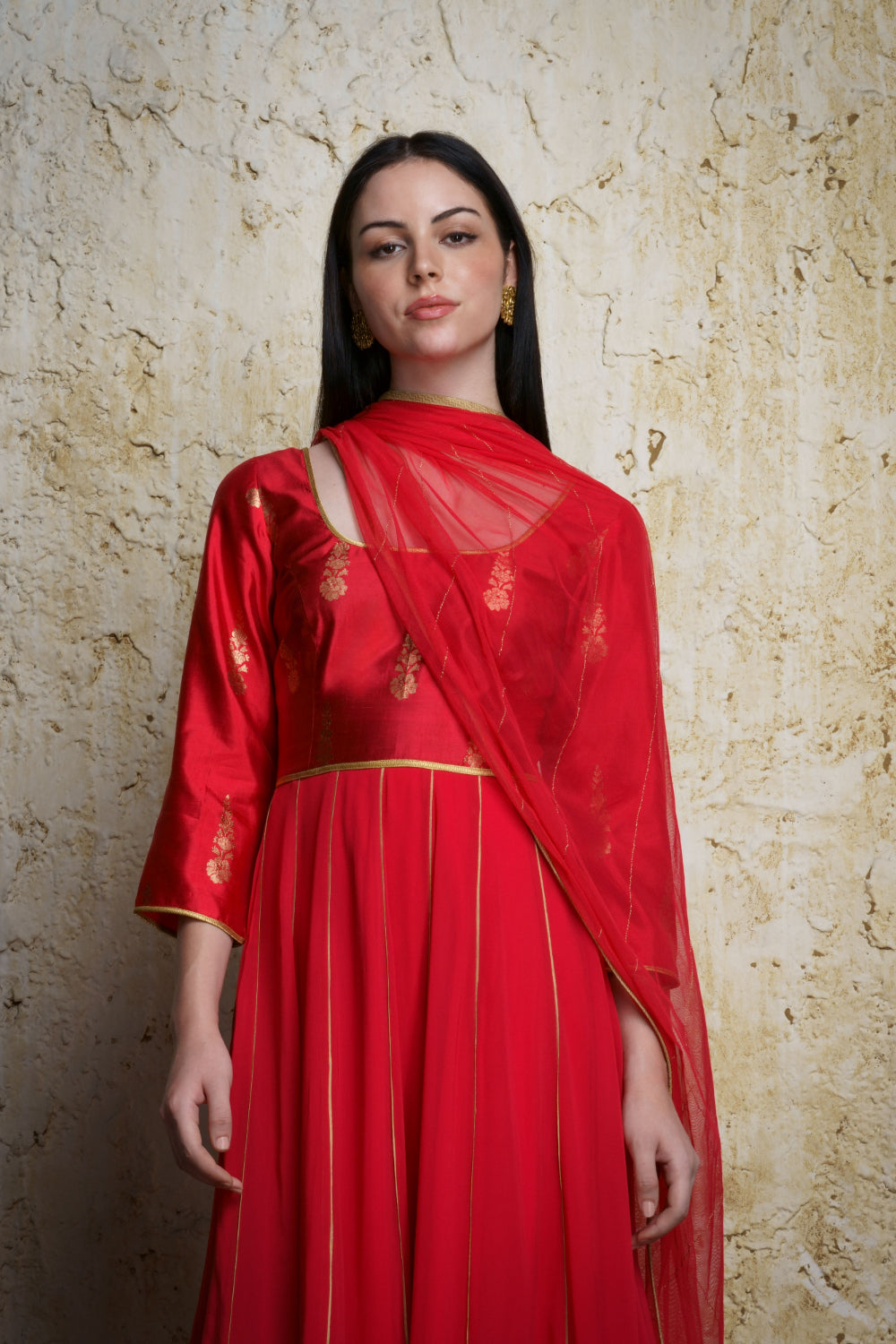‘Mehar’ vermillion red anarkali with a silk banarasi brocade bodice and georgette kalis adorned with zari borders. The Anarkali is a timeless and classic design of our collection that can be worn on any formal occasion.