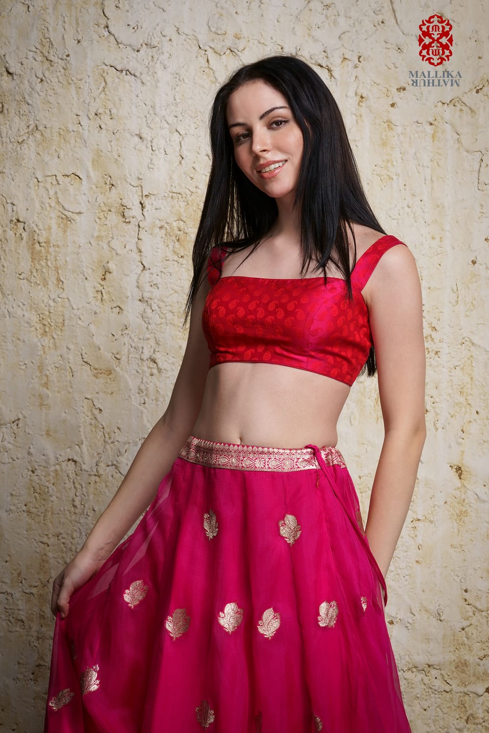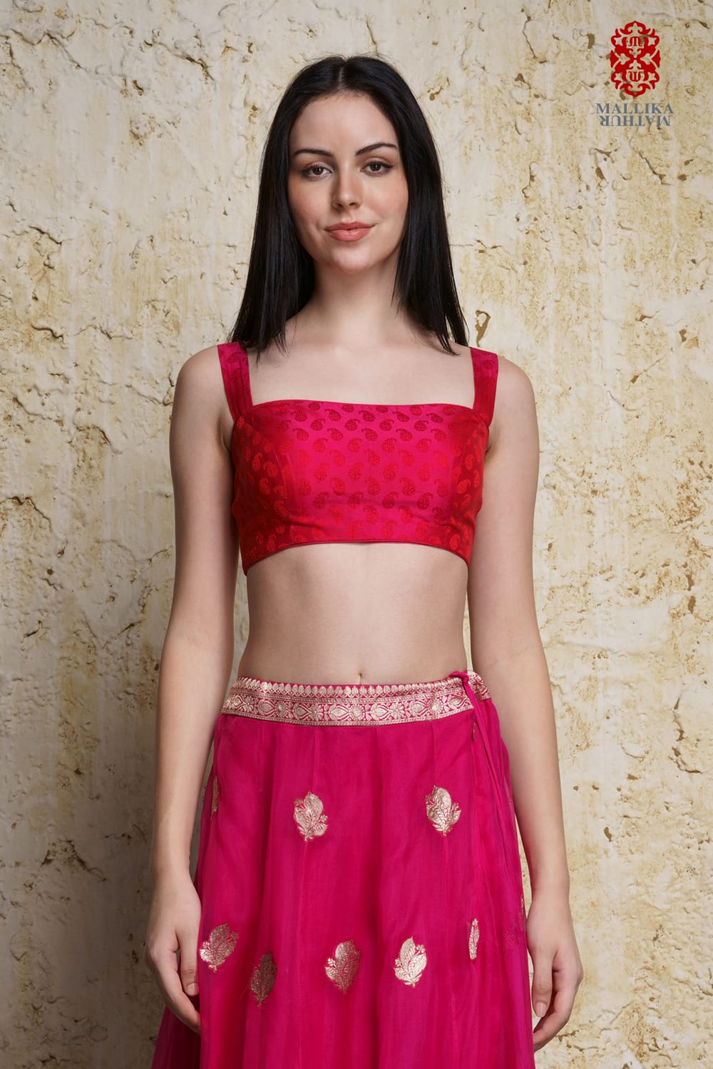 'Raisa' sleeveless blouse with straps in cairi buti tanchoi silk blouse handwoven in red and pink resham thread. The blouse can be paired with a lehenga as shown or a sari.