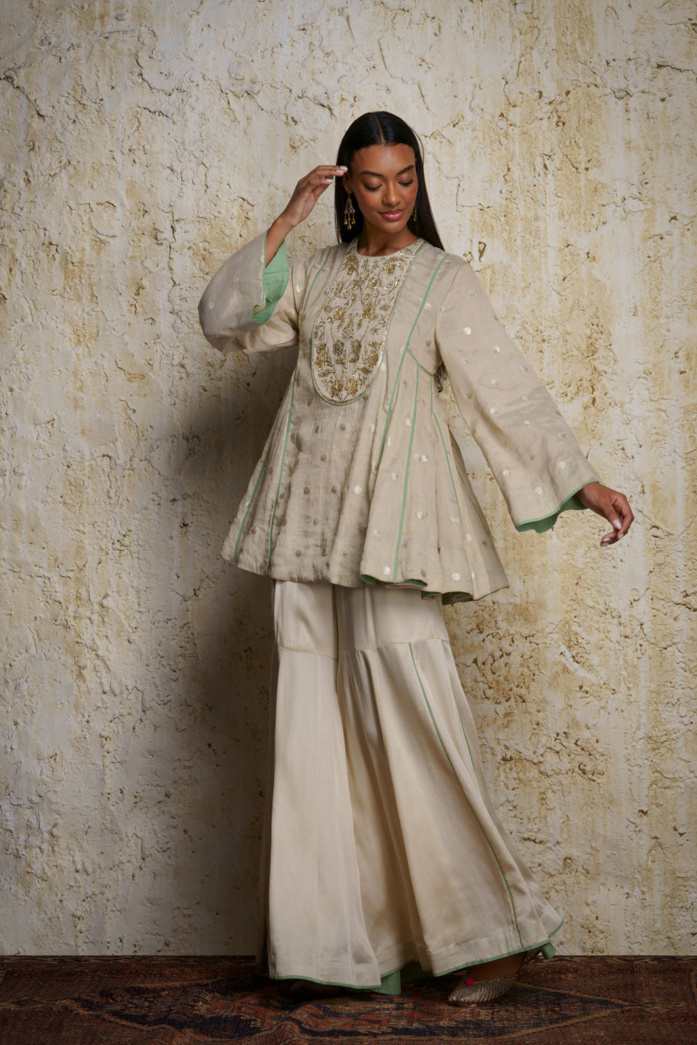 ‘Rihanna’ a natural tone munga tissue tunic in a flowing umbrella style enhanced with an embroidered yolk. Miniature handwoven zari ‘Ashrafi’ motifs span the tunic paired with a panel style gharara in modal satin. A mint green kora stole embellished with zardosi motifs complements the outfit.