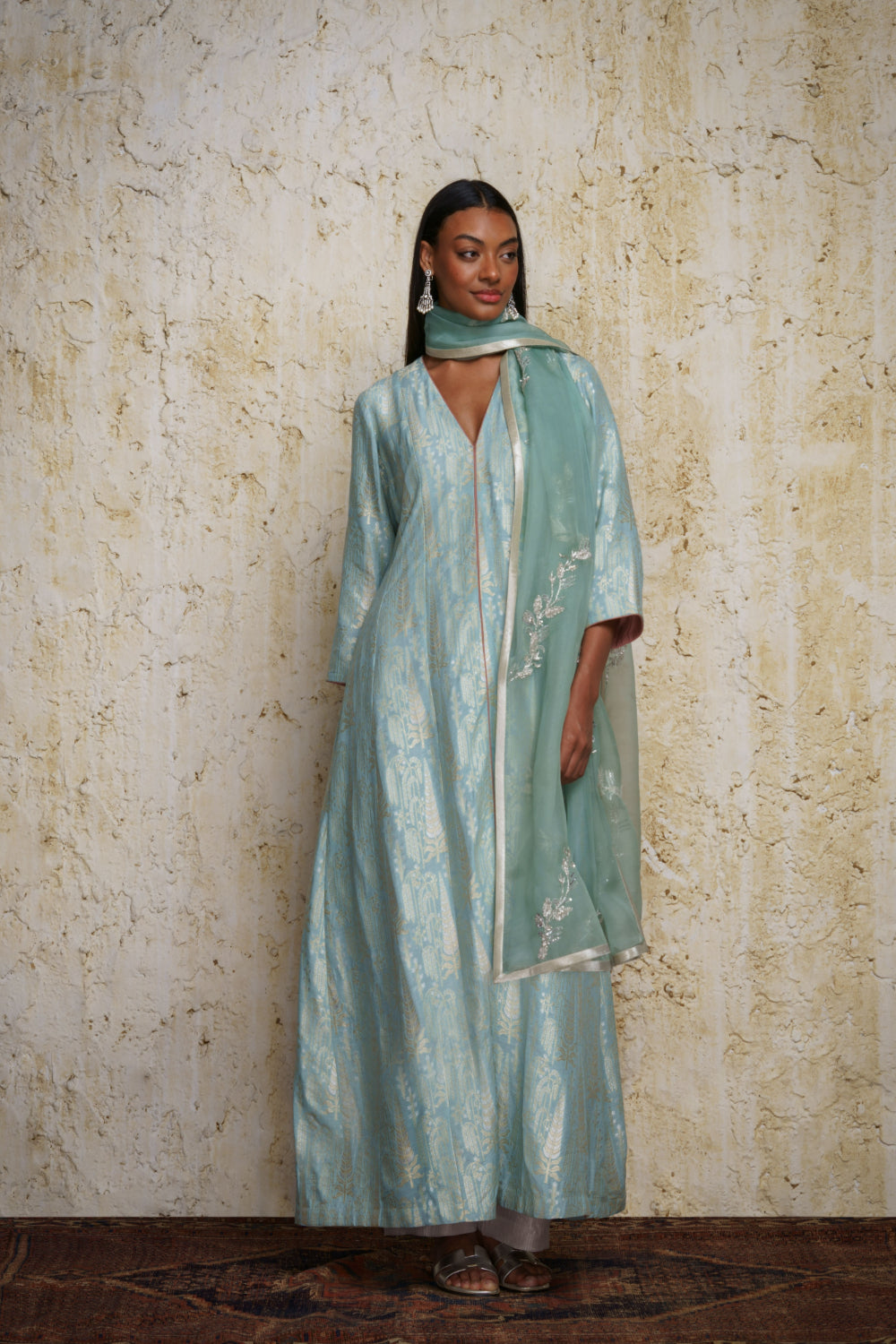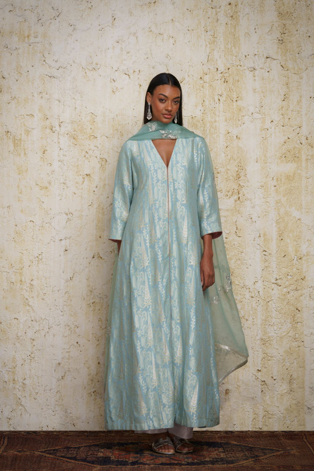 ‘Sahar’ a kalidar or panelled style anarkali in ‘asmani' or azure blue shade handwoven in silver zari cypress tree and willow tree motifs. It is pared with a diaphanous aquamarine blue kora organza dupatta embroidered in diagonal silver dabka and zardosi leaf bel motifs. Silver self striped silk tissue palazzos complete the ensemble.