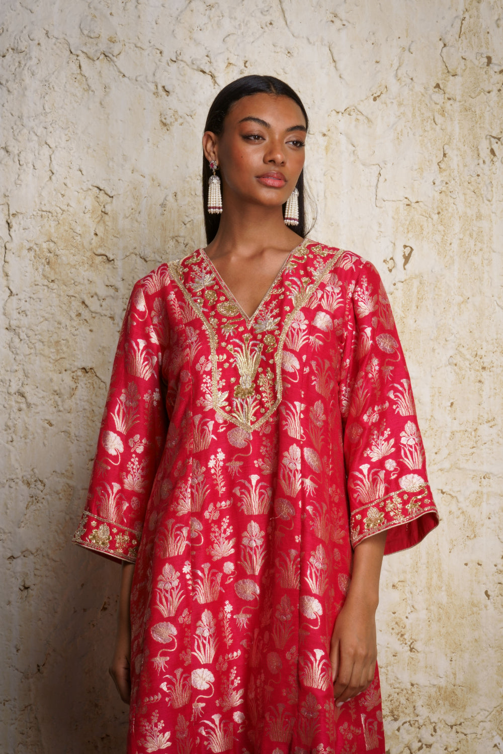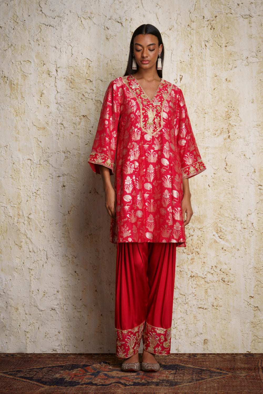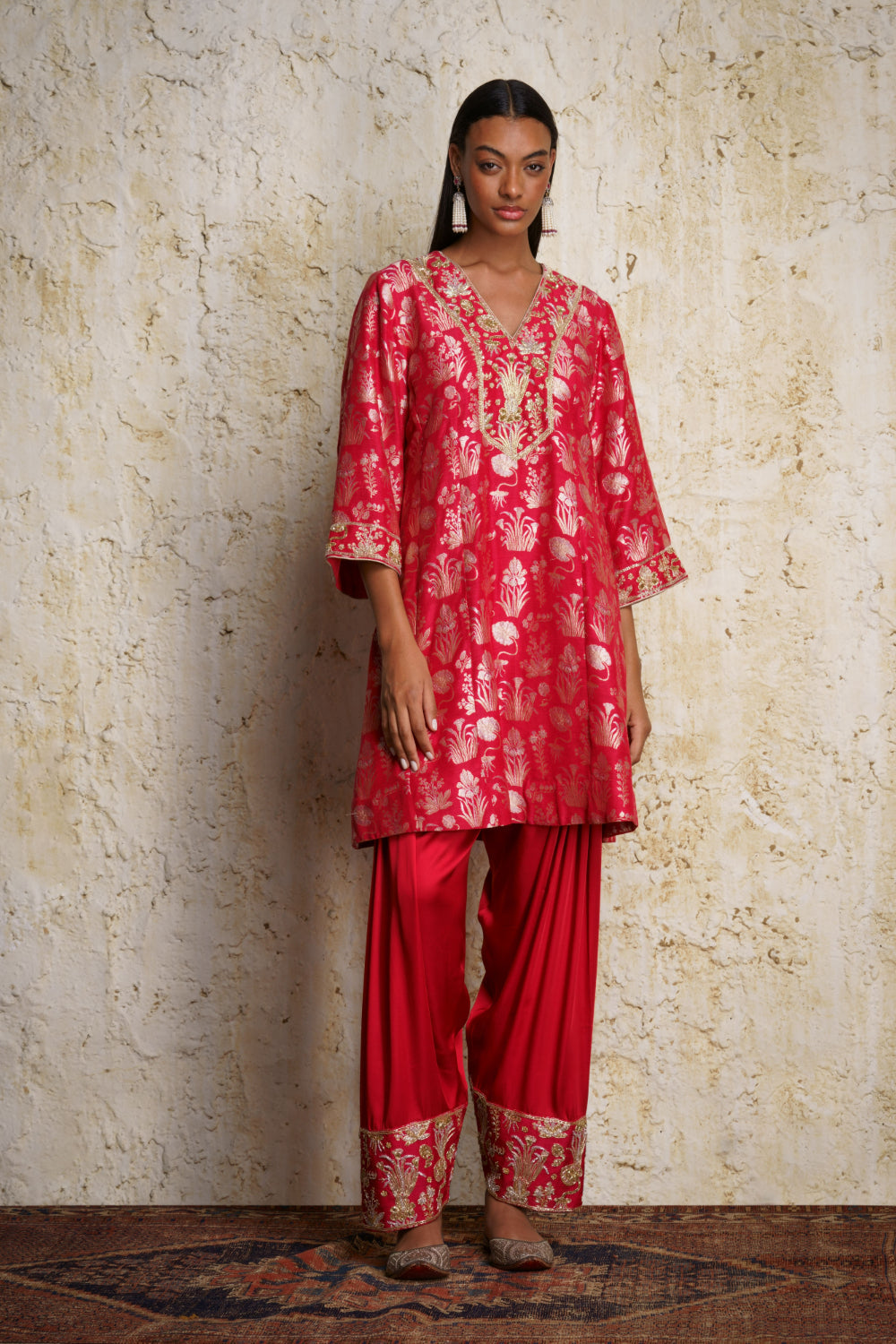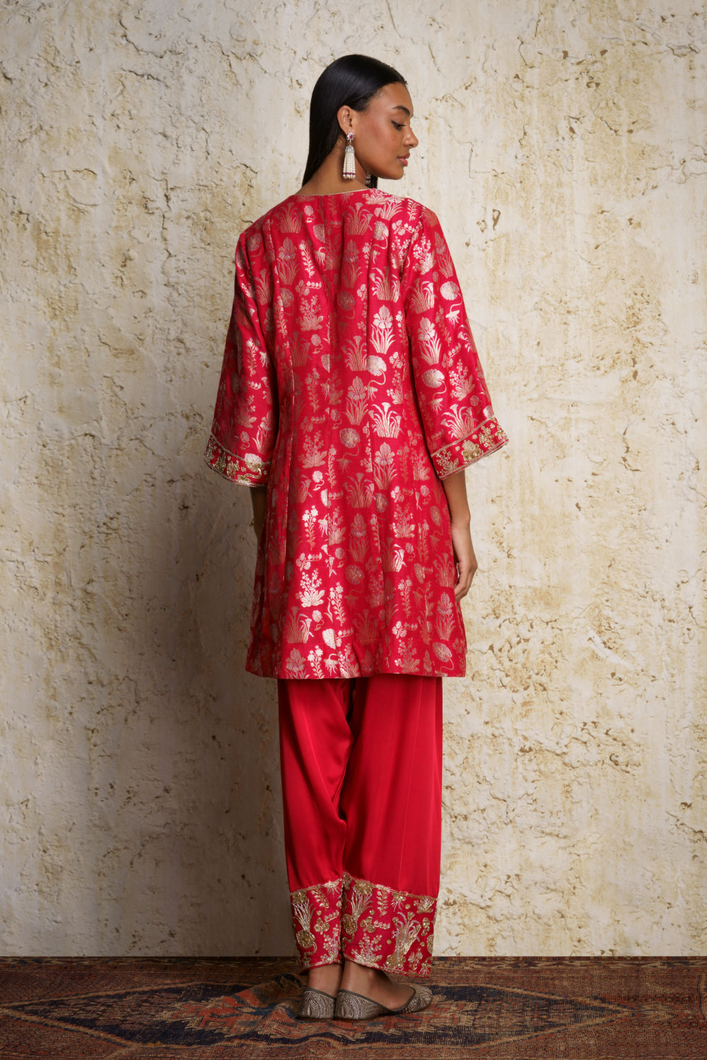 ‘Shira’ munga silk short anarkali style red kurta handwoven zari in multi floral motifs inspired by vintage museum designs. It is paired with a red modal satin salwar with an intricately embroidered ’paunchi’. A red kora stole with miniature motifs complements the outfit.