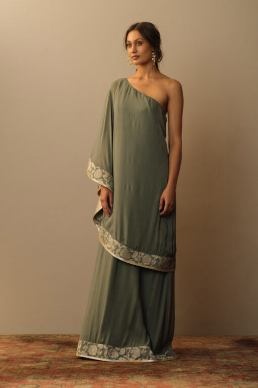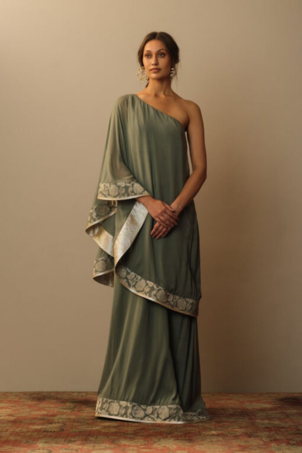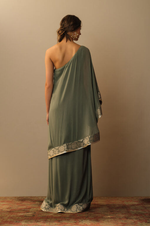 This dress is inspired by the traditional Greek toga dress. The border is in a Banarasi handwoven floral weave design. This elegant dress is ideal for any formal occasion. The georgette fabric has a soft and sensual drape.