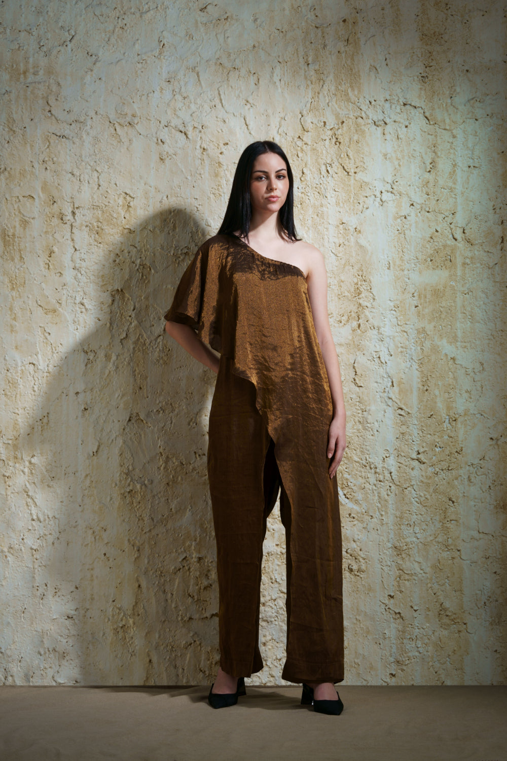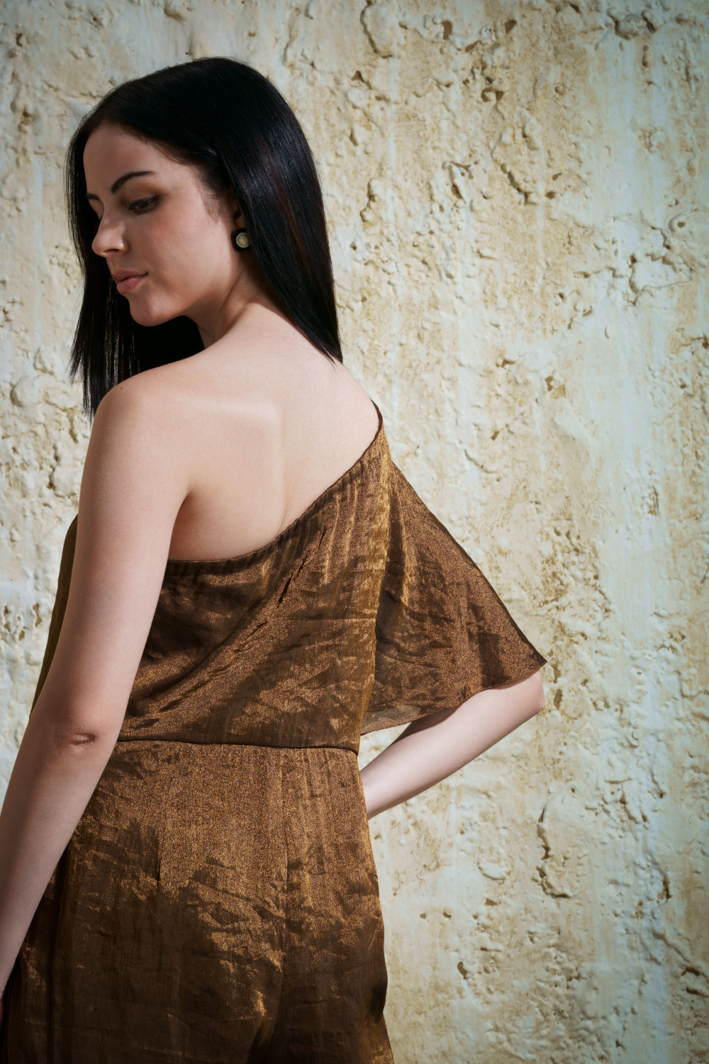 ‘Zora’ A burnt gold handwoven silk tissue jumpsuit. The one shoulder style of the jumpsuit is enhanced by a soft flap draped over one side extending to the bodice.
