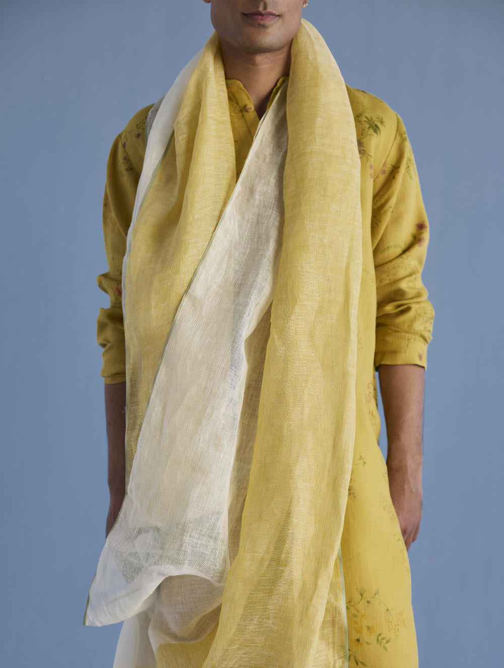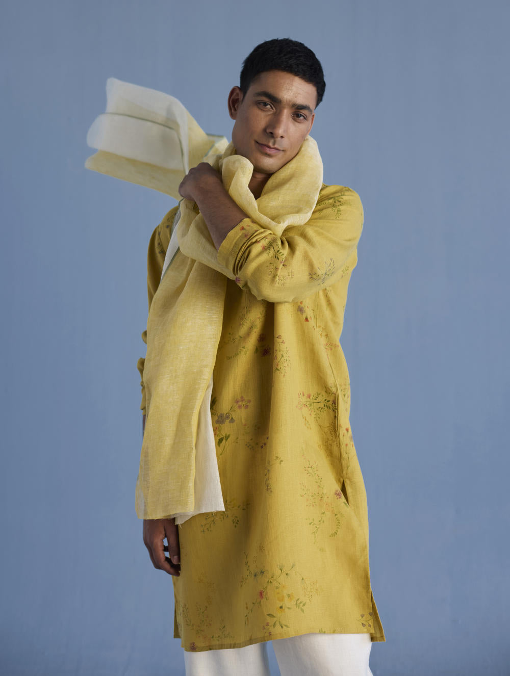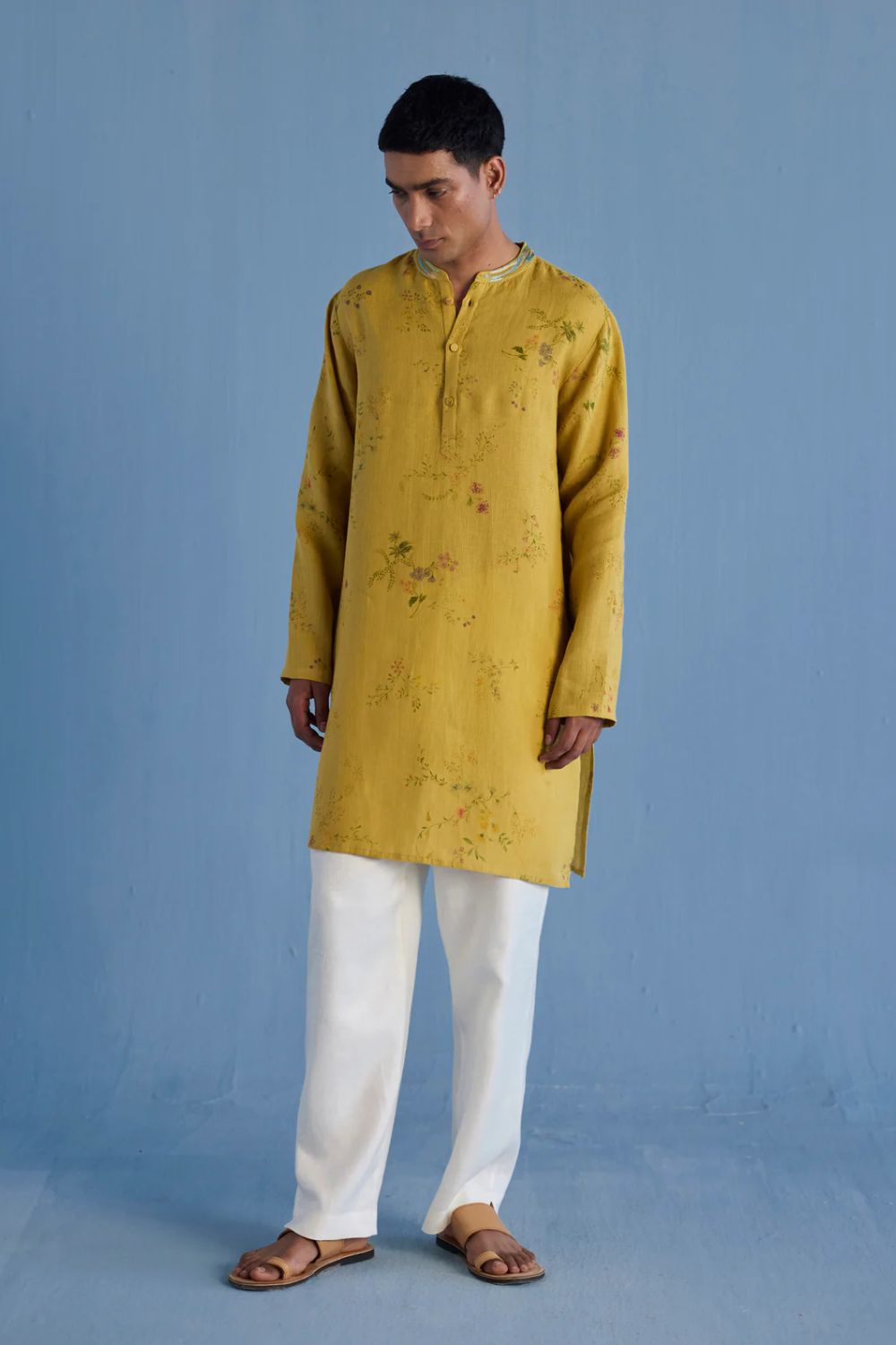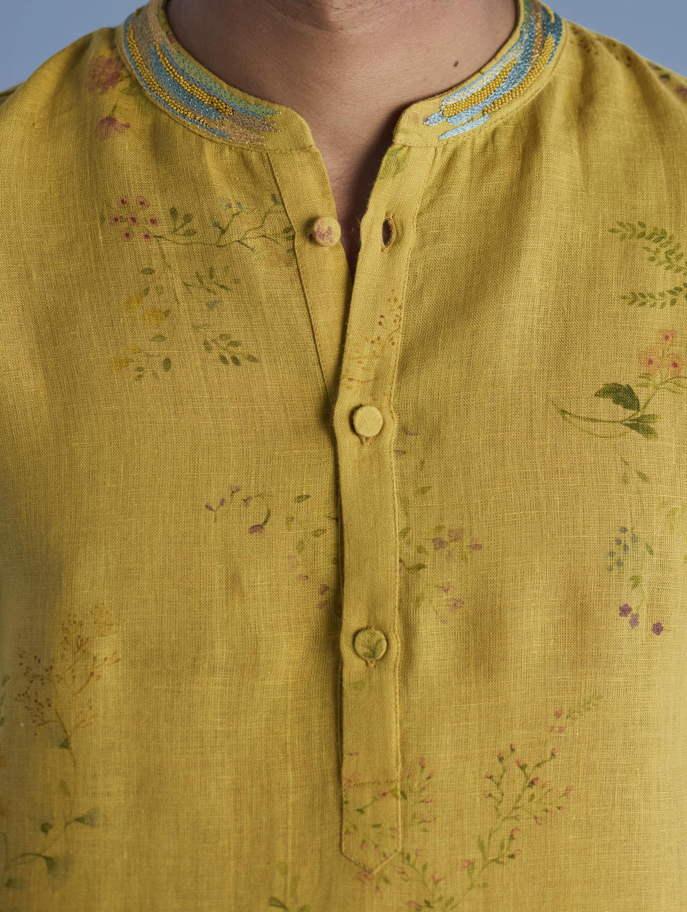 A statement, yet timeless, mandarin collared kurta in the softest pure yarn-dyed linen printed in a hand-painted watercolour floral print with a hand-embroidered collar with mixed silk threads and beads mimicking the brush strokes in colours derived from the floral print.