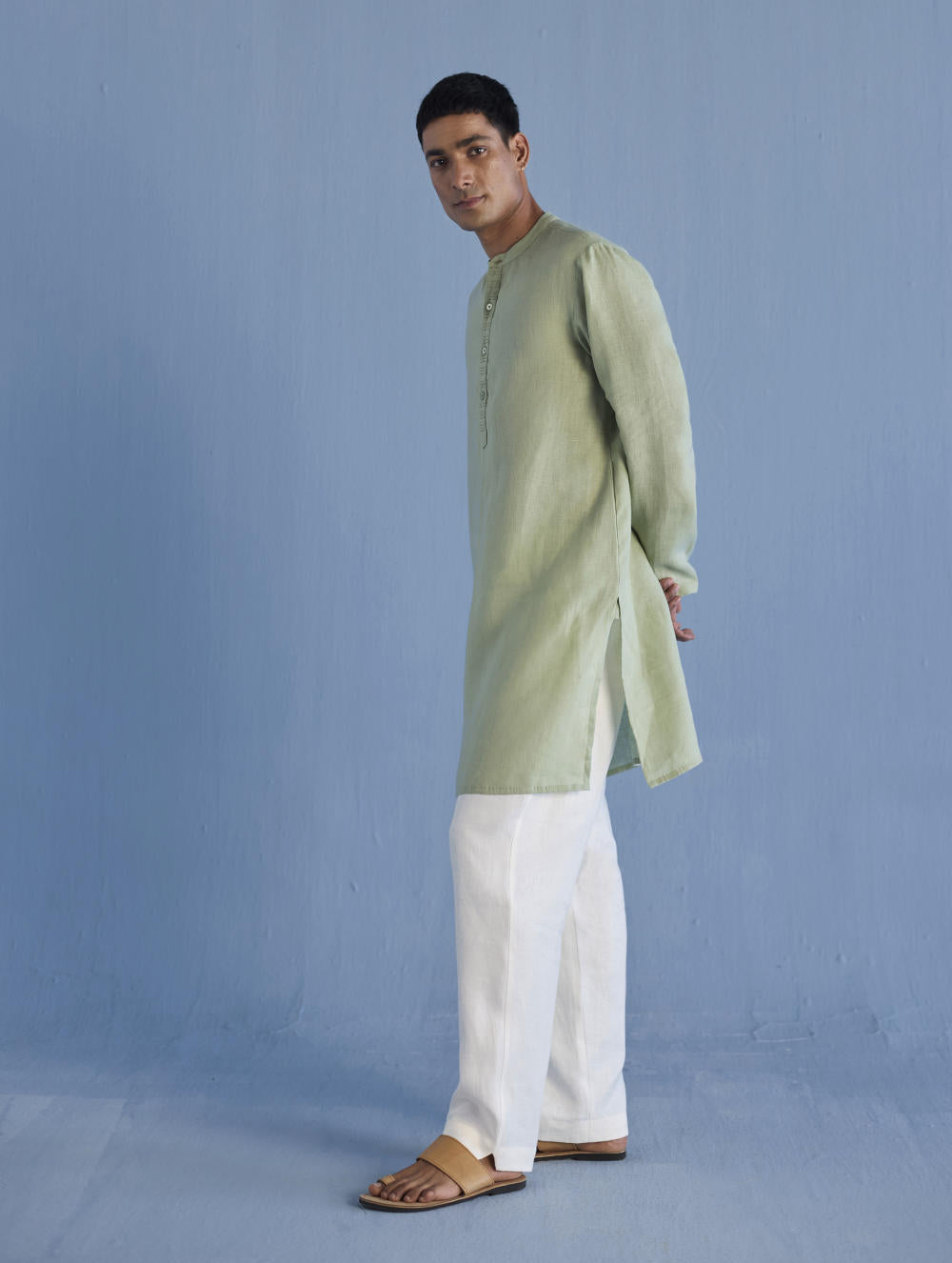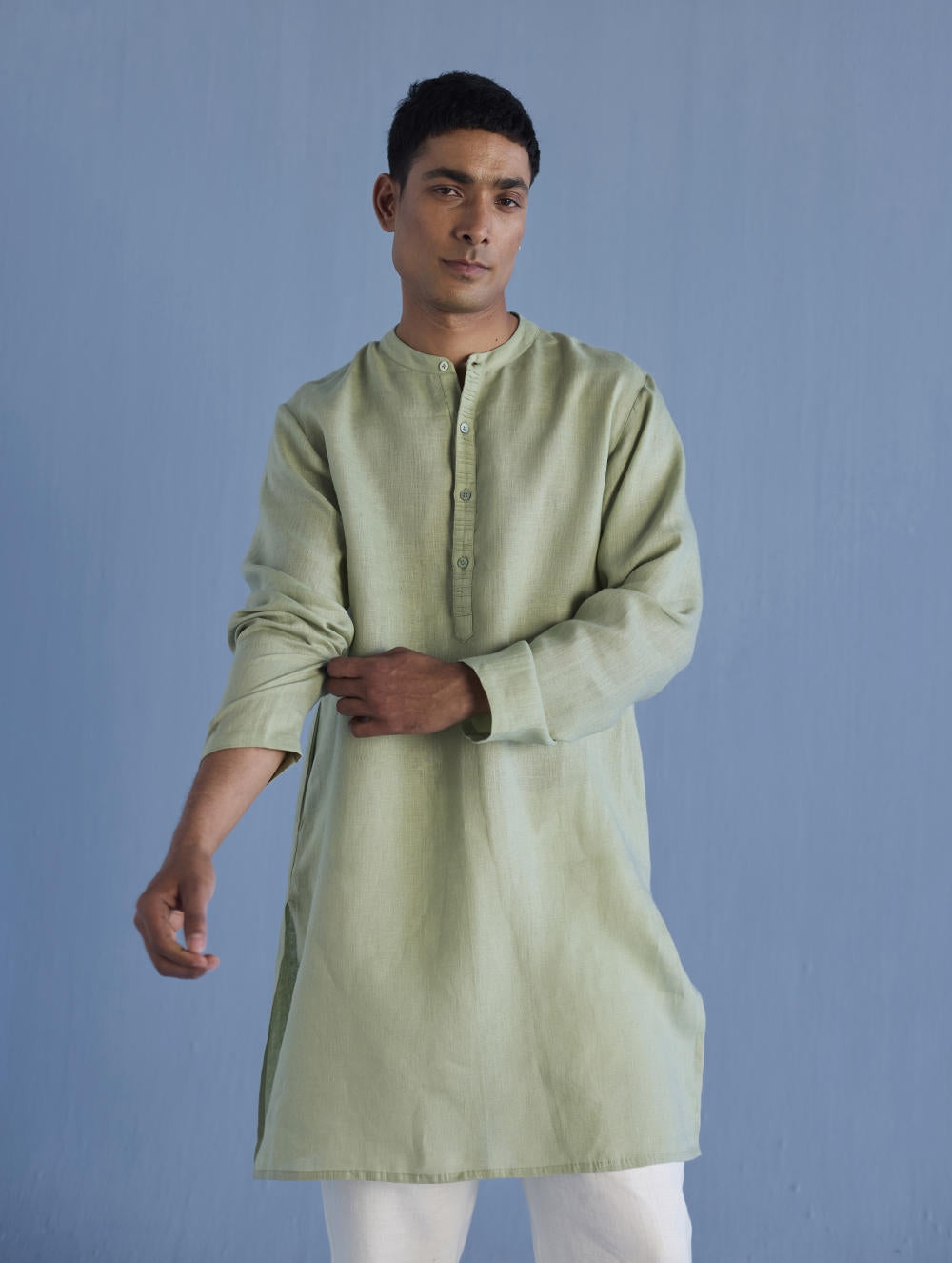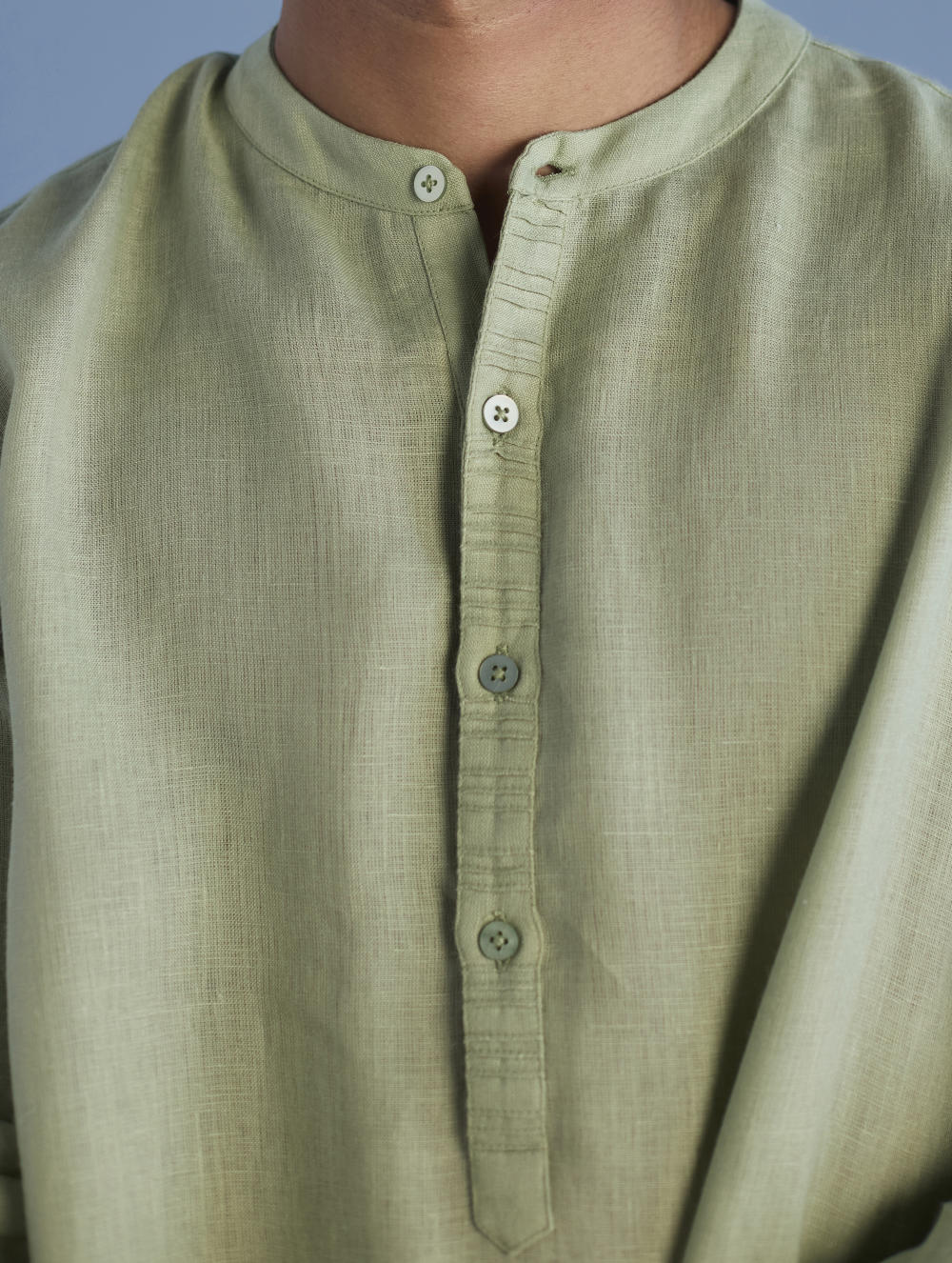 A classic mandarin collared shirt in soft pure yarn-dyed linen with fine hand pintucked details on the placket finished with tonal hand dyed buttons. Easy-to-wear and pair with denims or classic linen pants. Tailored thoughtfully for easy wearability and breathability.