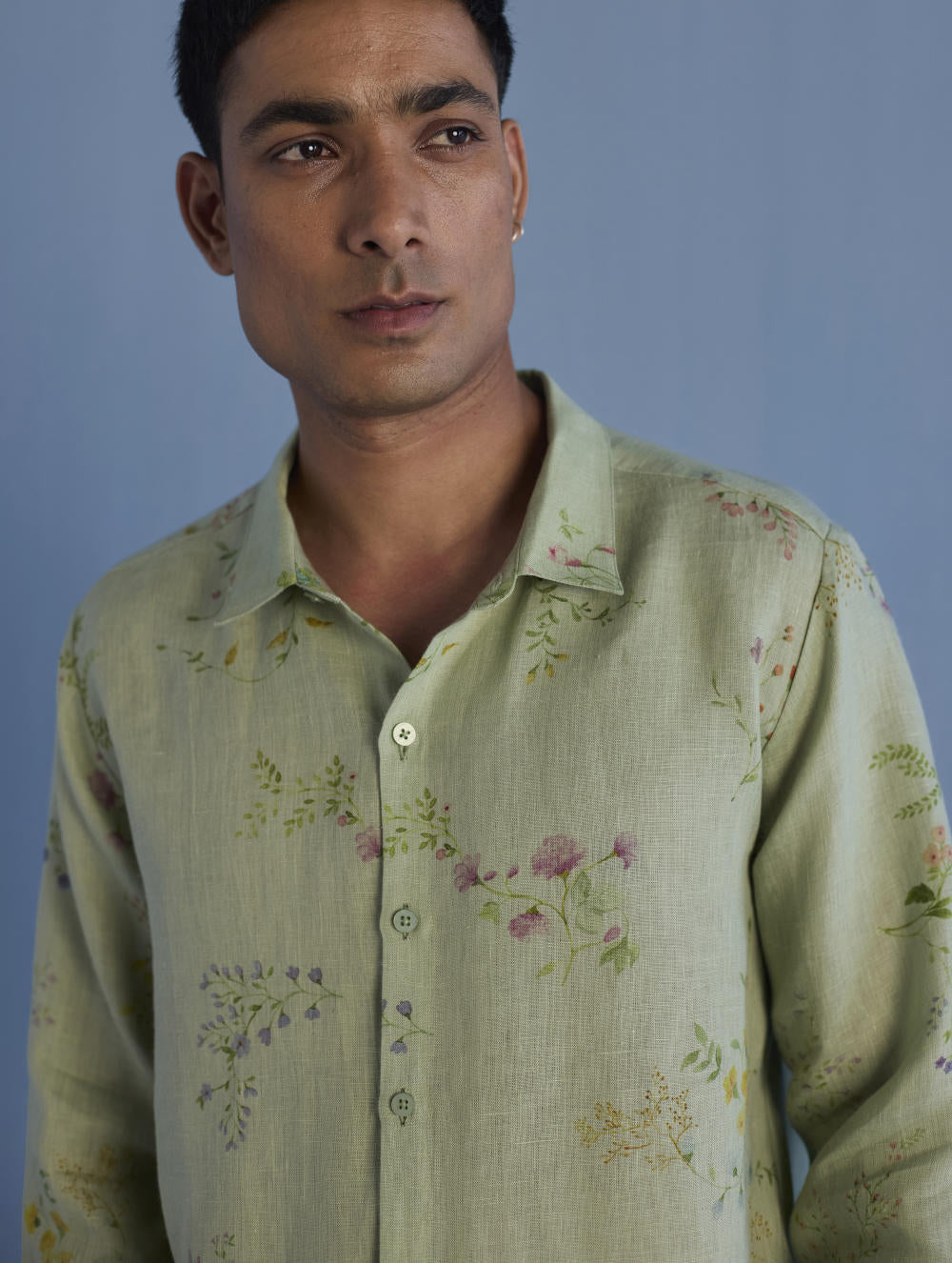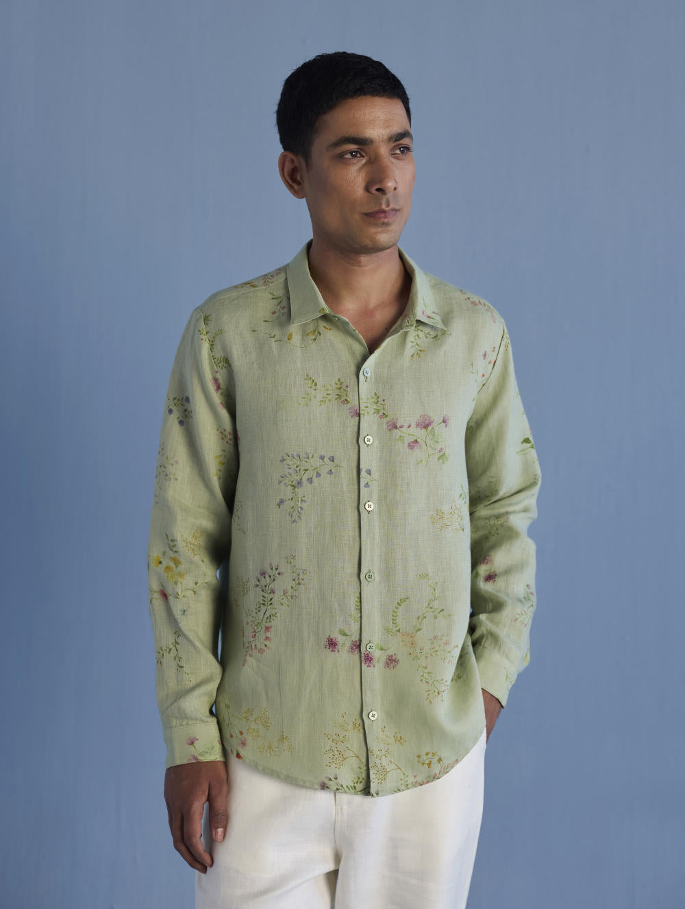 A classic collared full sleeve shirt in the softest pure yarn-dyed linen made dressy with subtle and intricate hand-embroidery - a beautiful floral border hand-embroidered with intricate thread embroidery and micro hand-embroidered beadwork running across across one side of the button placket, hemline, cuff finished with a motif on the collar. Perfect for a soft statement look.