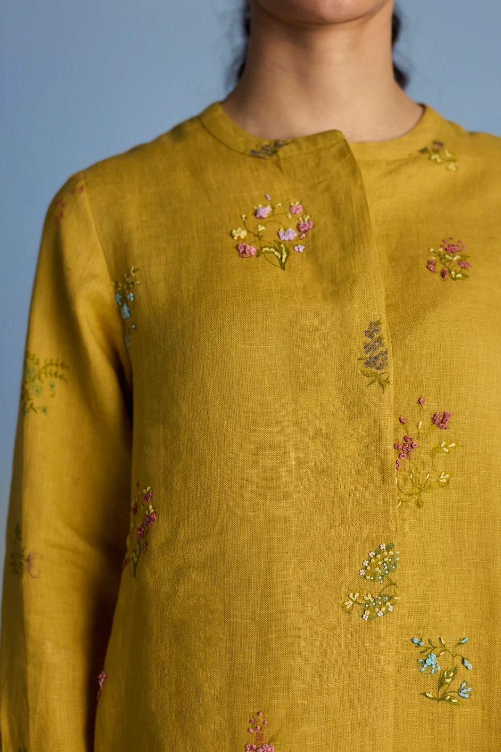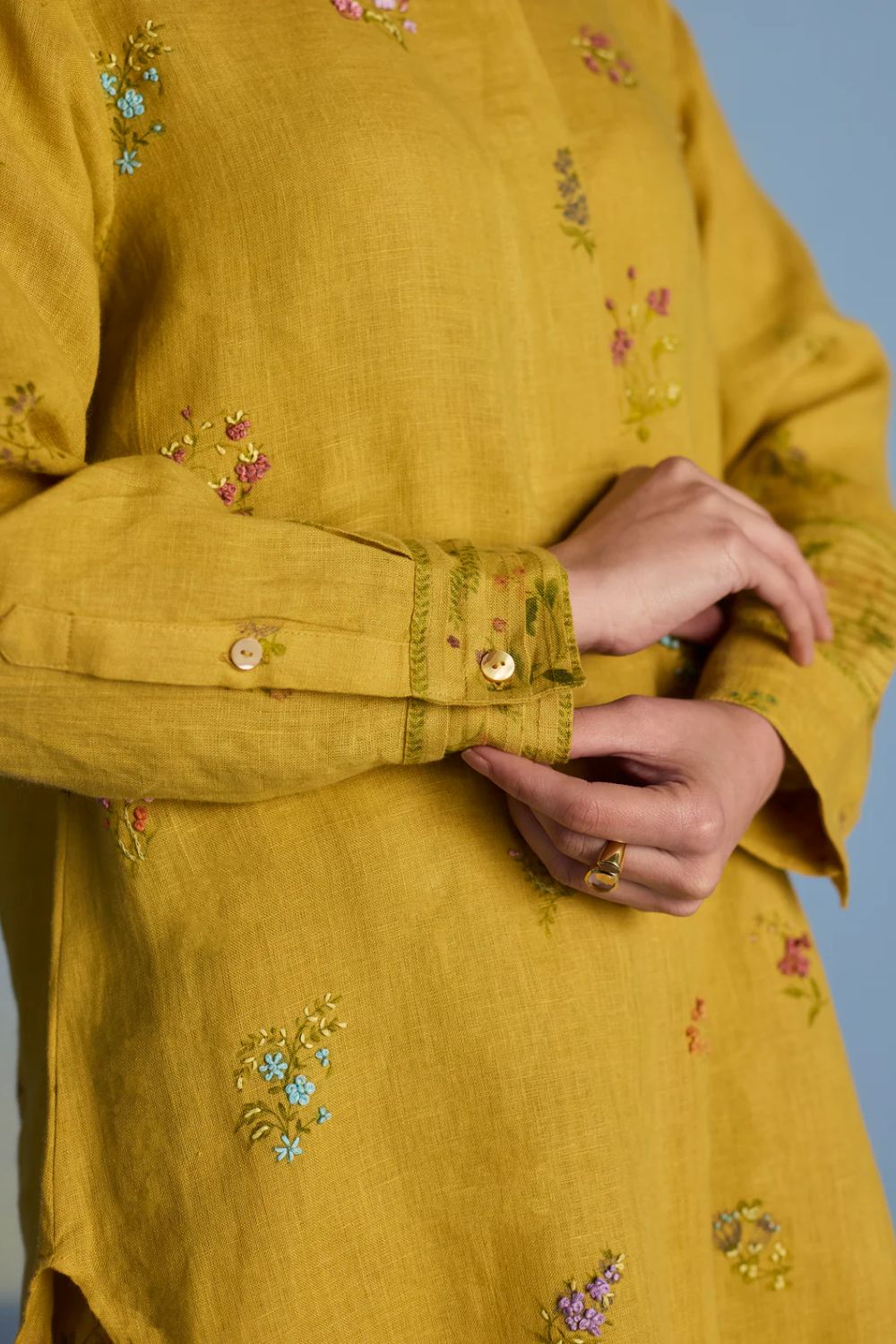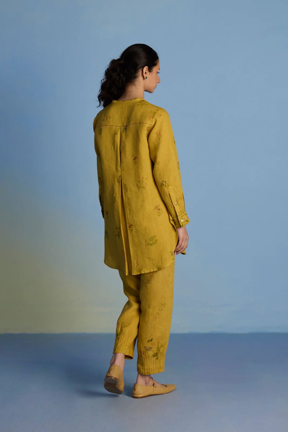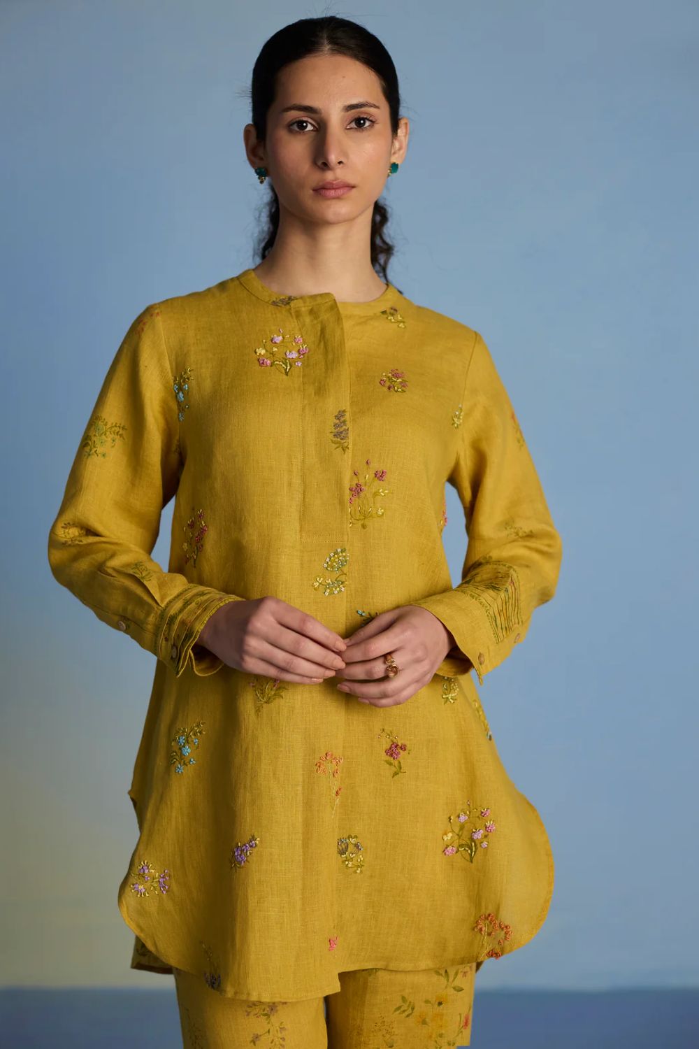 A statement short kurta crafted from our signature soft yarn-dyed linen featuring a detailed hand-painted floral print intricately hand-embroidered with beads, zardozi thread work and french knots. The kurta has a concealed placket, a stylized pleat at the back and printed border with pintucks detailing on the sleeves.