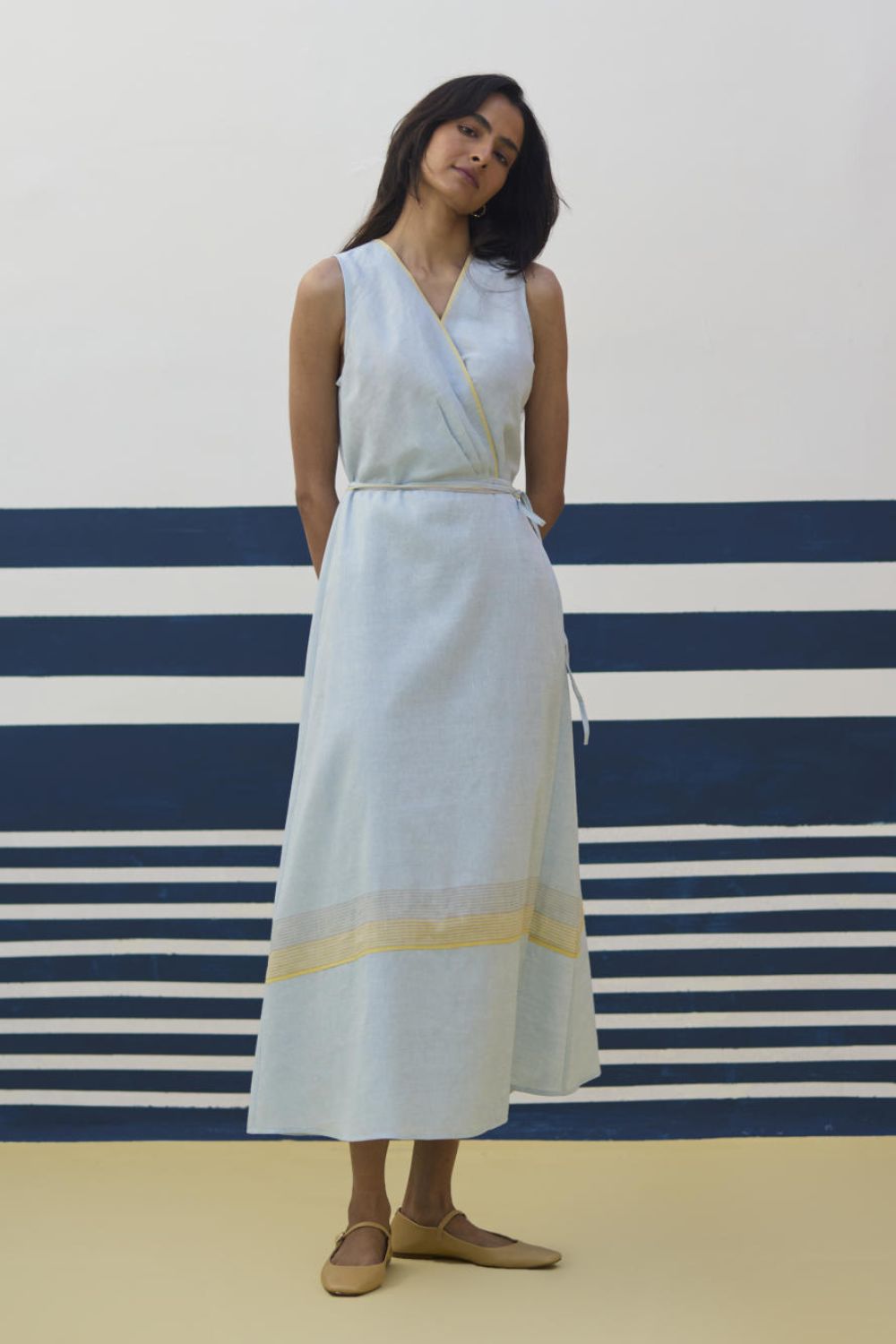 Our favourite, most versatile sleeveless wrap dress in soft handloom border linen cotton with a stripe border above the hemline and a self-woven contrast selvedge - layer it with a jacket or wear it with our statement bracelets for the perfect look.