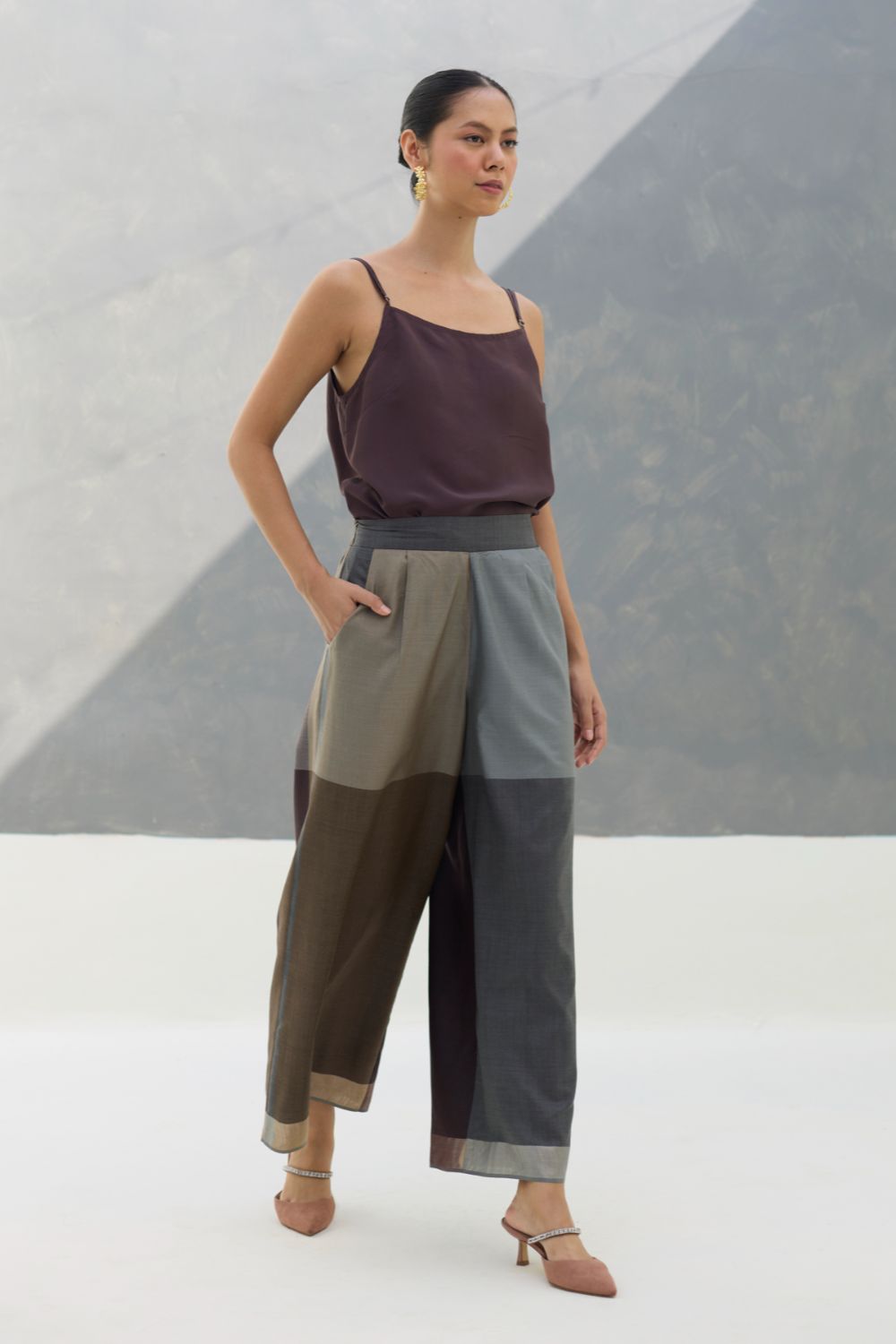 The versatile culotte is crafted in our soft handloom eri (ahimsa) silk, woven as an oversized colour-block check pattern in 4-5 shades. Designed for comfort and functionality, the culottes include a back elasticated waistband with an inside drawstring for an adjustable fit, as well as comfortable pockets. The piece is intricately finished with a subtle woven metallic border at the hem.