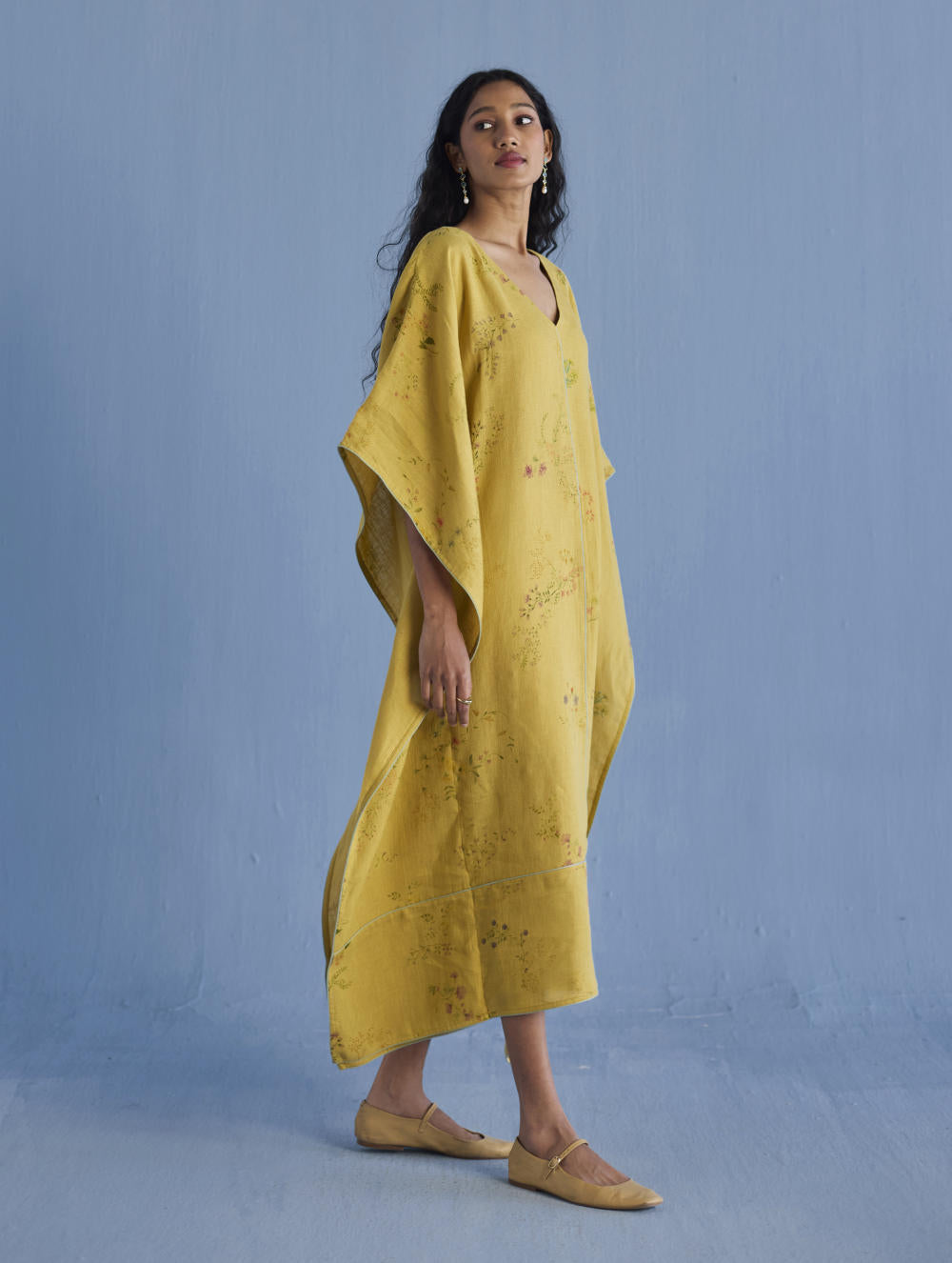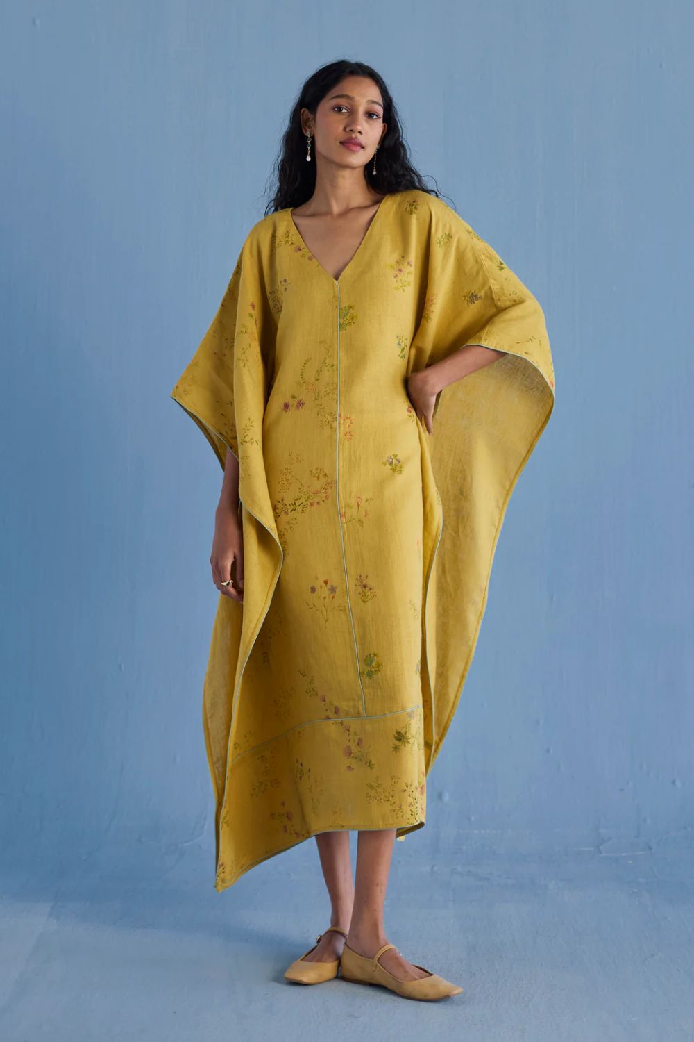 Eva Floral Linen Kaftan Dress - Ochre
