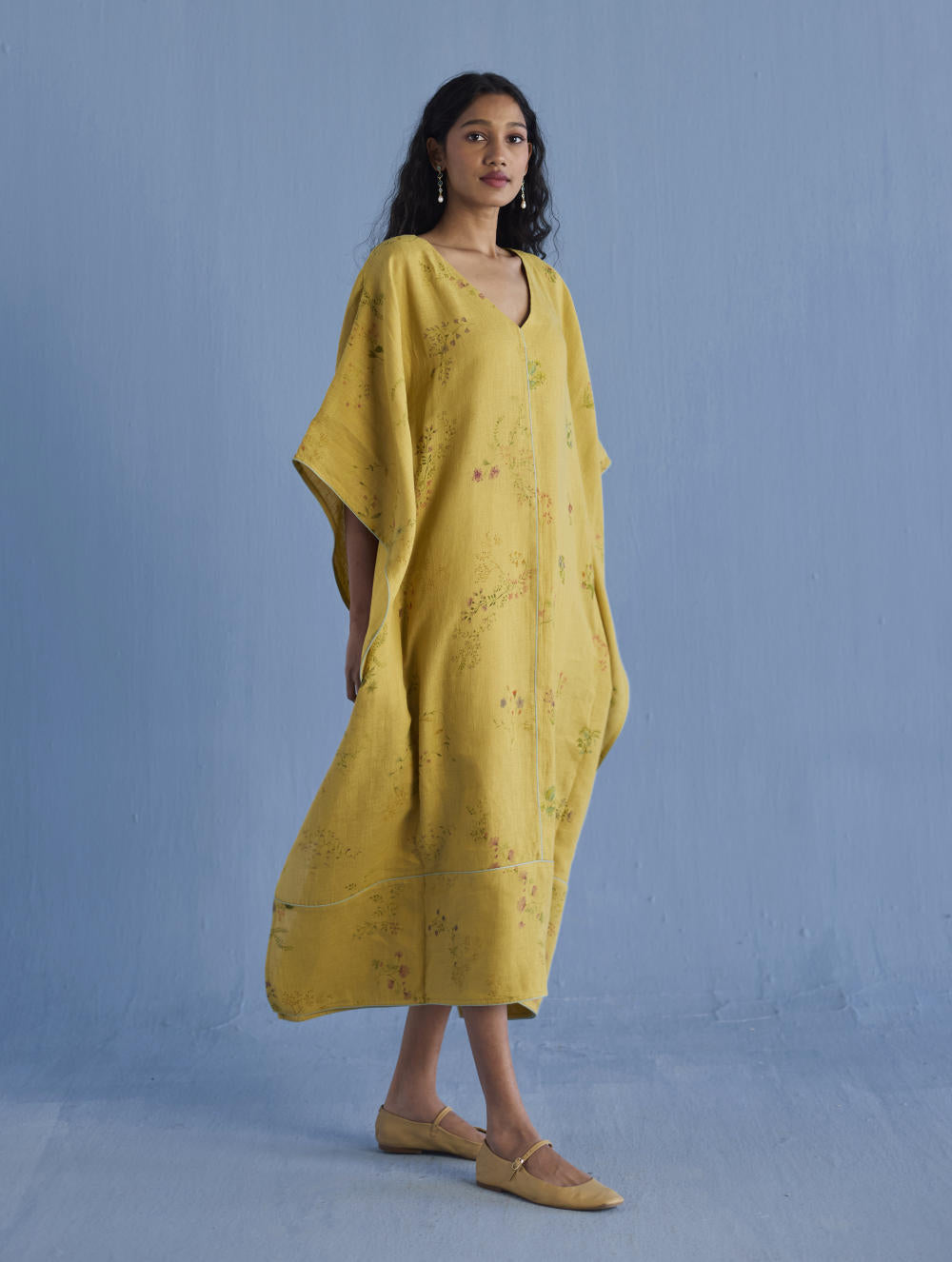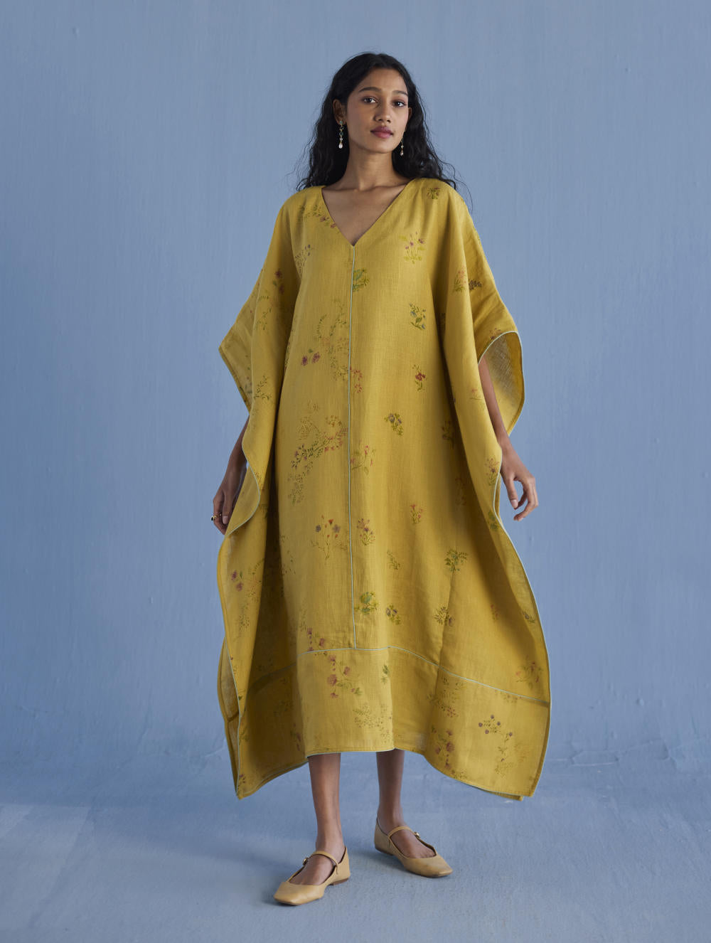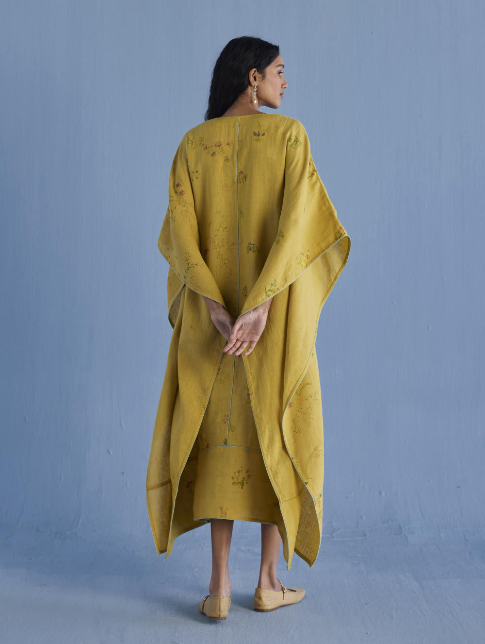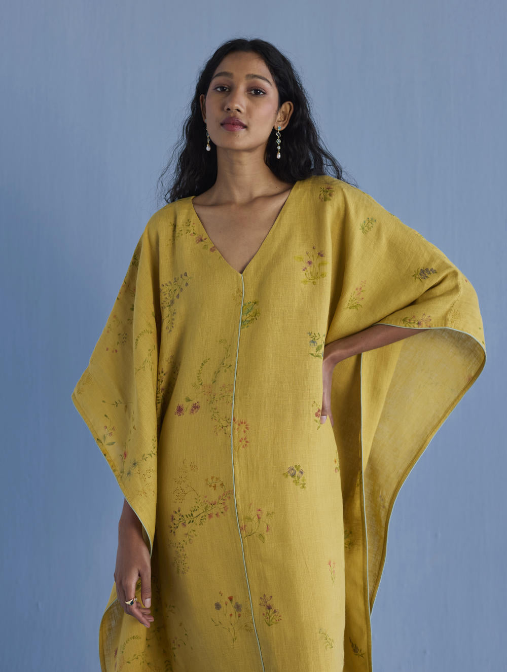 A statement kaftan designed in our signature soft yarn-dyed linen printed in two hand-painted floral prints - a jaal floral print and a buta (motif) floral print. The kaftan has comfortable pockets and is accented with an intricate contrast linen edging/piping on the front and back.