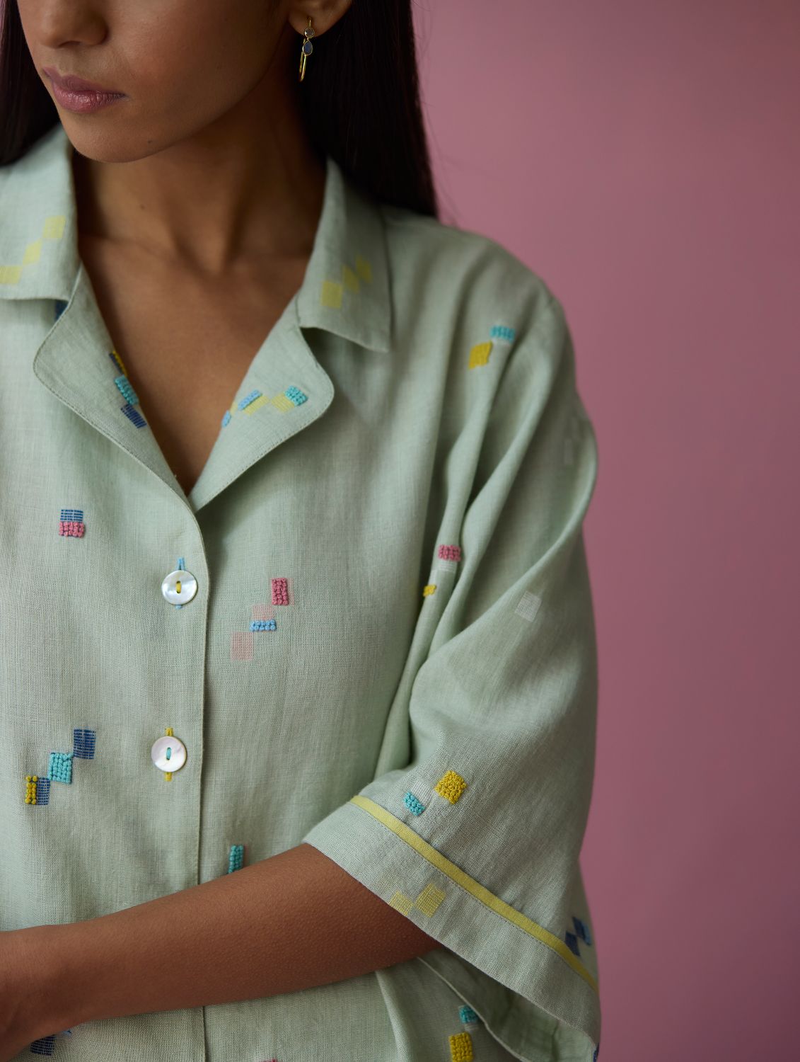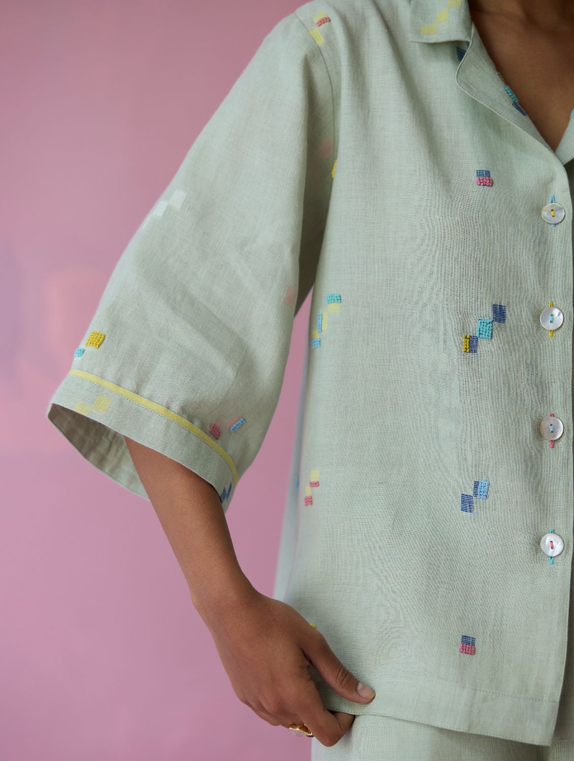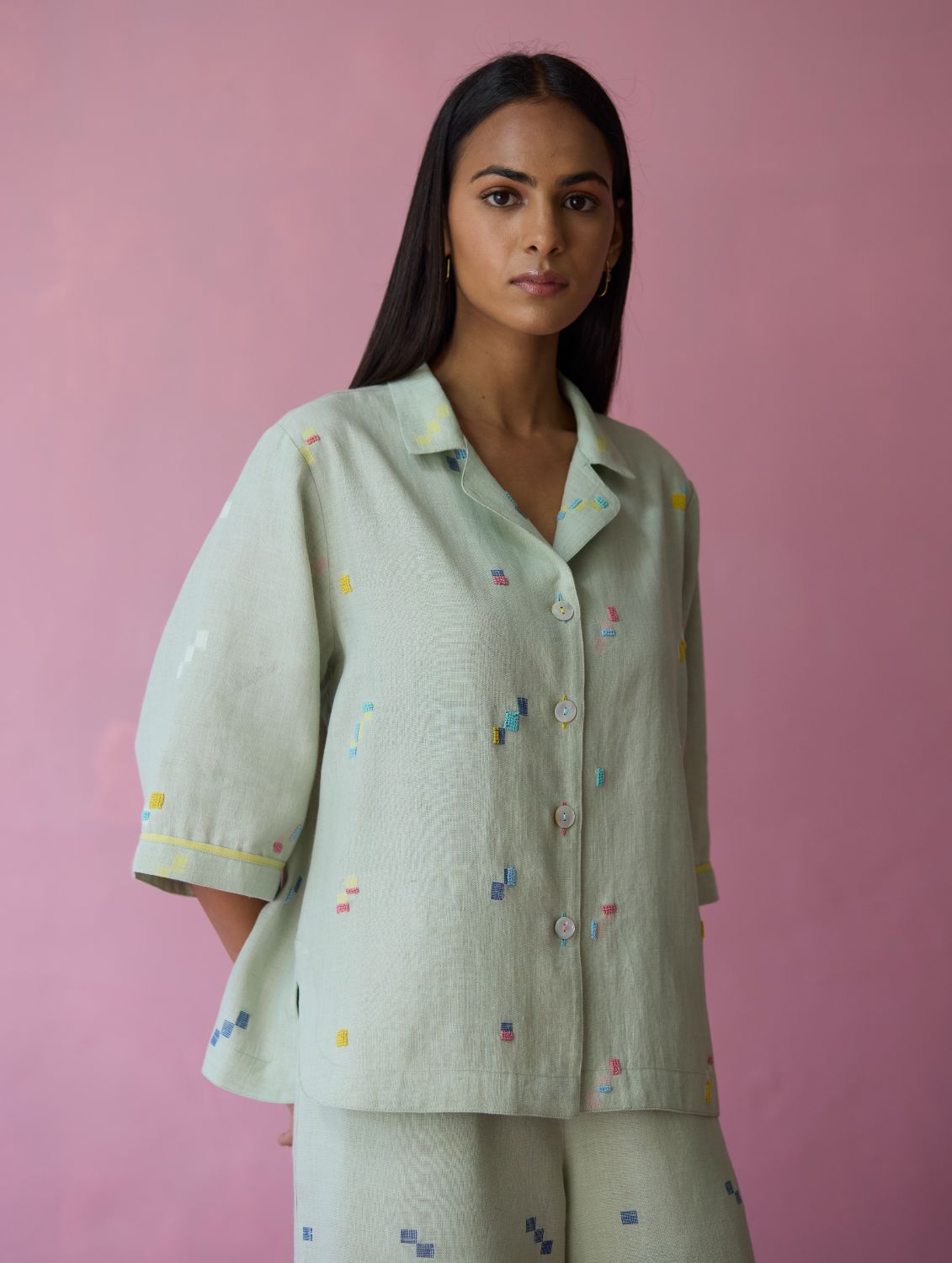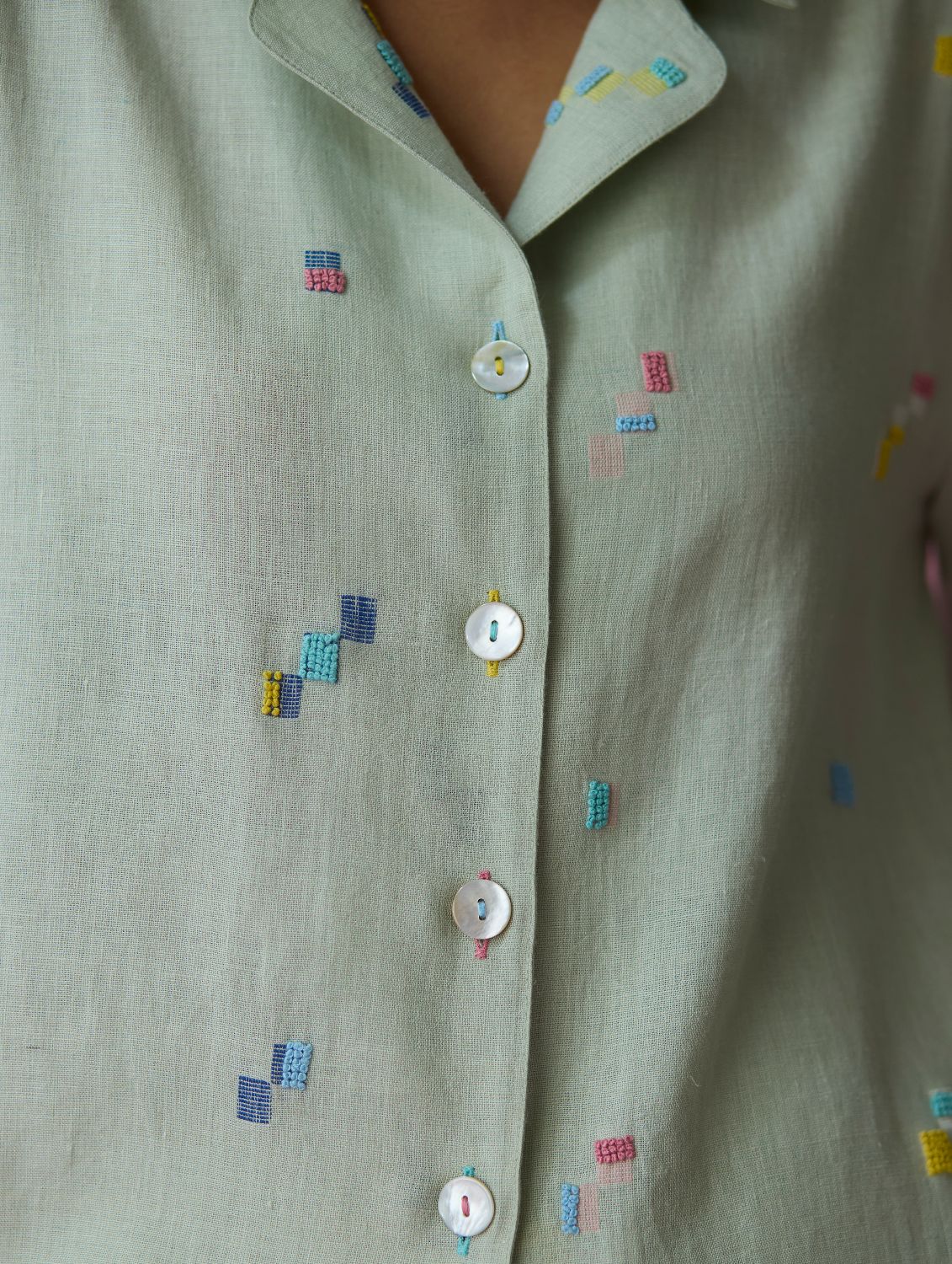 Shirt - The Imri shirt is crafted in our bespoke handloom light soft jamdani linen weave with a distinctive varying 4-colour square motif weave pattern. The weave is enhanced with intricate and multi-colour french knot embroidery on the jamdani motifs, creating gentle texture and depth. Designed in a soft structured silhouette, the Imri shirt features thoughtful woven selvedge detailing along the sleeves and is finished with statement mother-of-pearl buttons. The Imri shirt is wearable across warm humid days and is easy to layer with your wardrobe favourites.