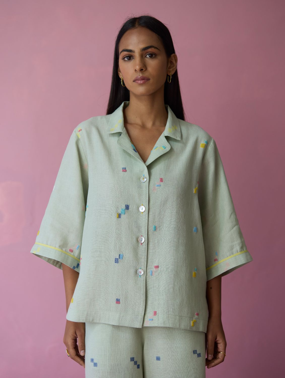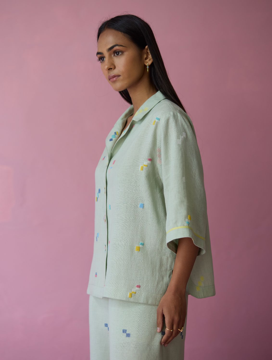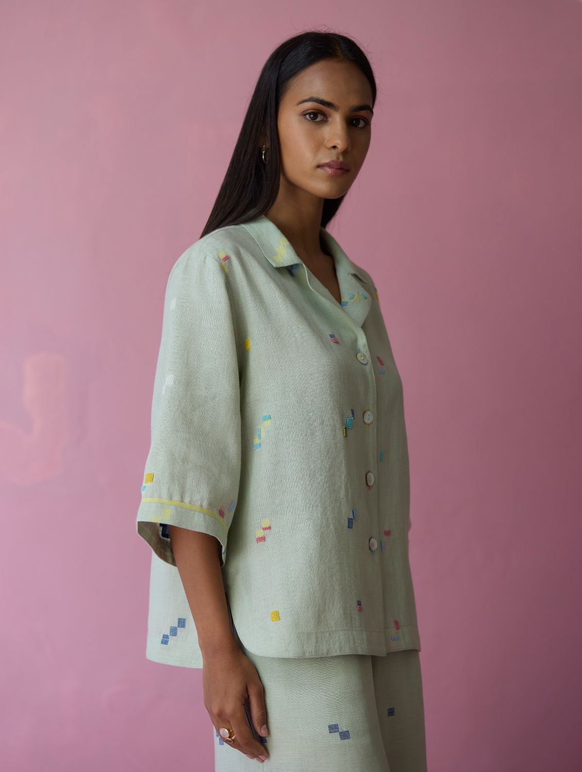 Shirt - The Imri shirt is crafted in our bespoke handloom light soft jamdani linen weave with a distinctive varying 4-colour square motif weave pattern. The weave is enhanced with intricate and multi-colour french knot embroidery on the jamdani motifs, creating gentle texture and depth. Designed in a soft structured silhouette, the Imri shirt features thoughtful woven selvedge detailing along the sleeves and is finished with statement mother-of-pearl buttons. The Imri shirt is wearable across warm humid days and is easy to layer with your wardrobe favourites.