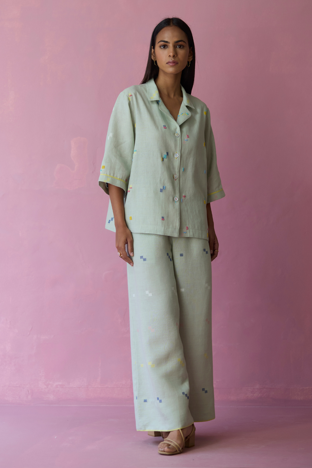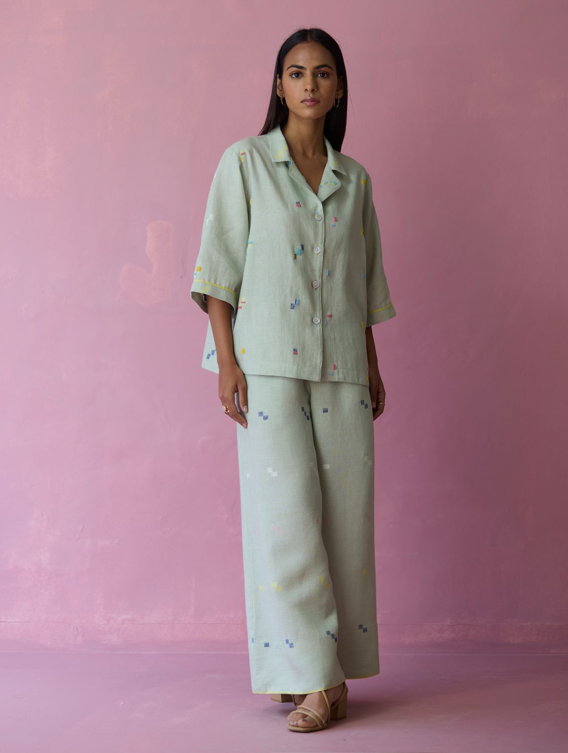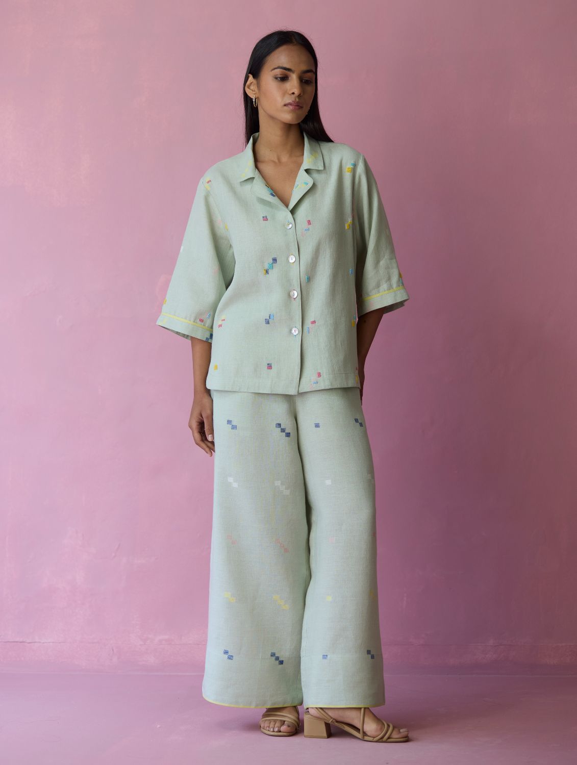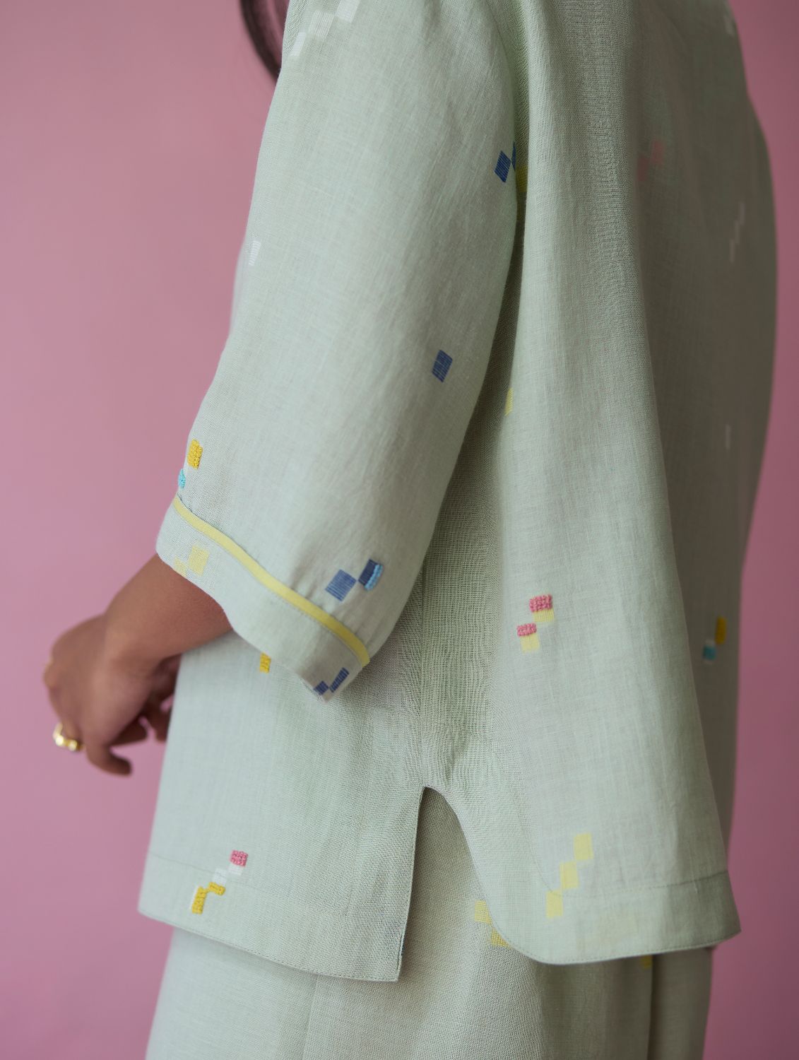 Shirt - The Imri shirt is crafted in our bespoke handloom light soft jamdani linen weave with a distinctive varying 4-colour square motif weave pattern. The weave is enhanced with intricate and multi-colour french knot embroidery on the jamdani motifs, creating gentle texture and depth. Designed in a soft structured silhouette, the Imri shirt features thoughtful woven selvedge detailing along the sleeves and is finished with statement mother-of-pearl buttons. The Imri shirt is wearable across warm humid days and is easy to layer with your wardrobe favourites.