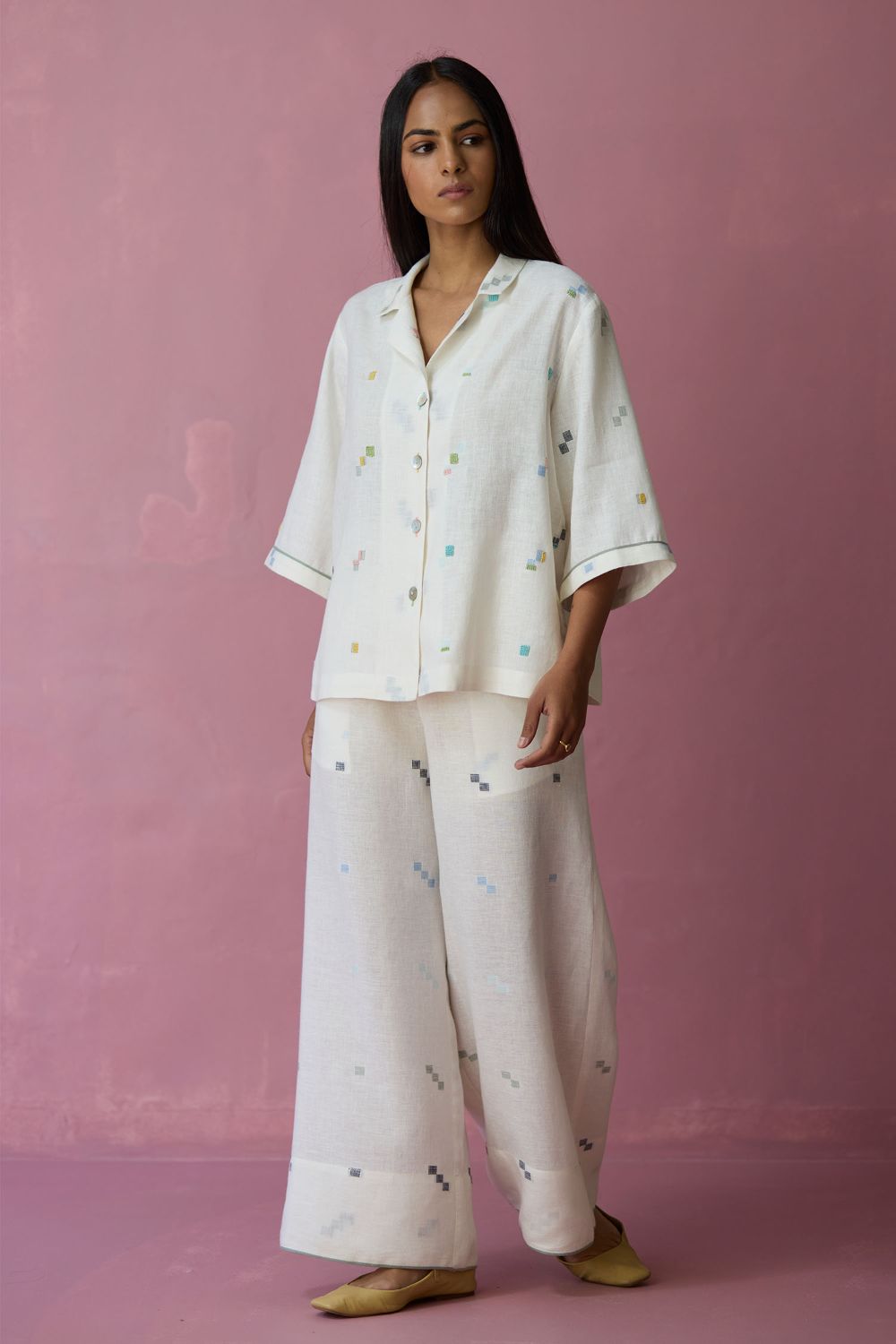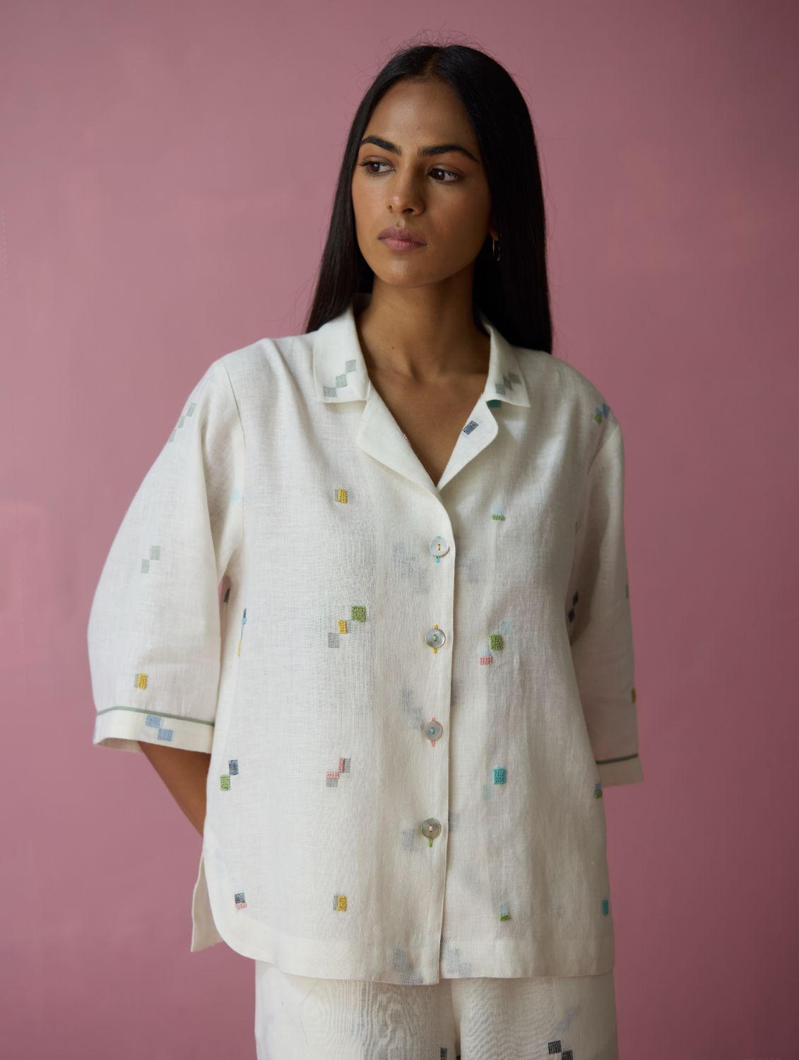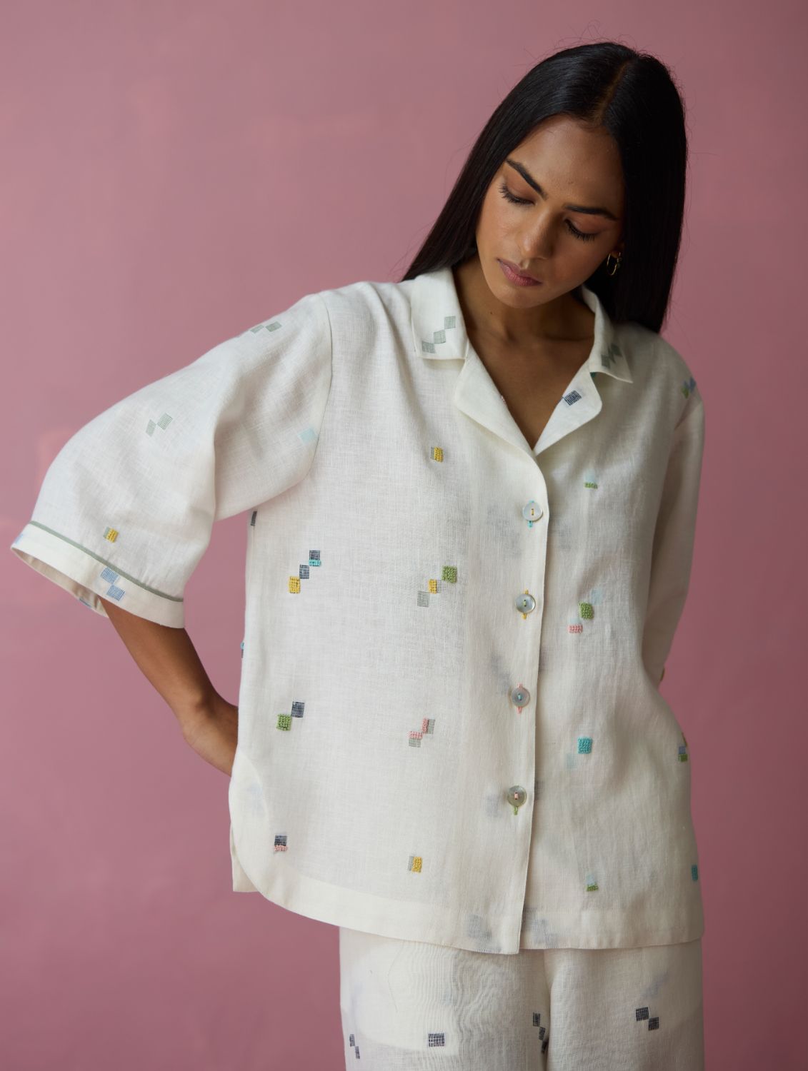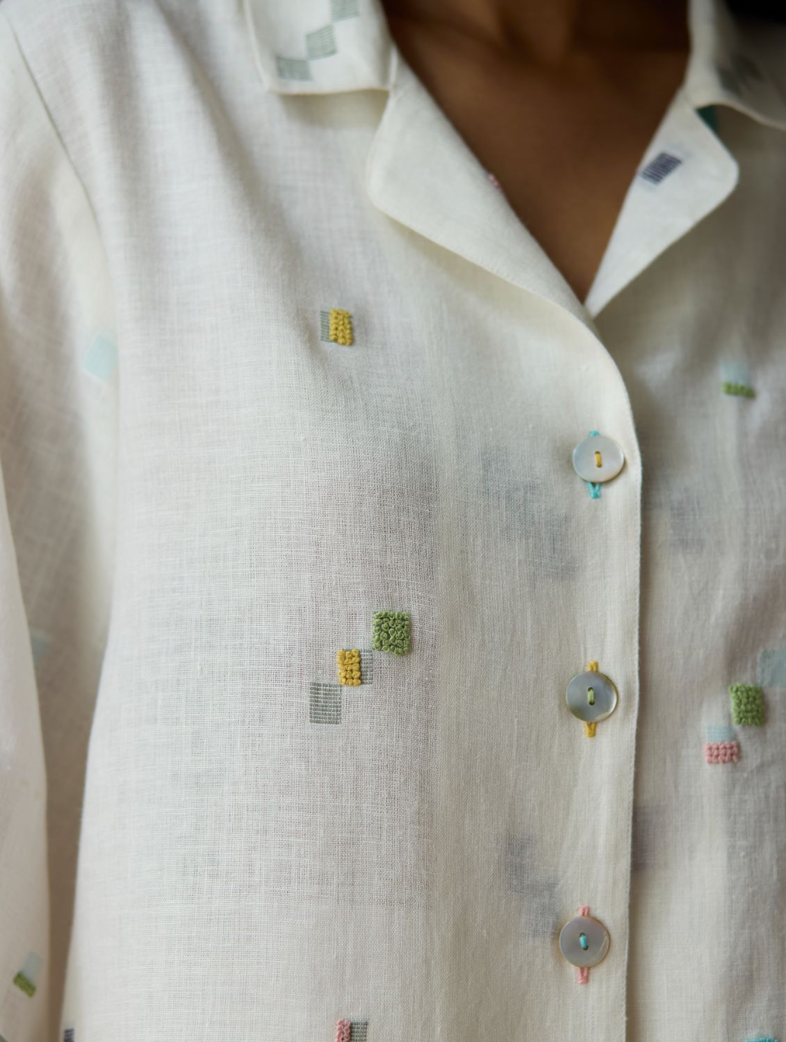 Shirt - The Imri shirt is crafted in our bespoke handloom light soft jamdani linen weave with a distinctive varying 4-colour square motif weave pattern. The weave is enhanced with intricate and multi-colour french knot embroidery on the jamdani motifs, creating gentle texture and depth. Designed in a soft structured silhouette, the Imri shirt features thoughtful woven selvedge detailing along the sleeves and is finished with statement mother-of-pearl buttons. The Imri shirt is wearable across warm humid days and is easy to layer with your wardrobe favourites.