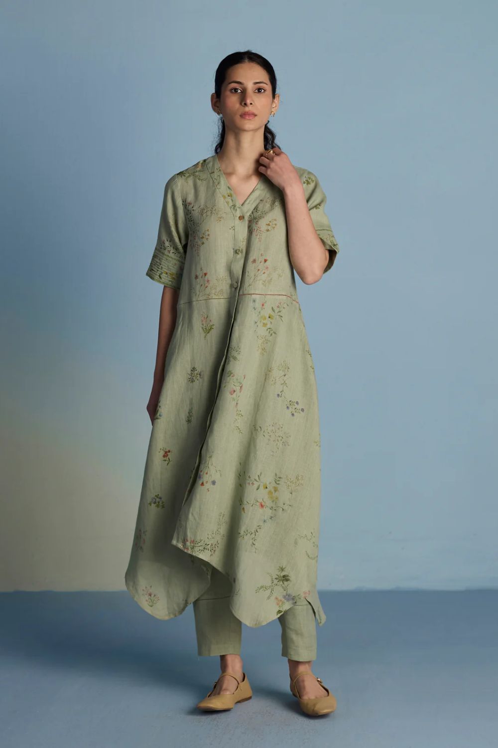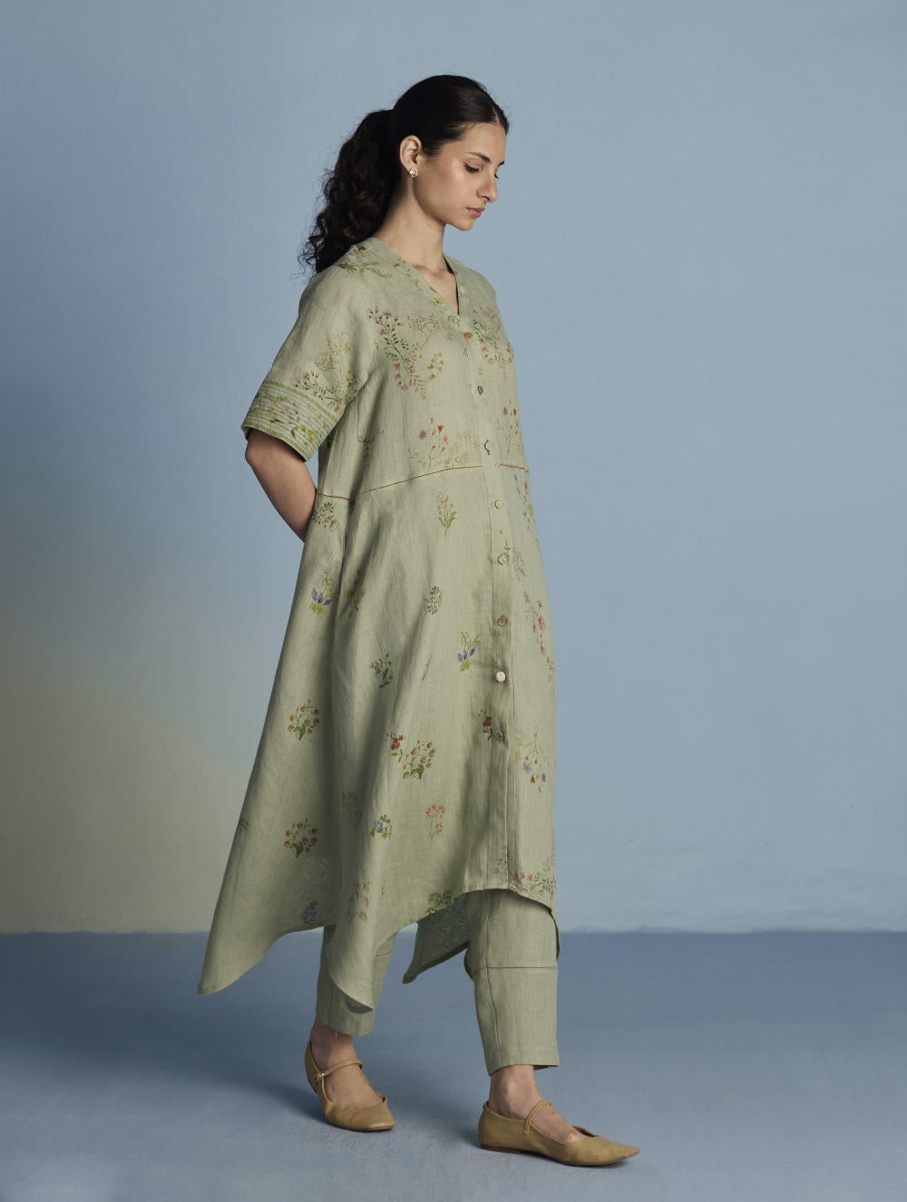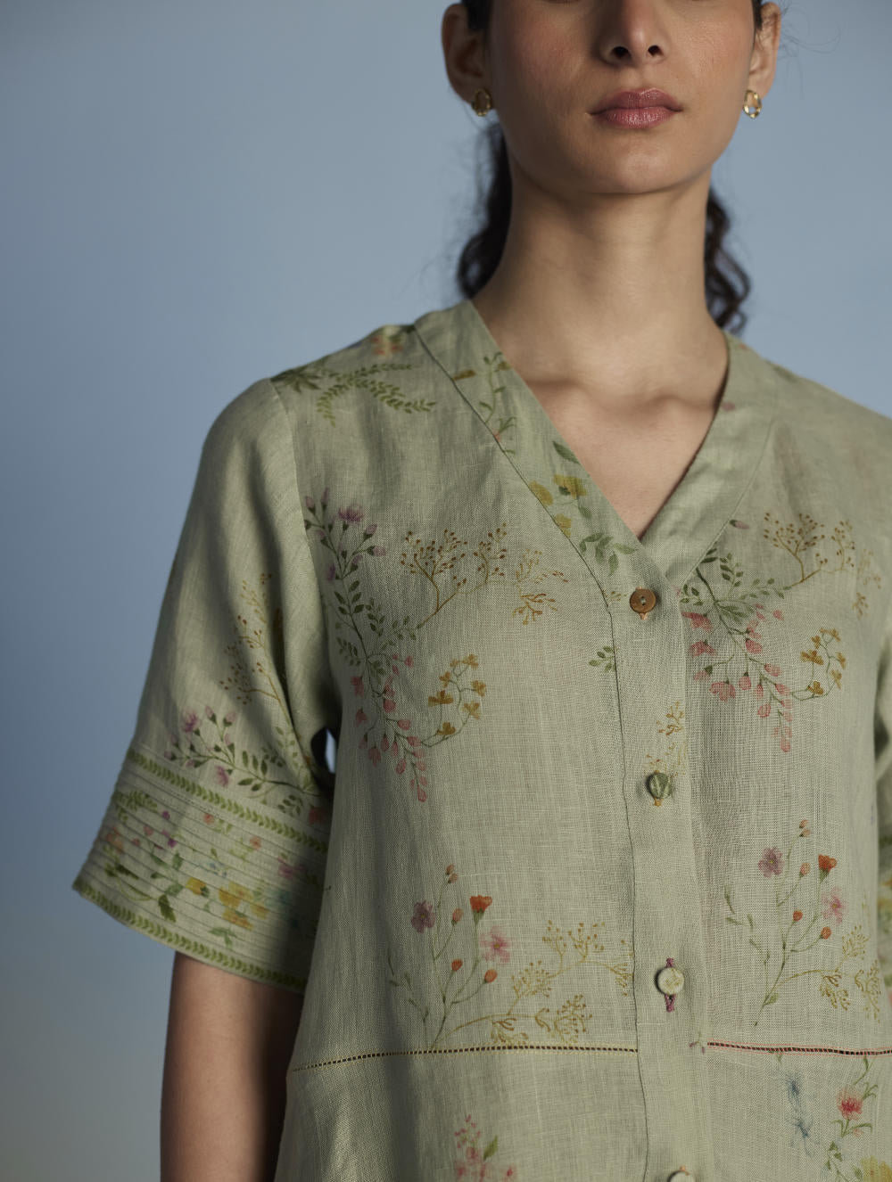 A unique button down shirt kurta crafted from our signature soft yarn-dyed linen printed in two hand-painted floral prints - a jaal floral print and a buta (motif) floral print - finished with an up-and-down curved hemline, pockets and linen fabric buttons and a crochet button. The Inoya shirt kurta is accented with pop-coloured hand fagotting stitch details on the front and back.