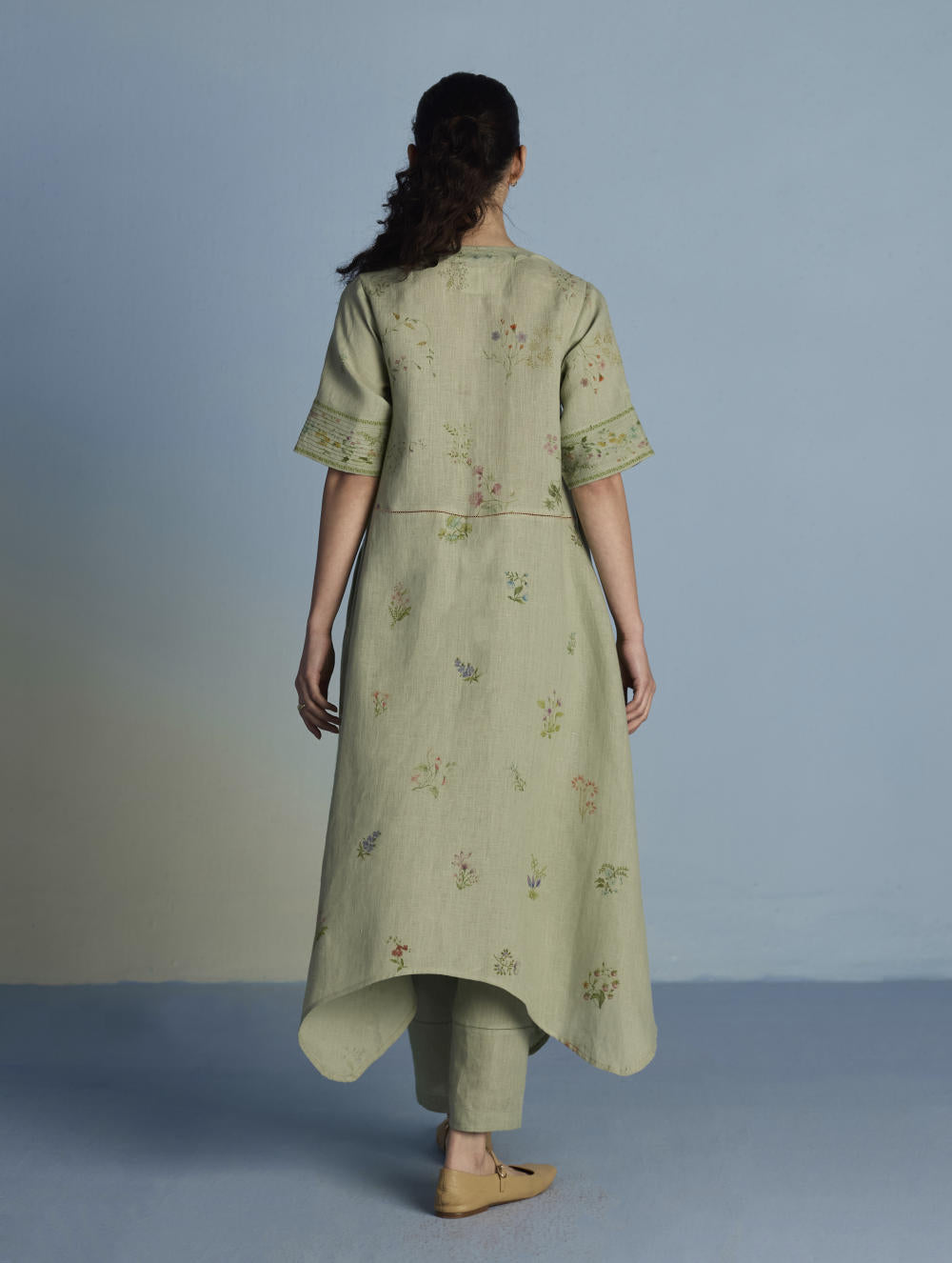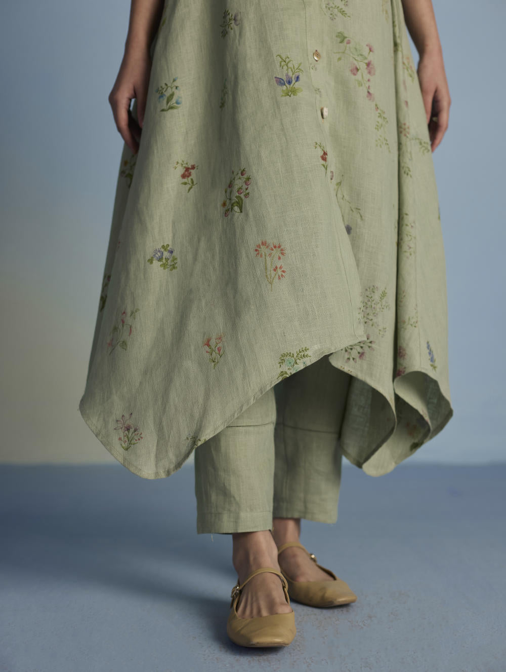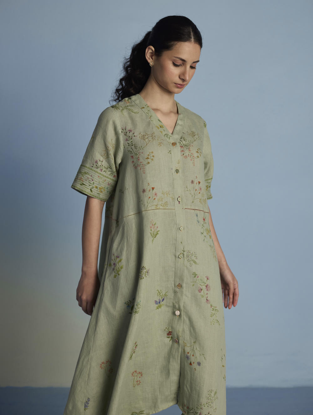 A unique button down shirt kurta crafted from our signature soft yarn-dyed linen printed in two hand-painted floral prints - a jaal floral print and a buta (motif) floral print - finished with an up-and-down curved hemline, pockets and linen fabric buttons and a crochet button. The Inoya shirt kurta is accented with pop-coloured hand fagotting stitch details on the front and back.