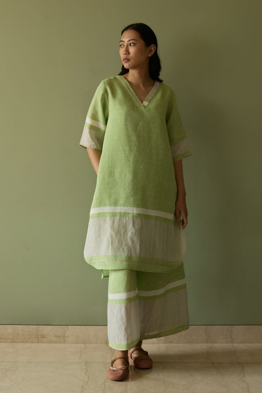 This timeless versatile kurta is designed in our bespoke handwoven soft metallic border linen with a grey selvedge. The Iva Kurta has pockets and is accented with a metallic border at the hemline with a woven grey edging placed at the hemline, neckline and sleeves. The Iva works for all occasions and is one of our year-round favourites.