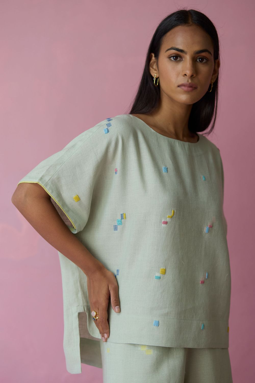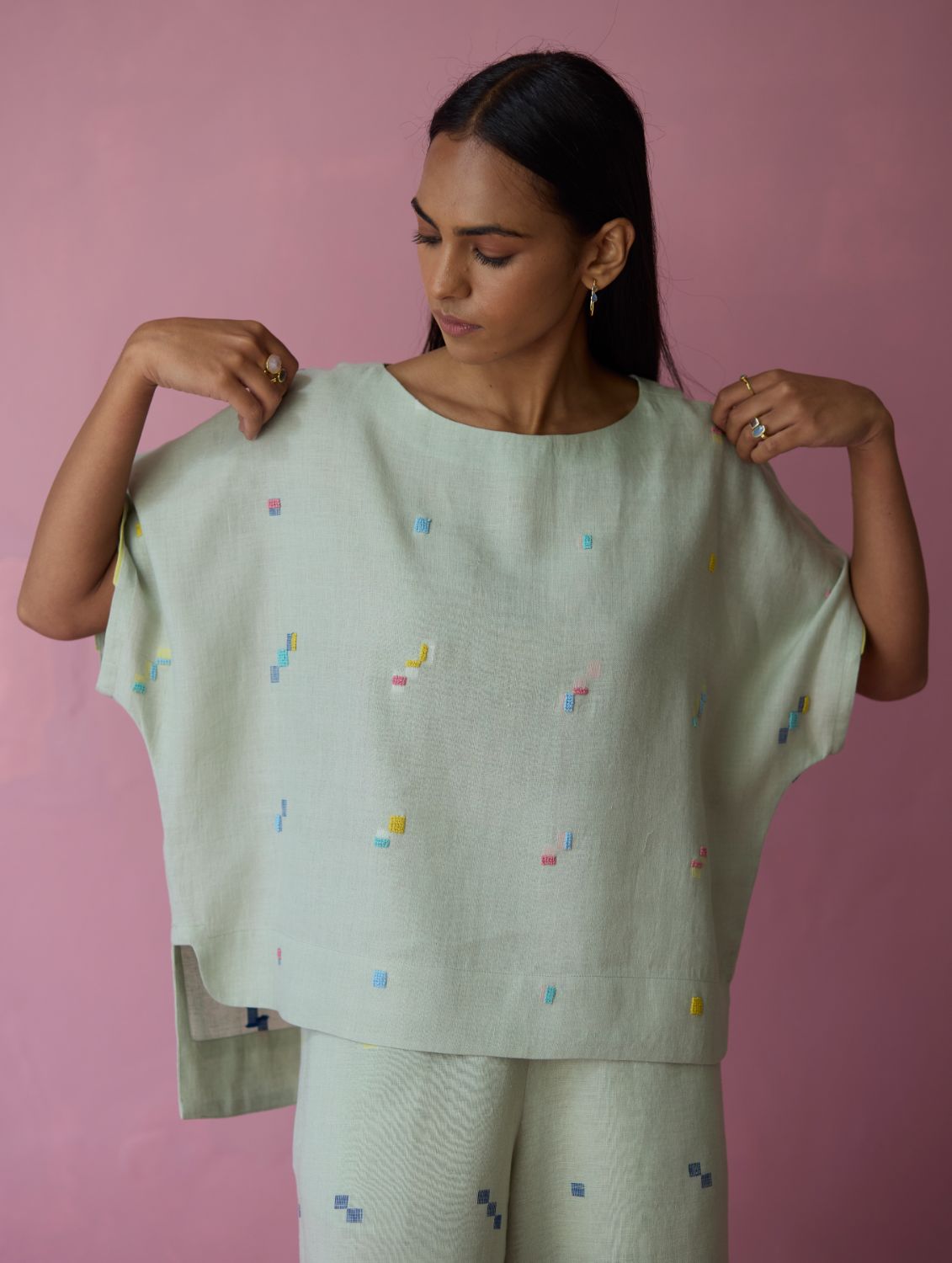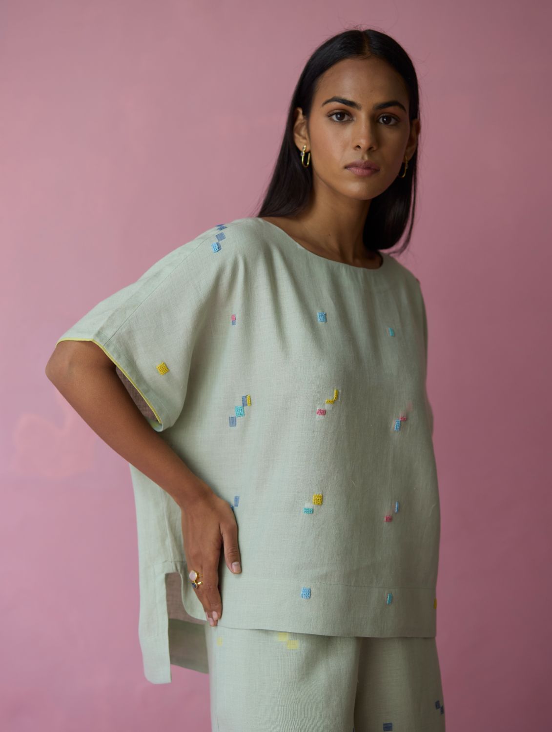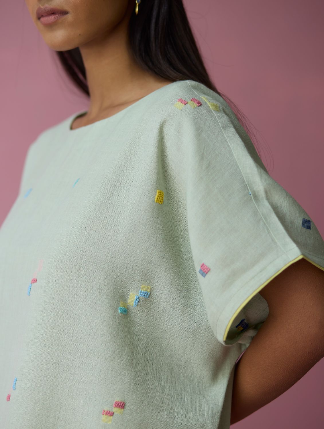 Top - The Kanni top is thoughtfully crafted in our handwoven soft jamdani linen weave with a distinctive varying 4-colour square motif weave pattern. Designed with a boat neckline and a relaxed silhouette, the Kanni has colourful and intricate french knot embroidery delicately scattered across the jamdani motifs in multiple colours. The top is finished with an uneven side slit for movement and flow, while a woven selvedge edging at the sleeve hem adds a contrast. A timeless breathable piece designed for effortless everyday wear.