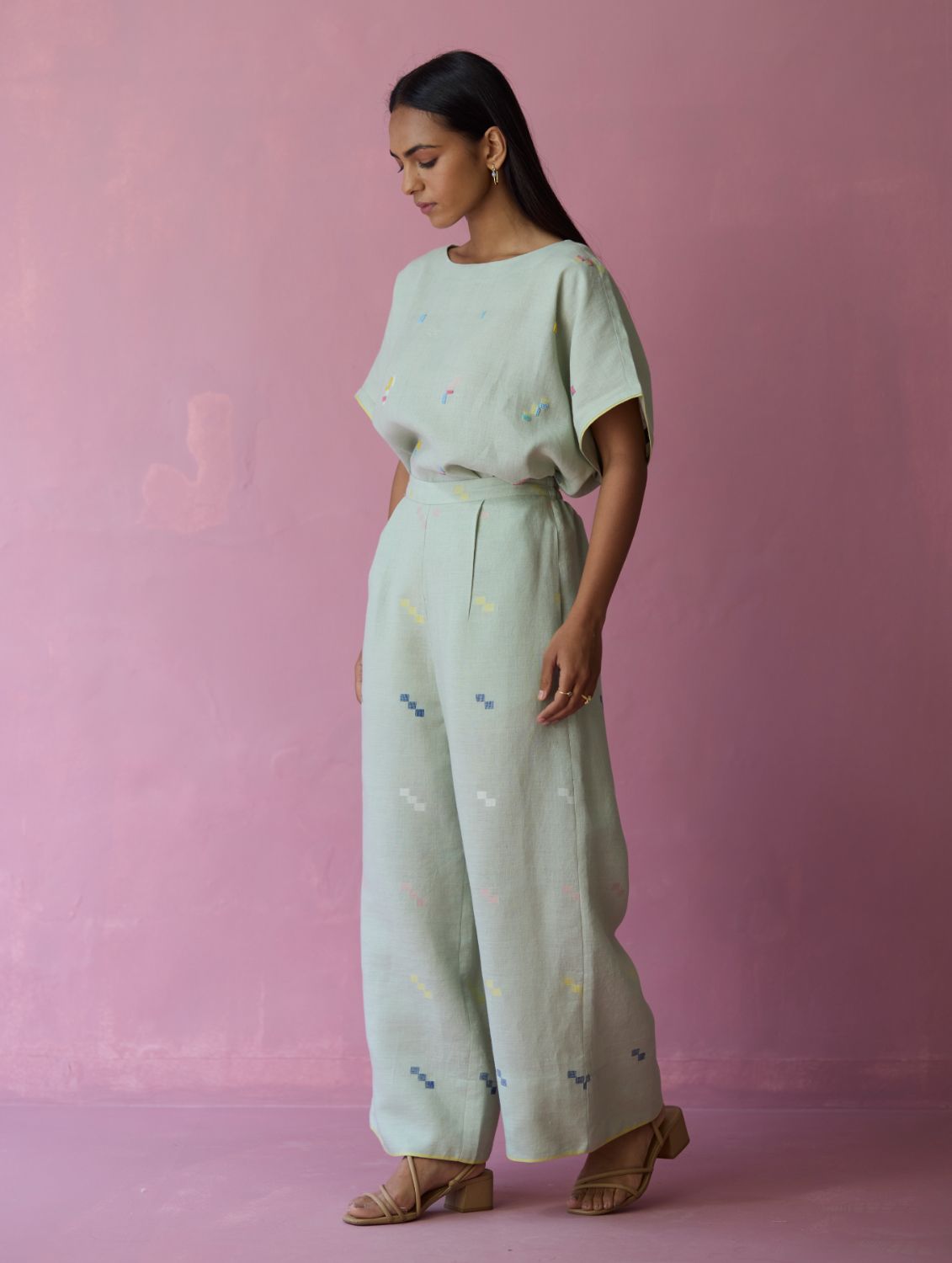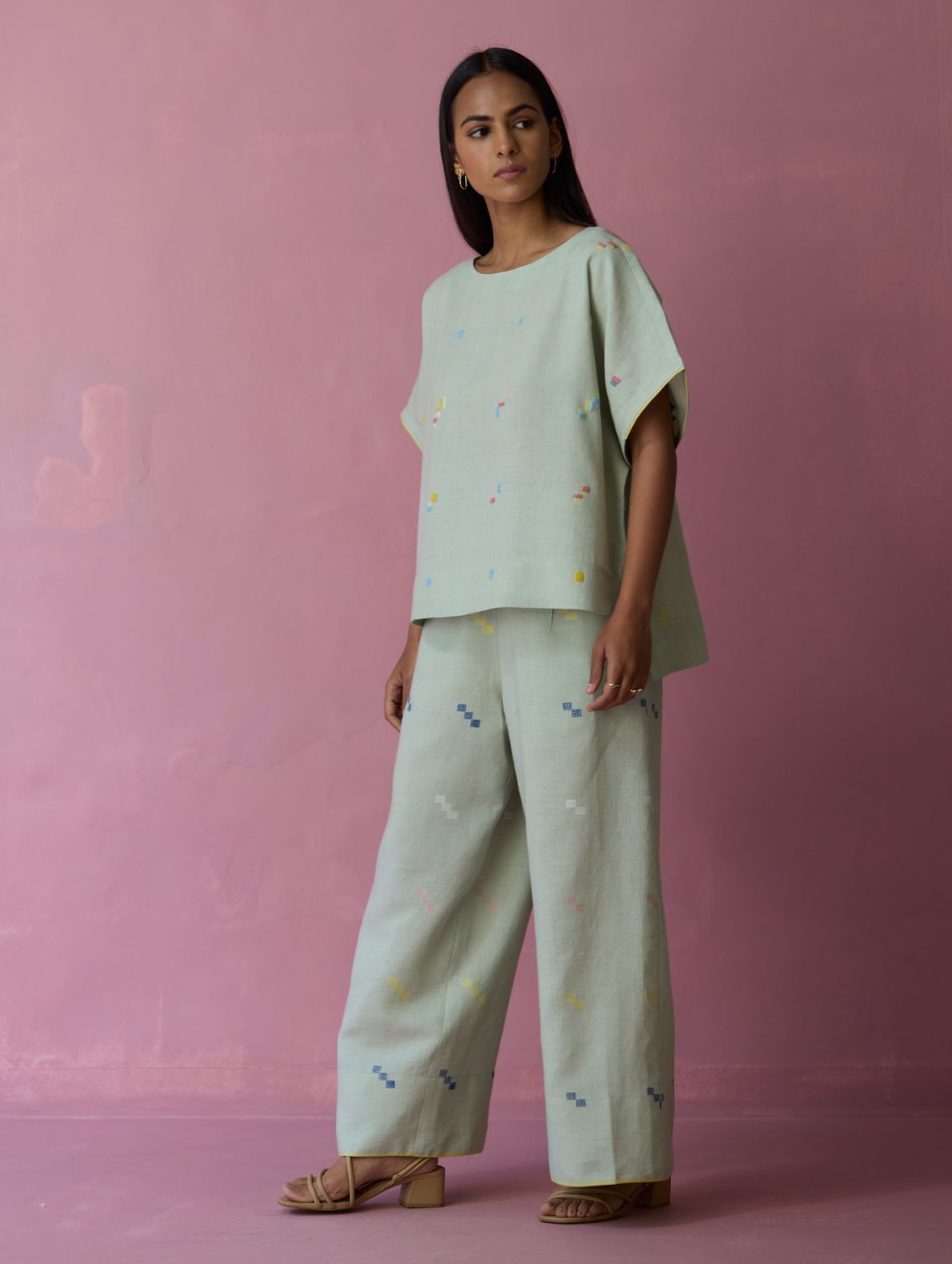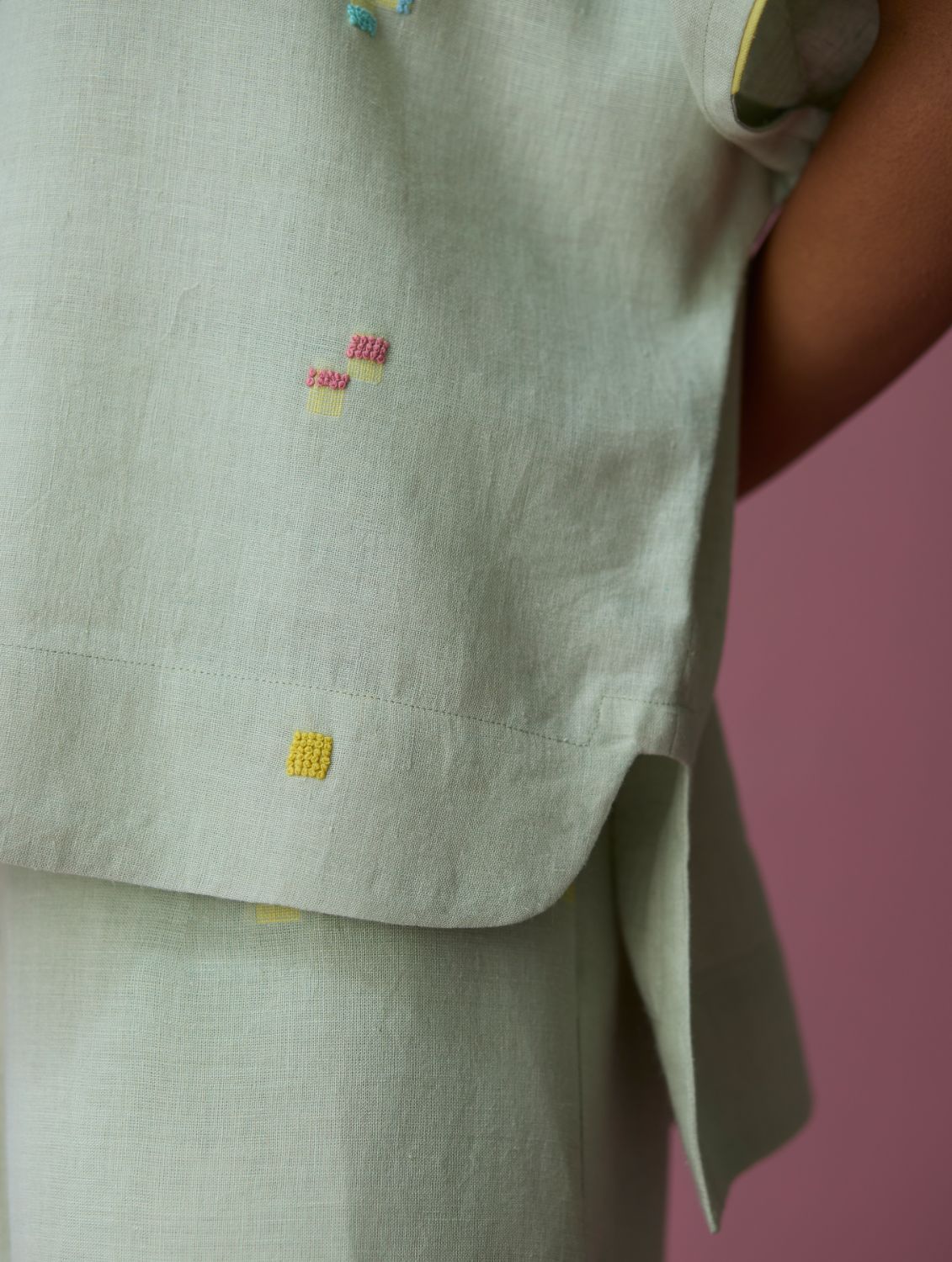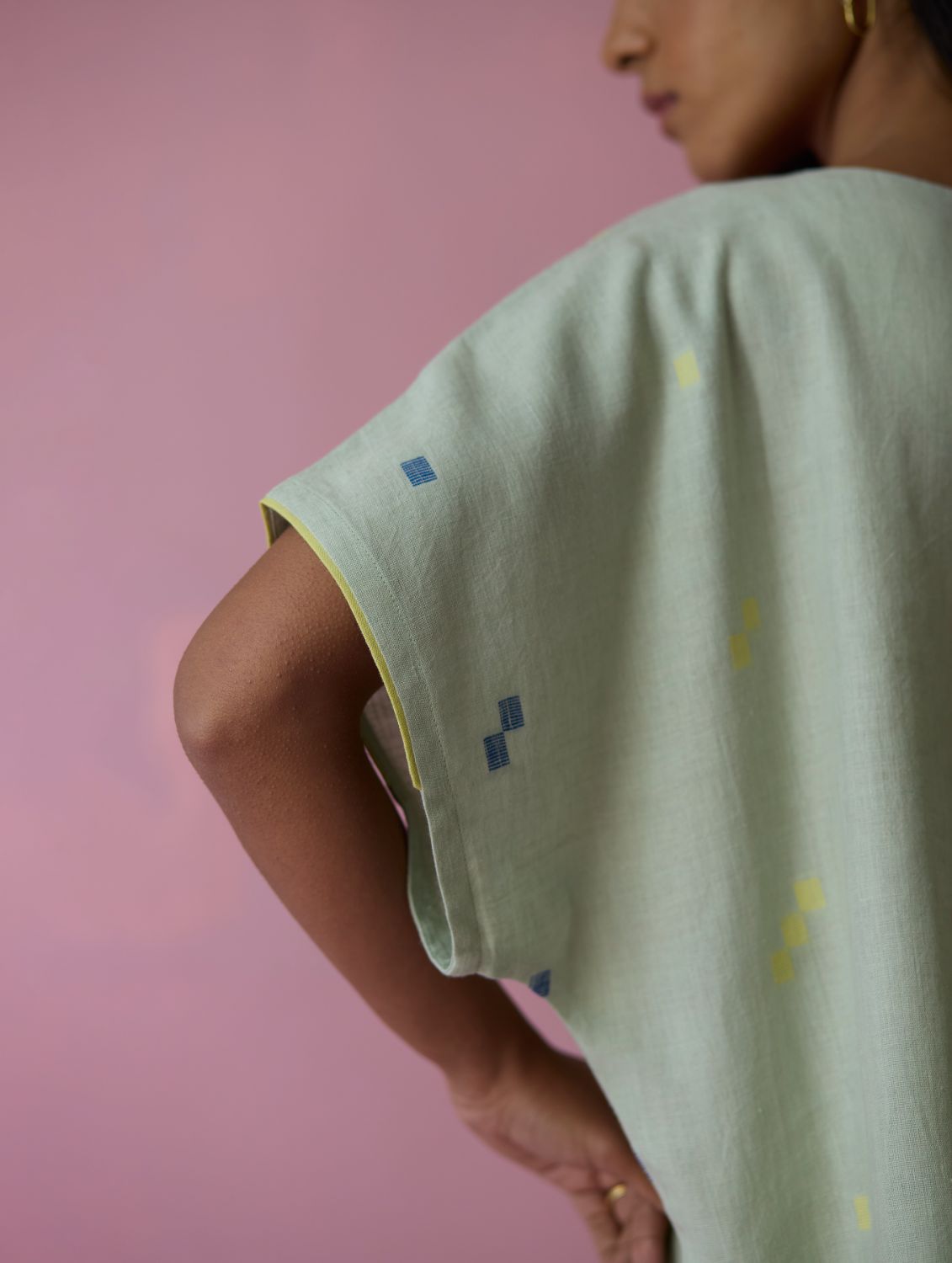 Top - The Kanni top is thoughtfully crafted in our handwoven soft jamdani linen weave with a distinctive varying 4-colour square motif weave pattern. Designed with a boat neckline and a relaxed silhouette, the Kanni has colourful and intricate french knot embroidery delicately scattered across the jamdani motifs in multiple colours. The top is finished with an uneven side slit for movement and flow, while a woven selvedge edging at the sleeve hem adds a contrast. A timeless breathable piece designed for effortless everyday wear.