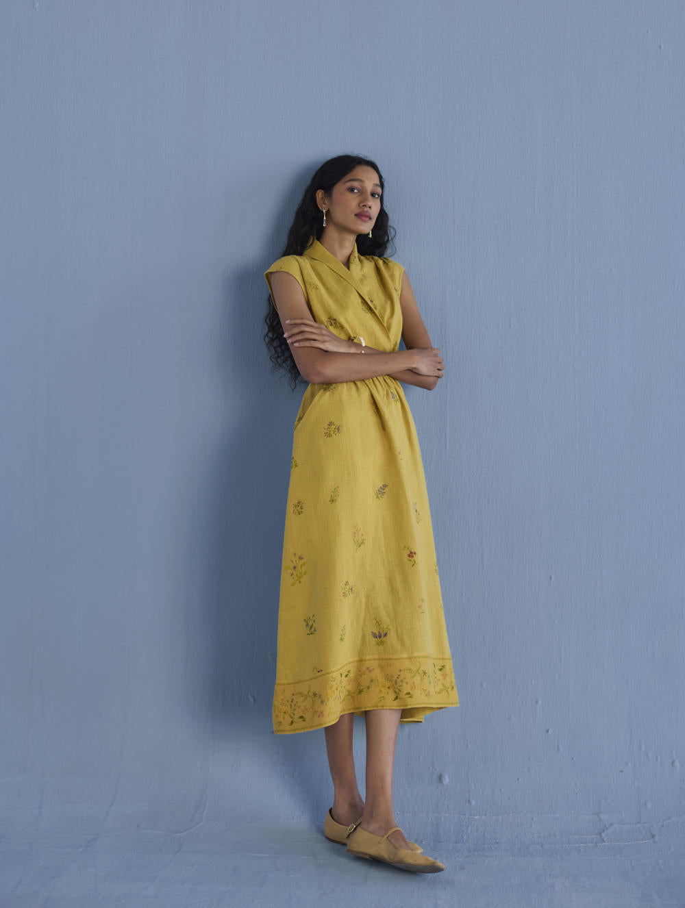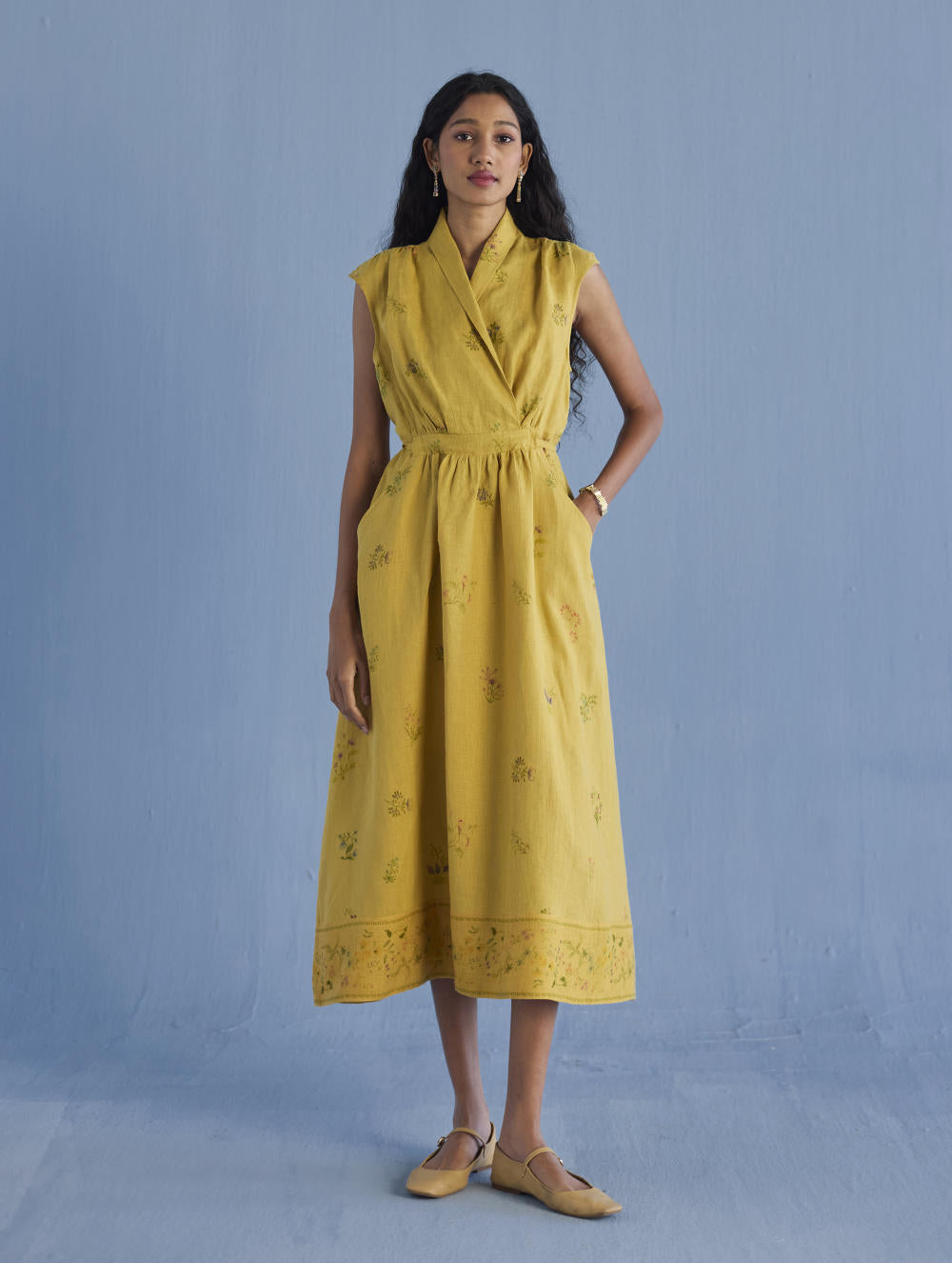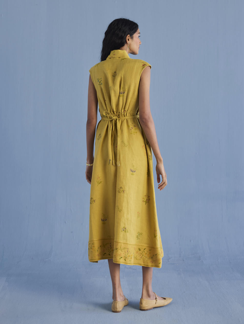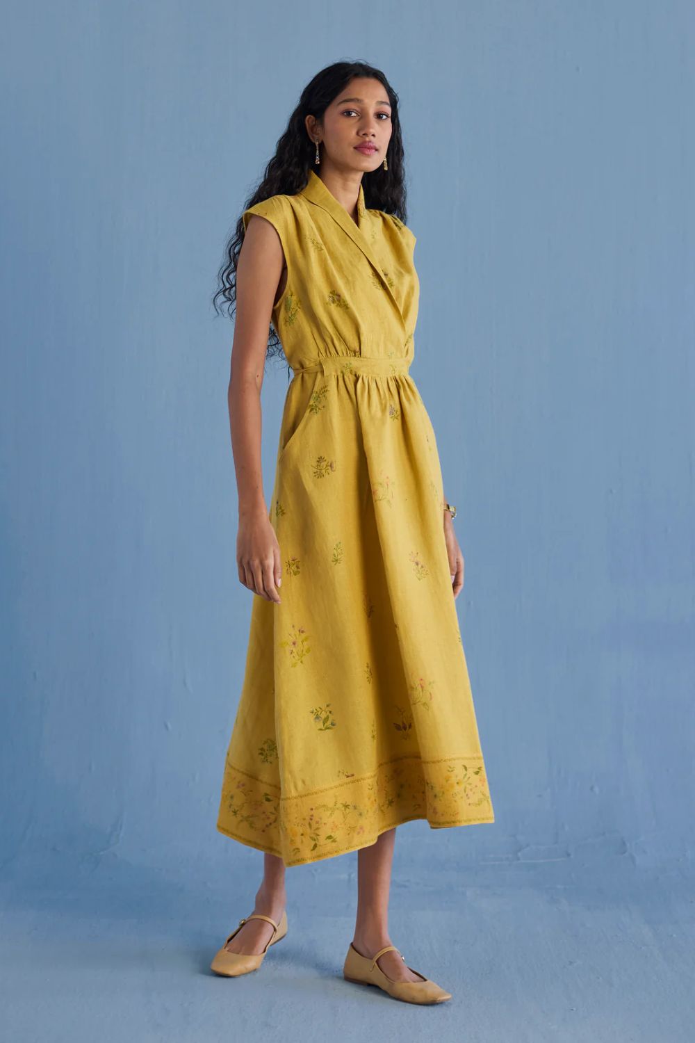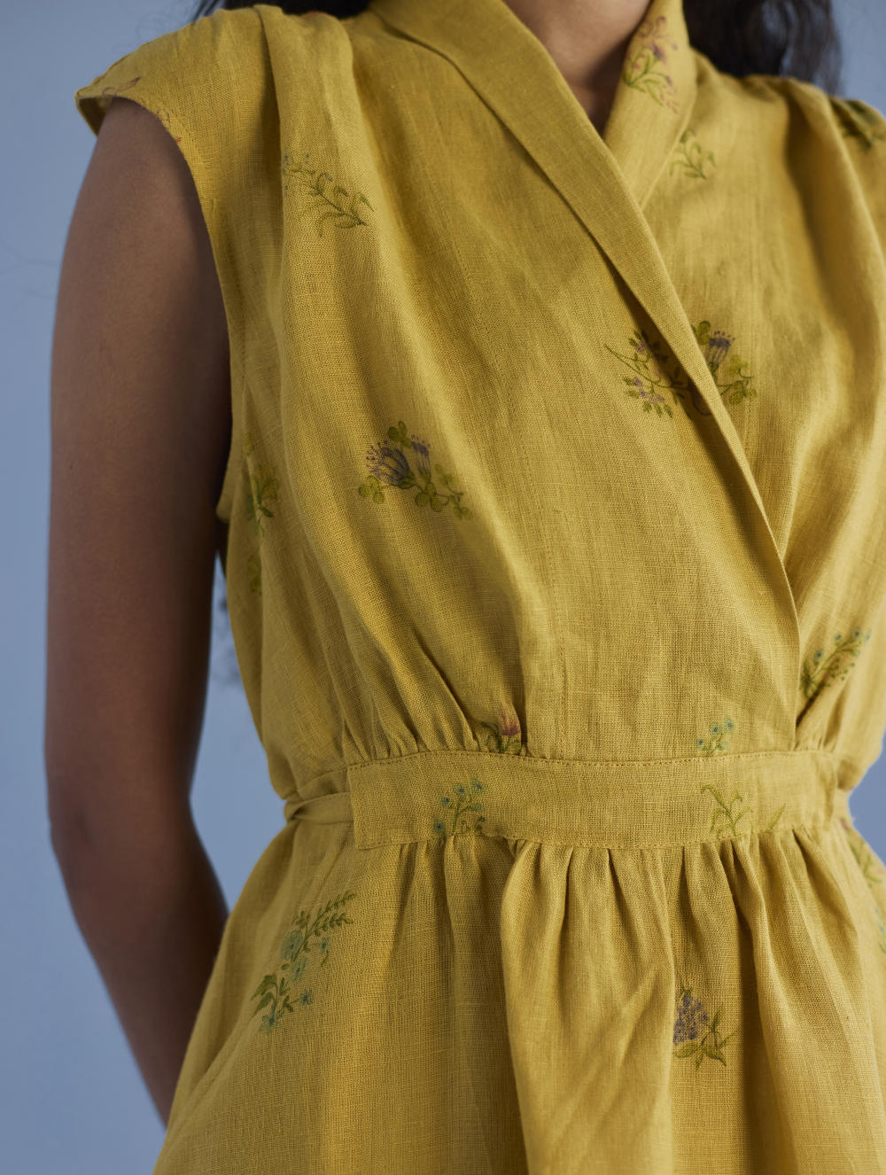 Our favourite contemporary shawl collar midi dress is handcrafted from our signature yarn-dyed linen printed with a hand-painted floral print. Gathered thoughtfully at the waist, the Mema Dress is finished with a printed sheer linen border at hem, pockets and has hand-embroidered bead detailing on the linen fabric belt. We love the Mema dress for it's versatility and it is one of our favourites to dress down or up.