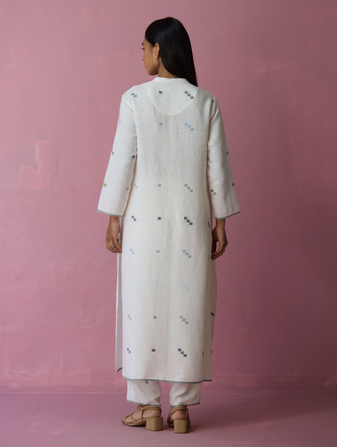 Kurta - The Miel shirt kurta is designed in our soft handloom jamdani linen with 4-colour square motifs repeating in a 1-2-3 pattern. The Miel has a classic mandarin collar, pockets, a clean button-down front with mother-of-pearl buttons and intricate textural multi-colour french knot embroidery. The sleeve hems and bottom hemline are finished with contrast woven selvedge accents. Miel is a craft-forward shirt kurta that is wearable across seasons.