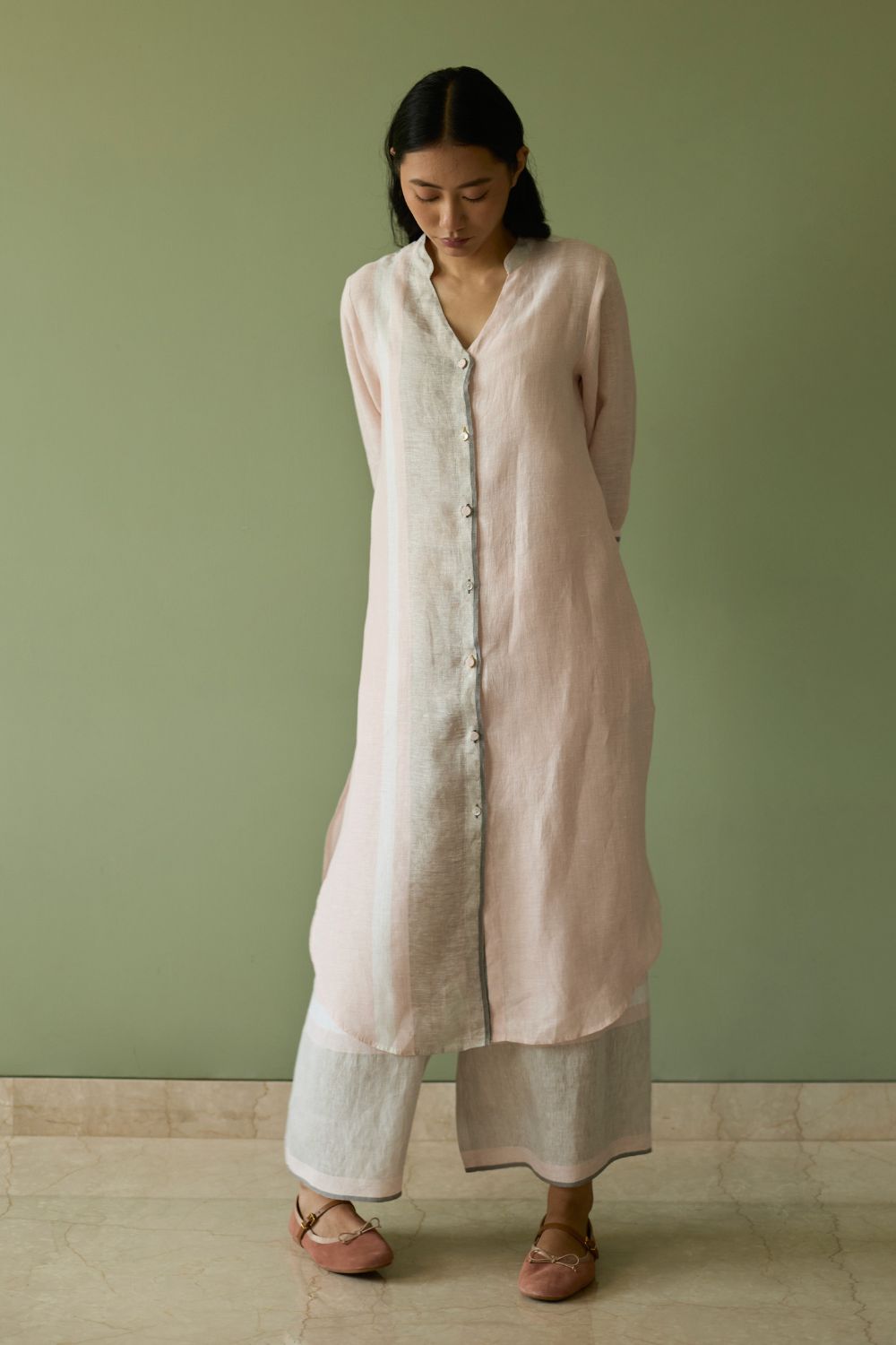 A V-neck shirt kurta is crafted from our signature soft handwoven metallic border linen, A subtle grey woven selvedge traces the silhouette along the placket, back and 3/4th sleeve hems. The Mori has comfortable pockets and is finished with a blend of of linen fabric and mother-of-pearl buttons.