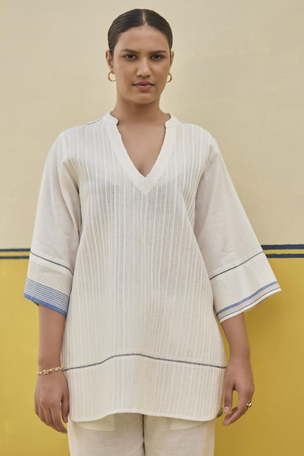 A v-neck tunic top with fine hand-stitched pintucks of varying width handcrafted in our soft handloom linen cotton with self-woven stripe borders; the top is intricately finished with hand stitched jaali detailing.