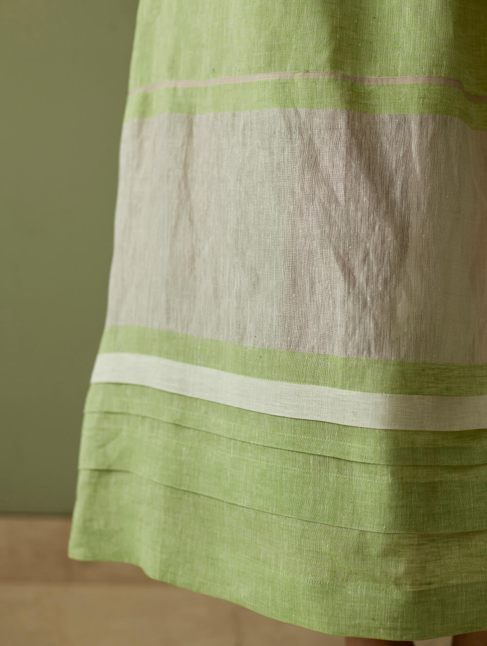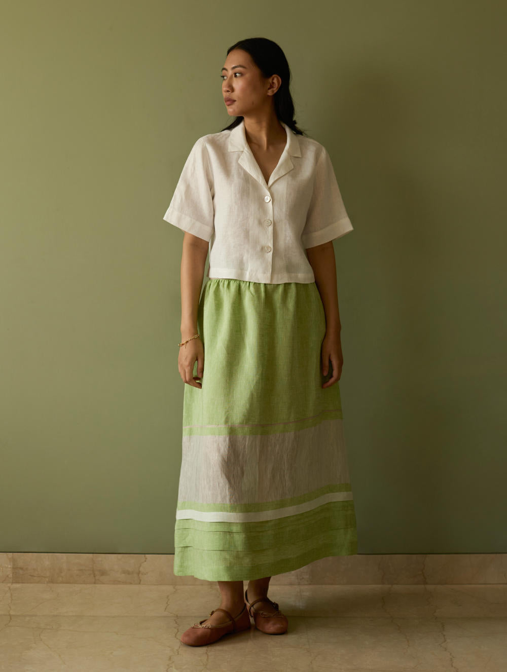 This effortlessly flowing A-line skirt is crafted from our signature handwoven metallic border linen, softly accented with a subtle grey selvedge. Thoughtfully placed metallic borders frame the silhouette, while uneven pleat detailing at the hem adds gentle volume and texture. Designed with everyday ease in mind, it features a back-elasticated waistband and functional side pockets. A refined essential that beautifully balances craftsmanship, comfort, and timeless elegance.