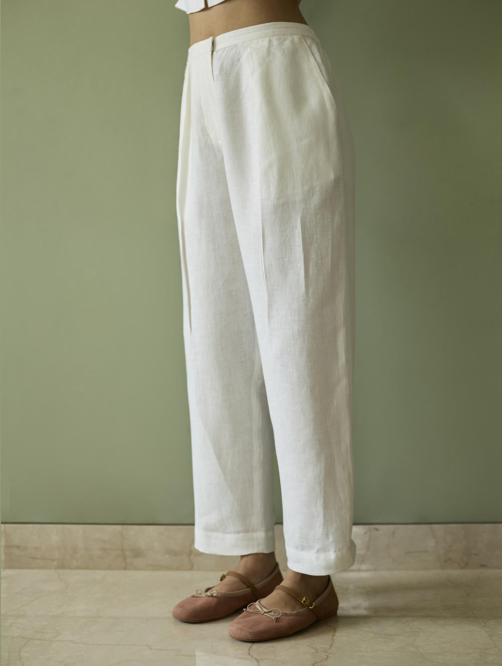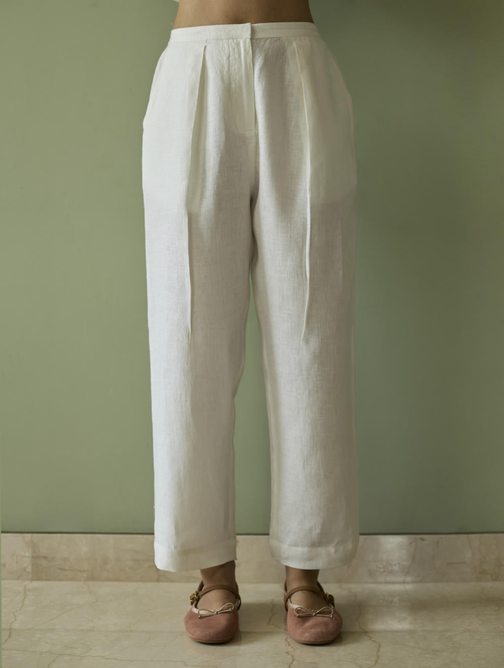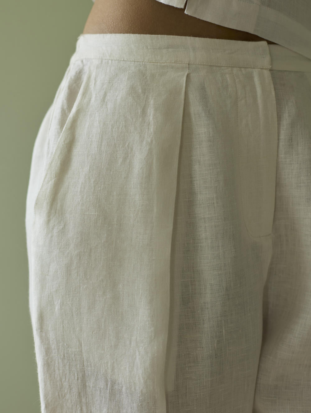 This relaxed tailored pleated pants is crafted in our handwoven ivory linen with a front zipper, hook opening, pockets, an elasticated back waistband for comfortable fit.