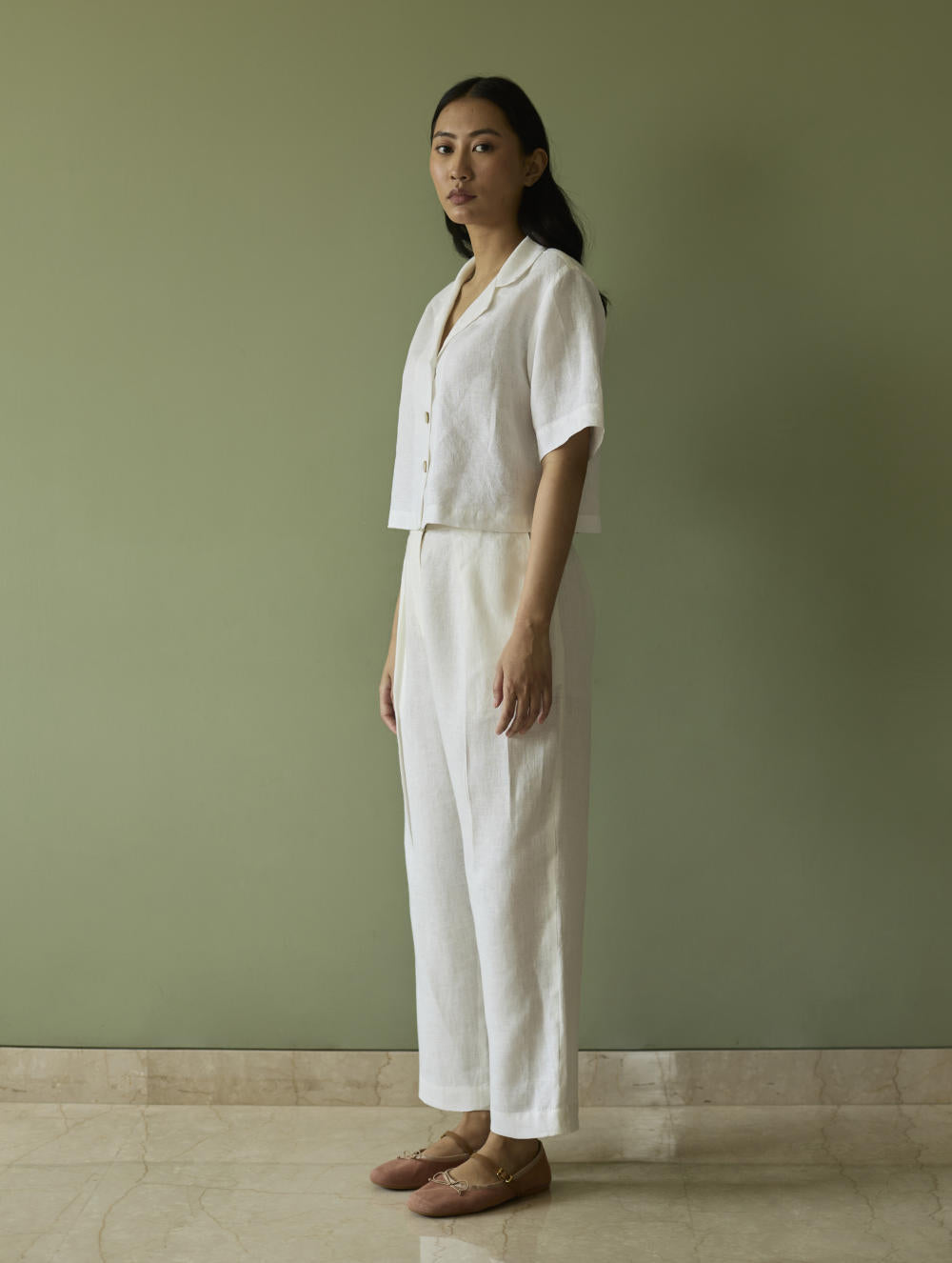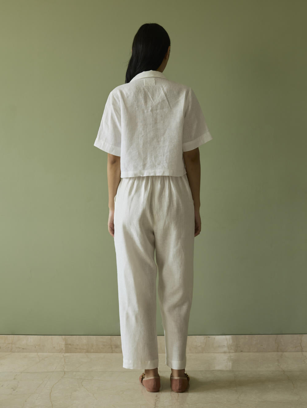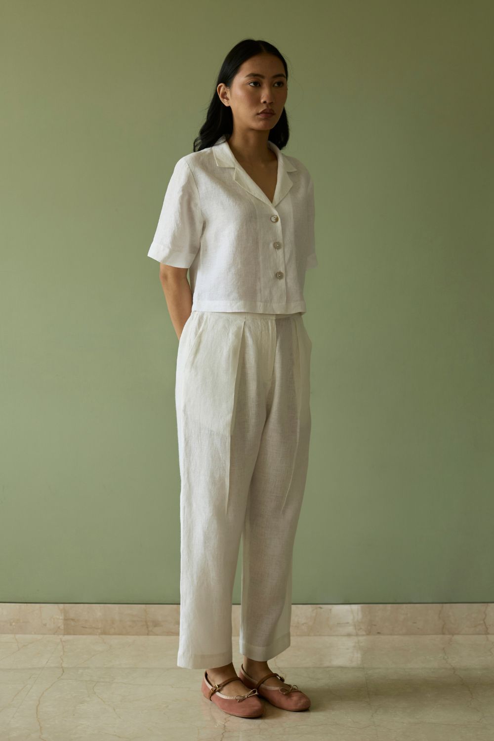 This relaxed tailored pleated pants is crafted in our handwoven ivory linen with a front zipper, hook opening, pockets, an elasticated back waistband for comfortable fit.
